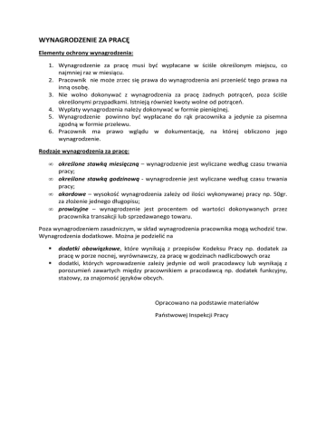 WYNAGRODZENIE ZA PRACĘ Elementy ochrony wynagrodzenia: 1. Wynagrodzenie za pracę musi być wypłacane w ściśle określonym miejscu, co najmniej raz w miesiącu. 2. Pracownik nie może zrzec się prawa do wynagrodzenia ani przenieść tego prawa na inną osobę. 3. Nie wolno dokonywać z wynagrodzenia za pracę żadnych potrąceń, poza ściśle określonymi przypadkami. Istnieją również kwoty wolne od potrąceń. 4. Wypłaty wynagrodzenia należy dokonywać w formie pieniężnej. 5. Wynagrodzenie powinno być wypłacane do rąk pracownika a jedynie za pisemna zgodną w formie przelewu. 6. Pracownik ma prawo wglądu w dokumentację, na której obliczono jego wynagrodzenie. Rodzaje wynagrodzenia za pracę: • • • • określone stawką miesięczną – wynagrodzenie jest wyliczane według czasu trwania pracy; określone stawką godzinową - wynagrodzenie jest wyliczane według czasu trwania pracy; akordowe – wysokość wynagrodzenia zależy od ilości wykonywanej pracy np. 50gr. za złożenie jednego długopisu; prowizyjne – wynagrodzenie jest procentem od wartości dokonywanych przez pracownika transakcji lub sprzedawanego towaru. Poza wynagrodzeniem zasadniczym, w skład wynagrodzenia pracownika mogą wchodzić tzw. Wynagrodzenia dodatkowe. Można je podzielić na dodatki obowiązkowe, które wynikają z przepisów Kodeksu Pracy np. dodatek za pracę w porze nocnej, wyrównawczy, za pracę w godzinach nadliczbowych oraz dodatki, których wprowadzenie zależy jedynie od woli pracodawcy lub wynikają z porozumień zawartych między pracownikiem a pracodawcą np. dodatek funkcyjny, stażowy, za znajomość języków obcych. Opracowano na podstawie materiałów Państwowej Inspekcji Pracy