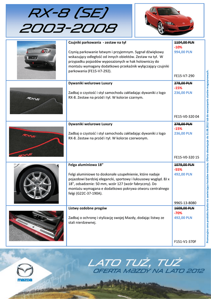 Czujniki parkowania ‐ zestaw na tył Czynią parkowanie łatwym i przyjemnym. Sygnał dźwiękowy wskazujący odległość od innych obiektów. Zestaw na tył. W przypadku pojazdów wyposażonych w hak holowniczy do montażu wymagany dodatkowo przekaźnik wyłączający czujniki parkowania (FE15‐V7‐292). 1104,00 PLN ‐10% 994,00 PLN FE15‐V7‐290 Dywaniki welurowe Luxury Zadbaj o czystość i styl samochodu zakładając dywaniki z logo RX‐8. Zestaw na przód i tył. W kolorze czarnym. 278,00 PLN ‐15% 236,00 PLN FE15‐V0‐320 04 Dywaniki welurowe Luxury Zadbaj o czystość i styl samochodu zakładając dywaniki z logo RX‐8. Zestaw na przód i tył. W kolorze czerwonym. 278,00 PLN ‐15% 236,00 PLN FE15‐V0‐320 15 Felga aluminiowa 18” Felgi aluminiowe to doskonałe uzupełnienie, które nadaje pojazdowi bardziej elegancki, sportowy i luksusowy wygląd. 8J x 18", odsadzenie: 50 mm, wzór 127 (wzór fabryczny). Do montażu wymagana e dodatkowo pokrywa otworu centralnego felgi (G22C‐37‐190A). 1079,00 PLN ‐55% 492,00 PLN 9965‐13‐8080 1609,00 PLN ‐70% 492,00 PLN F151‐V1‐370F Listwy ozdobne progów Zadbaj o ochronę i stylizację swojej Mazdy, dodając listwy ze stali nierdzewnej. Promocyjna cena produktu brutto nie zawierająca kosztów montażu. Oferta obowiązuje do 31.08.2012 lub do wyczerpania stanów magazynowych. Rx-8 (se) 2003-2008 Rx-8 (se) 2003-2008 Hak holowniczy odczepiany Rzeczy zbyt duże lub zbyt ciężkie do przewozu samochodem możesz przewieźć na przyczepie. Teoretyczna siła odniesienia działająca na hak (wartość D): 7.8 kN, maksymalny nacisk pionowy na kulę haka: 75 kg. Do montażu wymagana dodatkowo wiązka elektryczna haka holowniczego. Nie stosować z zestawem obniżającym zawieszenie. W przypadku pojazdów wyposażonych w czujniki parkowania do montażu wymagany dodatkowo przekaźnik wyłączający czujniki parkowania ( FE15‐V7‐292). Wiązka elektryczna haka holowniczego 7 pin Ze skrzynką przekaźnikową C2. Wiązka elektryczna haka holowniczego 7 pin Bez skrzynki przekaźnikowej C2. 2238,00 PLN ‐20% 1790,00 PLN FF37‐V3‐920 341,00 PLN ‐15% 290,00 PLN FE19‐V3‐921 212,00 PLN ‐20% 170,00 PLN FE15‐V3‐921 Wiązka elektryczna haka holowniczego 13 pin Ze skrzynką przekaźnikową C2. 487,00 PLN ‐15% 414,00 PLN FE20‐V3‐921 Wiązka elektryczna haka holowniczego 13 pin Bez skrzynki przekaźnikowej C2. 279,00 PLN ‐15% 237,00 PLN FE16‐V3‐921