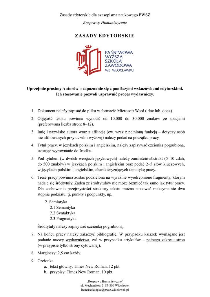 Zasady edytorskie dla czasopisma naukowego PWSZ Rozprawy Humanistyczne ZASADY EDYTORSKIE Uprzejmie prosimy Autorów o zapoznanie się z poniższymi wskazówkami edytorskimi. Ich stosowanie pozwoli usprawnić proces wydawniczy. 1. Dokument należy zapisać do pliku w formacie Microsoft Word (.doc lub .docx). 2. Objętość tekstu powinna wynosić od 10.000 do 30.000 znaków ze spacjami (preferowana liczba stron: 8–12). 3. Imię i nazwisko autora wraz z afiliacją (ew. wraz z pełnioną funkcją – dotyczy osób nie afiliowanych przy uczelni wyższej) należy podać na początku pracy. 4. Tytuł pracy, w językach polskim i angielskim, należy zapisywać czcionką pogrubioną, stosując wyrównanie do środka. 5. Pod tytułem (w dwóch wersjach językowych) należy zamieścić abstrakt (5–10 zdań, do 500 znaków) w językach polskim i angielskim oraz podać 2–5 słów kluczowych, w językach polskim i angielskim, charakteryzujących tematykę pracy. 6. Treść pracy powinna zostać podzielona na wyraźnie wyodrębnione fragmenty, którym nadaje się śródtytuły. Żaden ze śródtytułów nie może brzmieć tak samo jak tytuł pracy. Dla zachowania przejrzystości struktury tekstu można stosować maksymalnie dwa stopnie podziału, tj. punkty i podpunkty, np. 2. Semiotyka 2.1 Semantyka 2.2 Syntaktyka 2.3 Pragmatyka Śródtytuły należy zapisywać czcionką pogrubioną. 7. Na końcu pracy należy załączyć bibliografię. W przypadku książek wymagane jest podanie nazwy wydawnictwa, zaś w przypadku artykułów – pełnego zakresu stron (w przypisie tylko strony cytowanej). 8. Marginesy: 2,5 cm każdy. 9. Czcionka a. tekst główny: Times New Roman, 12 pkt b. przypisy: Times New Roman, 10 pkt. „Rozprawy Humanistyczne” ul. Mechaników 3, 87-800 Włocławek [email protected] Zasady edytorskie dla czasopisma naukowego PWSZ Rozprawy Humanistyczne 10. Zwroty obcojęzyczne należy zapisywać kursywą. W treści pracy nie należy stosować podkreśleń, ani żadnego specjalnego formatowania tekstu. 11. Interlinia a. tekst główny: 1,5 b. przypisy: 1,0. 12. Wcięcie akapitu: 1,25 cm. Wcięcia nie należy ustawiać za pomocą spacji, lecz przy użyciu tabulatora lub linijki. 13. Odstępy przed akapitem i po akapicie: 0 pkt. 14. Wyrównanie tekstu: do lewej i prawej strony (tekst wyjustowany). 15. Nie stosować dzielenia wyrazów, ręcznego ani automatycznego. 16. W tekście stosuje się nawiasy półokrągłe oraz cudzysłowy polskie („dotacja”). 17. Nie należy umieszczać spacji między wyrazem a znakiem interpunkcyjnym, takim jak: kropka, przecinek, dwukropek, średnik, znak zapytania, wykrzyknik. 18. Strony powinny być ponumerowane, a numer umieszczony w prawym dolnym rogu strony, czcionka Times New Roman, 12 pkt. 19. W tekście można stosować listy numerowane lub wypunktowane. W przypadku list numerowanych stosować format numeracji 1), 2), 3) itd. Dla list wypunktowanych stosować styl: a), b), c) itd. lub posługiwać się krótkim myślnikiem „-”. W przypadku list wielopoziomowych należy zachować kolejność: liczba (poziom I), litera (poziom II), krótki myślnik (poziom III), np. 1) Semiotyka a) semantyka: - relacja znaczenia, - relacja oznaczania, b) syntaktyka j.s.t. 20. Cytaty a. tekst cytowany dosłownie należy wyróżnić cudzysłowem i opatrzyć przypisem, b. w przypadku, gdy długość cytatu przekracza 4 wiersze, należy wyróżnić go w postaci bloku tekstu, zwiększając wcięcie z prawej i z lewej strony o 1 cm w stosunku do tekstu głównego oraz zmniejszyć czcionkę do 10 pkt, c. cytaty należy zapisywać pismem prostym, nie stosować kursywy. 21. Wskazywanie miejsca publikacji aktów prawnych (Dziennik Ustaw, Monitor Polski, resortowe dzienniki urzędowe etc.) – wg zasad powszechnie przyjętych. 22. Przypisy bibliograficzne a. odesłanie do książki: należy podać inicjał imienia (w przypadku inicjałów podwójnych po kropce nie stosować spacji) oraz nazwisko autora, tytuł publikacji zapisany kursywą, miejsce i rok wydania, stronę lub zakres stron „Rozprawy Humanistyczne” ul. Mechaników 3, 87-800 Włocławek [email protected] Zasady edytorskie dla czasopisma naukowego PWSZ Rozprawy Humanistyczne Przykład: G. Malinowski, Logika ogólna, Warszawa 2010, s. 114. b. odesłanie do artykułu w pracy zbiorowej Przykład: T. Ball, Władza, [w:] R. E. Goodin i F. Pettit (red.), Przewodnik po współczesnej filozofii politycznej, przeł. C. Cieśliński i. M. Poręba, Warszawa 2002, s. 699-700 c. odesłanie do artykułu w czasopiśmie: należy podać inicjał imienia i nazwisko autora, tytuł artykułu kursywą, nazwę czasopisma w cudzysłowie, rok wydania, numer, strony Przykład: M. Malia, Wielki finał, przeł. Anna M. Mydlarska, „Przegląd Polityczny” 2006, nr 79/80, s. 5-16. tytuł czasopisma należy podawać w pełnym brzmieniu, np. „Res Publica Nowa” (nie: RPN), „Państwo i Prawo” (nie: PiP) d. cytowanie ponowne: jeżeli dana praca była już cytowana w tekście, a jest to jedyna przywoływana praca określonego autora, należy podać inicjał imienia, nazwisko, początek tytułu pracy kursywą i zakończony wielokropkiem, numer strony. Przykład: A. Walicki, Zniewolony umysł…, s. 34. jeżeli kolejne cytowanie tej samej pracy danego autora następuję bezpośrednio po sobie, stosuje się zapis „Tamże”, ewentualnie z podaniem numerów stron, jeżeli różnią się od podanych w przypisie poprzedzającym Przykład: Tamże, s. 116. e. cytowanie źródeł zawartych w elektronicznych systemach informacji prawnej: jeżeli wyrok, orzeczenie organu administracji publicznej itp. znajduje się w elektronicznym systemie informacji prawnej, (Lex, Lex Polonica, Legalis), wskazać należy nazwę systemu oraz, w miarę możliwości, numer wewnętrzny dokumentu w bazie danych; Przykład: Uchwała Regionalnej Izby Obrachunkowej w Poznaniu z dnia 19 września 2012 r., 16/1179/12, Lex nr 1218308. „Rozprawy Humanistyczne” ul. 