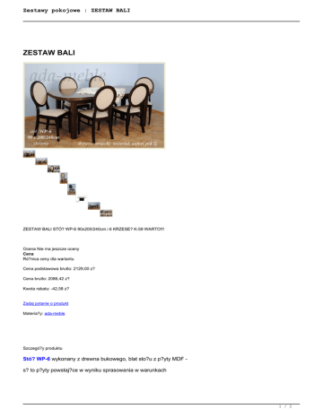 Zestawy pokojowe : ZESTAW BALI ZESTAW BALI ZESTAW BALI STÓ? WP-6 90x200/240cm i 6 KRZESE? K-59 WARTO!!! Ocena Nie ma jeszcze oceny Cena Ró?nica ceny dla wariantu Cena podstawowa brutto: 2129,00 z? Cena brutto: 2086,42 z? Kwota rabatu: -42,58 z? Zadaj pytanie o produkt Materia?y: ada-meble Szczegó?y produktu Stó? WP-6 wykonany z drewna bukowego, blat sto?u z p?yty MDF s? to p?yty powstaj?ce w wyniku sprasowania w warunkach 1 / 2 Zestawy pokojowe : ZESTAW BALI wysokiego ci?nienia i temperatury w?ókien drzewnych z dodatkiem organicznych zwi?zków ??cz?cych i utwardzaj?cych. Wysoka jako??, szerokie zastosowanie praktyczne. Blat OWAL OKLEINA NATURALNA -rozk?adany. Podstawa wykonana z drewna bukowego. Wymiary sto?u: d?ugo?? sto?u 200cm /po roz?o?eniu 240 x 90/; 1 wk?ad 40cm; szeroko?? blatu 90 / blat z MDF na ?o?yskowych prowadnicach; wysoko?? sto?u 76 cm; mo?liwo?? roz?o?enia sto?u: 2,0m; 2,4m. Krzes?o K-59 wykonane z drewna bukowego oraz sklejki wysokogatunkowej bejcy i lakieru. Istnieje mo?liwo?? wyboru tkaniny obiciowej. NOWY MODEL KRZES?A!!! KRZES?O NIEDOST?PNE W OBICIU Z EKOSKÓRY!!! Wymiary krzes?a: wysoko?? krzes?a: 99 cm; szeroko?? siedziska krzes?a: 47 cm; g??boko?? siedziska krzes?a: 41 cm; wysoko?? siedziska krzes?a: 45 cm. Recenzje Nikt jeszcze nie ocenia? tego produktu. 2 / 2 Powered by TCPDF (www.tcpdf.org)