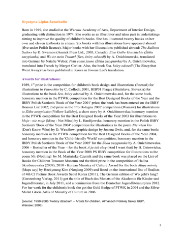 Krystyna Lipka-Sztarbałło Born in 1949, she studied at the Warsaw Academy of Arts, Department of Interior Design, graduating with distinction in 1974. She works as an illustrator and takes part in undertakings aiming to improve the quality of children's books. She has illustrated twenty books on her own and eleven textbooks in a team. Six books with her illustrations have appeared abroad (five under Polish licence). Major books with her illustrations published abroad: The Balloon Sailors by D. Swanson (Annick Press Ltd., 2003, Canada), Eine Gelbe Geschichte (Żółta zasypianka) and Wo ist mein Trauml (Sen, który odszedł) by A. Onichimowska, translated into German by Natalie Weber; Petit conte jaune (Żółta zasypianka) by A. Onichimowska, translated into French by Margot Carlier. Also, the book Sen, który odszedł (The Sleep that Went Away) has been published in Korea in Jiwone Lee's translation. Awards for illustrations: 1989, 1st prize in the competition for children's book design and illustrations (Poznań) for illustrations to Pinocchio by C. Collodi; 2001, BIB'01 Plaque (Bratislava, Slovakia) for illustrations to the book Sen, który odszedł by A. Onichimowska and, for the same book, honorary mention in the PTWK competition for the Best Designed Books of the Year and the IBBY Polish Section's 'Book of the Year 2001' prize; the book has been entered on the IBBY Honour List 2002; 2nd prize in the 'Pro Bologna 2002' competition (Warsaw) for illustrations to Żółta zasypianka (Yellow Lullaby), a short story by A. Onichimowska; honorary mention in the PTWK competition for the Best Designed Books of the Year 2003 for illustrations to Moje - nie moje (Minę - Not Mine) by L. Bardijewska; honorary mention in the Polish IBBY Section's 'Book of the Year 2004' competition for illustrations to the poem Nie wiem kto (Don't Know Who) by D. Wawiłow, graphic design by Joanna Gwis, and, for the same book: honorary mention in the PTWK competition for the Best Designed Books of the Year 2004, and honorary mention in the 'Child-friendly World' competition; honorary mention in the IBBY Polish Section's 'Book of the Year 2005' for the Żółta zasypianka by A. Onichimowska. 2006 – Bestseller of the Year – for the book A ja tak chcę (And I want that) by B. Ostrowicka; honorary mention in the Book of the Year 2008 PS IBBY competition for illustrations to the poem Nic (Nothing) by M. Mariańska-Czernik and the same book was placed on the List of Books for Children Treasure Museum and the third prize in the competition of Halina Skrobiszewska (2009), 2010 - Korean Ministry of Culture Award for the book Mapy mówią (Maps say) by Heekyoung Kim (Nonjang 2009) and listed on the international list of finalists of 4th CJ Picture Book Awards Seoul Korea (2011). The German edition of Wo geht's lang? (Gerstenberg Verlag, 2011) got the title of Buch des Monats of the Akademie für Kinder-und Jugendliteratur, in July 2011, and a nomination from the Deutscher Jugendliteraturpreis 2012. For her work for the children's book she got the Gold Badge of PTWK in 2004 and the Silver Medal Gloria Artis of Ministry of Culture in 2006. (source: 1990-2005 Twórcy dzieciom – Artists for children, Almanach Polskiej Sekcji IBBY, Warsaw: 2006) 1