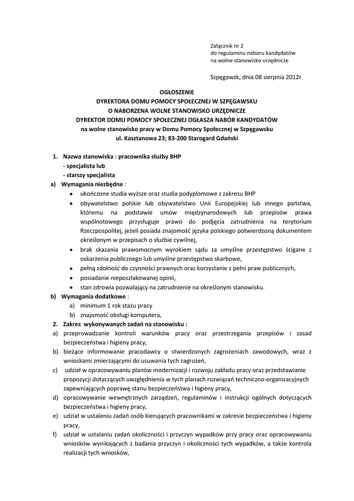 Załącznik nr 2 do regulaminu naboru kandydatów na wolne stanowisko urzędnicze Szpęgawsk, dnia 08 sierpnia 2012r OGŁOSZENIE DYREKTORA DOMU POMOCY SPOŁECZNEJ W SZPĘGAWSKU O NABORZENA WOLNE STANOWISKO URZĘDNICZE DYREKTOR DOMU POMOCY SPOŁECZNEJ OGŁASZA NABÓR KANDYDATÓW na wolne stanowisko pracy w Domu Pomocy Społecznej w Szpęgawsku ul. Kasztanowa 23; 83-200 Starogard Gdański 1. Nazwa stanowiska : pracownika służby BHP - specjalista lub - starszy specjalista a) Wymagania niezbędne : ukończone studia wyższe oraz studia podyplomowe z zakresu BHP obywatelstwo polskie lub obywatelstwo Unii Europejskiej lub innego państwa, któremu na podstawie umów międzynarodowych lub przepisów prawa wspólnotowego przysługuje prawo do podjęcia zatrudnienia na terytorium Rzeczpospolitej, jeżeli posiada znajomość języka polskiego potwierdzoną dokumentem określonym w przepisach o służbie cywilnej, brak skazania prawomocnym wyrokiem sądu za umyślne przestępstwo ścigane z oskarżenia publicznego lub umyślne przestępstwo skarbowe, pełną zdolność do czynności prawnych oraz korzystanie z pełni praw publicznych, posiadanie nieposzlakowanej opinii, stan zdrowia pozwalający na zatrudnienie na określonym stanowisku. b) Wymagania dodatkowe : a) minimum 1 rok stażu pracy b) znajomość obsługi komputera, 2. Zakres wykonywanych zadań na stanowisku : a) przeprowadzanie kontroli warunków pracy oraz przestrzegania przepisów i zasad bezpieczeństwa i higieny pracy, b) bieżące informowanie pracodawcy o stwierdzonych zagrożeniach zawodowych, wraz z wnioskami zmierzającymi do usuwania tych zagrożeń, c) udział w opracowywaniu planów modernizacji i rozwoju zakładu pracy oraz przedstawianie propozycji dotyczących uwzględnienia w tych planach rozwiązań techniczno-organizacyjnych zapewniających poprawę stanu bezpieczeństwa i higieny pracy, d) opracowywanie wewnętrznych zarządzeń, regulaminów i instrukcji ogólnych dotyczących bezpieczeństwa i higieny pracy, e) udział w ustaleniu zadań osób kierujących pracownikami w zakresie bezpieczeństwa i higieny pracy, f) udział w ustalaniu zadań okoliczności i przyczyn wypadków przy pracy oraz opracowywaniu wniosków wynikających z badania przyczyn i okoliczności tych wypadków, a także kontrola realizacji tych wniosków, g) prowadzenie rejestrów, kompletowanie i przechowywanie dokumentów dotyczących wypadków przy pracy, h) szkolenia wstępne pracowników, i) udział w dokonywaniu oceny ryzyka zawodowego i biologicznego, które wiążą się z wykonywana pracą, j) współpraca z właściwymi komórkami organizacyjnymi w zakresie organizowania i zapewniania odpowiedniego poziomu szkoleń w dziedzinie bezpieczeństwa i higieny pracy oraz zapewniania właściwej adaptacji zawodowej nowo zatrudnionych pracowników, k) współdziałanie z lekarzem sprawującym profilaktyczną opiekę zdrowotną, nad pracownikami, a w szczególności przy organizowaniu okresowych badań lekarskich pracowników, l) specjalista BHP podlega bezpośrednio Głównemu Administratorowi 3. Informacja o wskaźniku zatrudnienia osób niepełnosprawnych w Domu Pomocy Społecznej w Szpęgawsku w miesiącu poprzedzającym datę upublicznienia ogłoszenia. W miesiącu poprzedzającym datę upublicznienia ogłoszenia wskaźnik zatrudnienia osób niepełnosprawnych w Domu Pomocy Społecznej w Szpęgawsku w rozumieniu przepisów o rehabilitacji zawodowej i społecznej oraz zatrudnieniu osób niepełnosprawnych, jest niższy niż 6 %. 4. Informacja o warunkach pracy na danym stanowisku: - praca na w ww. stanowisku nie jest narażona na występowanie szkodliwych warunków pracy, natomiast występują uciążliwe warunki pracy ( praca przy komputerze) 5. Wymagane dokumenty : a. list motywacyjny, b. kwestionariusz osoby dla osoby ubiegającej się o zatrudnienie c. życiorys-curriculum vitae wraz ze zgodą na przetwarzanie danych osobowych zgodnie z ustawą z dnia 29 sierpnia 1997r. o ochronie danych osobowych (Dz.U. z 2002r Nr 101, poz. 926 ze zm.), d. dokumenty potwierdzające posiadanie nieposzlakowanej opinii np. referencje z poprzednich zakładów pracy, miejsc odbywania stażu lub praktyk zawodowych, e. kserokopie dyplomu potwierdzającego posiadanie wykształcenia wyższego, f. oświadczenie : - oświadczenie o posiadaniu obywatelstwa polskiego, - oświadczenie o niekaralności za przestępstwo popełnione umyślnie, - oświadczenie o posiadaniu pełnej zdolności do czynności prawnych oraz o korzystaniu z pełni praw publicznych, - oświadczenie o posiadaniu odpowiedniego stanu zdrowia pozwalającego na zatrudnienie na określonym stanowisku. 6. Termin, sposób i miejsce składania dokumentów : Dokumenty należy składać w zamkniętej kopercie z podanym adresem zwrotnym i z dopiskiem „Nabór na stanowisko Główny Administrator w Domu Pomocy Społecznej” w terminie do dnia 23.08.2012r na adres : Dom Pomocy Społecznej w Szpęgawsku, ul. Kasztanowa 23, 83-200 Starogard Gd, lub osobiście w ww. terminie do godz. 1500 w sekretariacie Domu Pomocy Społecznej w Szpęgawsku, ul. Kasztanowa 23. Na kopercie oznakowanej jak wyżej pracownik sekretariatu wpisuje datę wpływu, w przypadku przesłania pocztą termin złożenia dokumentów uważa się za zachowany, jeżeli przed jego upływem nadano pismo w polskiej placówce pocztowej. 7. Dodatkowe informacje : Z regulaminem naboru kandydaci mogą zapoznać się na stronie internetowej Biuletynu Informacji Publicznej (bip.powiatstarogard.pl) Nie przyjmuje się dokumentów aplikacyjnych drogą elektroniczną. Dokumenty, które wpłyną lub zostaną doręczone do Domu Pomocy Społecznej w Szpęgawsku po ww. terminie nie będą rozpatrywane. Kandydaci spełniający wymagania formalne zostaną pisemnie poinformowani o terminie i miejscu posiedzenia Komisji, celem przeprowadzenia dalszego etapu naboru. Informacja o wynikach naboru zostanie umieszczona na stronie internetowej Biuletynu Informacji Public