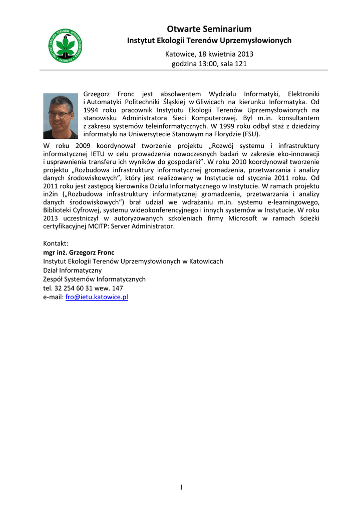Otwarte Seminarium Instytut Ekologii Terenów Uprzemysłowionych Katowice, 18 kwietnia 2013 godzina 13:00, sala 121 Grzegorz Fronc jest absolwentem Wydziału Informatyki, Elektroniki i Automatyki Politechniki Śląskiej w Gliwicach na kierunku Informatyka. Od 1994 roku pracownik Instytutu Ekologii Terenów Uprzemysłowionych na stanowisku Administratora Sieci Komputerowej. Był m.in. konsultantem z zakresu systemów teleinformatycznych. W 1999 roku odbył staż z dziedziny informatyki na Uniwersytecie Stanowym na Florydzie (FSU). W roku 2009 koordynował tworzenie projektu „Rozwój systemu i infrastruktury informatycznej IETU w celu prowadzenia nowoczesnych badań w zakresie eko-innowacji i usprawnienia transferu ich wyników do gospodarki”. W roku 2010 koordynował tworzenie projektu „Rozbudowa infrastruktury informatycznej gromadzenia, przetwarzania i analizy danych środowiskowych”, który jest realizowany w Instytucie od stycznia 2011 roku. Od 2011 roku jest zastępcą kierownika Działu Informatycznego w Instytucie. W ramach projektu in2in („Rozbudowa infrastruktury informatycznej gromadzenia, przetwarzania i analizy danych środowiskowych”) brał udział we wdrażaniu m.in. systemu e-learningowego, Biblioteki Cyfrowej, systemu wideokonferencyjnego i innych systemów w Instytucie. W roku 2013 uczestniczył w autoryzowanych szkoleniach firmy Microsoft w ramach ścieżki certyfikacyjnej MCITP: Server Administrator. Kontakt: mgr inż. Grzegorz Fronc Instytut Ekologii Terenów Uprzemysłowionych w Katowicach Dział Informatyczny Zespół Systemów Informatycznych tel. 32 254 60 31 wew. 147 e-mail: [email protected] 1