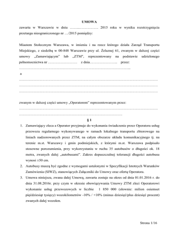 UMOWA zawarta w Warszawie w dniu ……..……………. 2015 roku w wyniku rozstrzygnięcia przetargu nieograniczonego nr …/2015 pomiędzy: Miastem Stołecznym Warszawa, w imieniu i na rzecz którego działa Zarząd Transportu Miejskiego, z siedzibą w 00-848 Warszawie przy ul. Żelaznej 61, zwanym w dalszej części umowy „Zamawiającym” lub „ZTM", pełnomocnictwa nr …………………… reprezentowany na z dnia………………….. podstawie udzielonego przez: ……………………………………………………………………………….. a …………………………………………………………………………………………………… …………………………………………………………………………………………………… …………………………………………………………………………………………………… zwanym w dalszej części umowy „Operatorem” reprezentowanym przez: …………………………………………………………………………………………………… …………………………………………………………………………. §1 1. Zamawiający zleca a Operator przyjmuje do wykonania świadczenie przez Operatora usług przewozu regularnego wykonywanego w ramach lokalnego transportu zbiorowego na liniach nadzorowanych przez ZTM, na całym obszarze układu komunikacyjnego tj. na terenie m.st. Warszawy i gmin podmiejskich, z którymi m.st. Warszawa podpisało stosowne porozumienia, przy wykorzystaniu w ruchu 35 autobusów o długości ok. 18 metra, zwanych dalej „autobusami”. Zakres dopuszczalnej tolerancji długości autobusu wynosi ±50 cm. 2. Autobusy muszą być zgodne z wymogami ustalonymi w Specyfikacji Istotnych Warunków Zamówienia (SIWZ), stanowiących Załączniki do Umowy oraz ofertą Operatora. 3. Umowa niniejsza, zwana dalej Umową, zawarta zostaje na okres od dnia 01.01.2016 r. do dnia 31.08.2016r. przy czym w okresie obowiązywania Umowy ZTM zleci Operatorowi wykonanie usług przewozowych w liczbie 1 850 000 (słownie: milion osiemset pięćdziesiąt tysięcy) wozokilometrów -10% / +10% (minus dziesięć/plus dziesięć procent) zwanych dalej wozokm. Strona 1/16 4. Wynagrodzenie Operatora za wykonywanie usług przewozowych określonych w Umowie ustala się z zastosowaniem stawki wskazanej w § 3 ust.1. Umowy zgodnej z ofertą Operatora. 5. Z zastrzeżeniem postanowień ust. 3 dopuszcza się następujące okresowe zmiany liczby autobusów w ruchu: a) w okresach spiętrzeń przewozowych (np. obchody rocznic, obsługa imprez masowych, linii cmentarnych, uruchamianie planowej komunikacji zastępczej) świadczenie usług przewozowych może być realizowane przez więcej niż 35 autobusów, z wykorzystywaniem będącego w dyspozycji Operatora taboru rezerwowego, spełniającego wymagania określone w niniejszej Umowie, b) w okresach charakteryzujących się zmniejszonym zapotrzebowaniem na usługi przewozowe (np. w okresie wakacji, ferii szkolnych, świąt, długich weekendów) strony dopuszczają możliwość świadczenia usług przewozowych przez mniej niż 35 autobusów z zachowaniem kryteriów podanych w ust. 3. 6. Decyzje w sprawie zmiany liczby autobusów w ruchu podejmowane są przez ZTM, przy czym zmiany określone w ust. 5 pkt a) wymagają uzyskania zgody Operatora. §2 1. Operator oświadcza i zobowiązuje się, że wszystkie autobusy przeznaczone przez niego do wykonywania usług będących przedmiotem niniejszej Umowy: a) spełniać będą wszystkie wymagania wynikające z postanowień Umowy SIWZ oraz przepisów obowiązującego prawa dotyczących wykonywania autobusowych usług przewozowych zbiorowej komunikacji miejskiej, b) dostosowane zostaną niezwłocznie do zmienionych wymogów w każdym przypadku zmiany przepisów określających wymagania dotyczące autobusów używanych w regularnej zbiorowej komunikacji miejskiej. 2. Warunkiem dopuszczenia do wykonywania usług wspomnianymi w ust. 1 autobusami jest uzyskanie dla każdego z nich „Certyfikatu zgodności z wymogami określonymi w SIWZ oraz w przepisach obowiązującego prawa lub w Umowie”, zwanego dalej „Certyfikatem”, wydawanym przez ZTM na podstawie weryfikacji pojazdu, przeprowadzonej przed przystąpieniem do świadczenia usług. Zamawiający zastrzega sobie powtarzanie takiej kontroli w dowolnym momencie trwania Umowy. Operator będzie zobowiązany do natychmiastowej zamiany autobusów, które nie otrzymają takiego certyfikatu, lub którym Strona 2/16 certyfikat zostanie cofnięty na takie, które będą odpowiadać wymaganiom określonym w SIWZ, obowiązujących przepisach prawa i Umowie i uzyskają wymagany certyfikat. 3. Zamawiający dopuszcza wydanie czasowego certyfikatu dla autobusu innego niż określony w ust. 1 dla celów testowych trwających nie dłużej niż 1 miesiąc w odniesieniu do jednego autobusu wprowadzonego do ruchu w danym roku realizacji Umowy. Zamawiający zastrzega sobie prawo odmowy wydania Certyfikatu bez podania przyczyn. 4. Operator przed rozpoczęciem świadczenia usług jest zobowiązany do przekazania do ZTM informacji oraz dokonywania uzgodnień z Zamawiającym w okresie od zawiadomienia o wyborze oferty do rozpoczęcia świadczenia usługi zgodnie z załącznikiem nr 2 do Umowy, w tym do: a) informacji o producencie i typie pojazdów, którymi zamierza świadczyć usługi wraz z dokumentacją techniczną potwierdzającą spełnienie przez pojazd warunków technicznych i wymogów ustalonych w SIWZ, b) wykazu pojazdów, którymi zamierza świadczyć usługi wraz z danymi identyfikującymi pojazd 5. W przypadku ujawnienia przez ZTM, że przy wykonywaniu usług stanowiących przedmiot Umowy Operator używa autobusów nie spełniających wymogów określonych w SIWZ albo w przepisach obowiązującego prawa lub w Umowie, Operator będzie zobowiązany do natychmiastowej zamiany takich autobusów na inne, zgodne z w