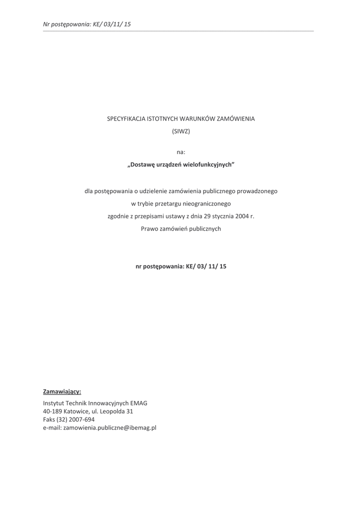 Nr postępowania: KE/ 03/11/ 15 SPECYFIKACJA ISTO TN YCH
