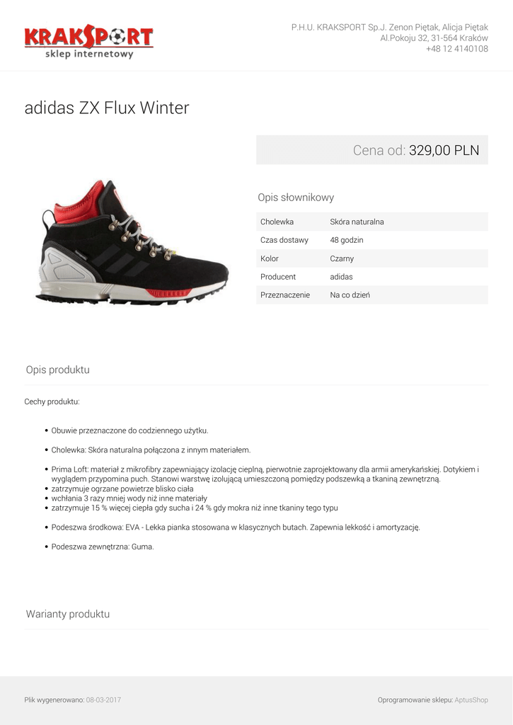 P.H.U. KRAKSPORT Sp.J. Zenon Piętak, Alicja Piętak Al.Pokoju 32, 31-564 Kraków +48 12 4140108 adidas ZX Flux Winter Cena od: 329,00 PLN Opis słownikowy Cholewka Skóra naturalna Czas dostawy 48 godzin Kolor Czarny Producent adidas Przeznaczenie Na co dzień Opis produktu Cechy produktu: Obuwie przeznaczone do codziennego użytku. Cholewka: Skóra naturalna połączona z innym materiałem. Prima Loft: materiał z mikrofibry zapewniający izolację cieplną, pierwotnie zaprojektowany dla armii amerykańskiej. Dotykiem i wyglądem przypomina puch. Stanowi warstwę izolującą umieszczoną pomiędzy podszewką a tkaniną zewnętrzną. zatrzymuje ogrzane powietrze blisko ciała wchłania 3 razy mniej wody niż inne materiały zatrzymuje 15 % więcej ciepła gdy sucha i 24 % gdy mokra niż inne tkaniny tego typu Podeszwa środkowa: EVA - Lekka pianka stosowana w klasycznych butach. Zapewnia lekkość i amortyzację. Podeszwa zewnętrzna: Guma. Warianty produktu Plik wygenerowano: 08-03-2017 Oprogramowanie sklepu: AptusShop P.H.U. KRAKSPORT Sp.J. Zenon Piętak, Alicja Piętak Al.Pokoju 32, 31-564 Kraków +48 12 4140108 46 2/3 329,00 PLN 47 1/3 389,00 PLN Galeria Plik wygenerowano: 08-03-2017 Powered by TCPDF (www.tcpdf.org) Oprogramowanie sklepu: AptusShop