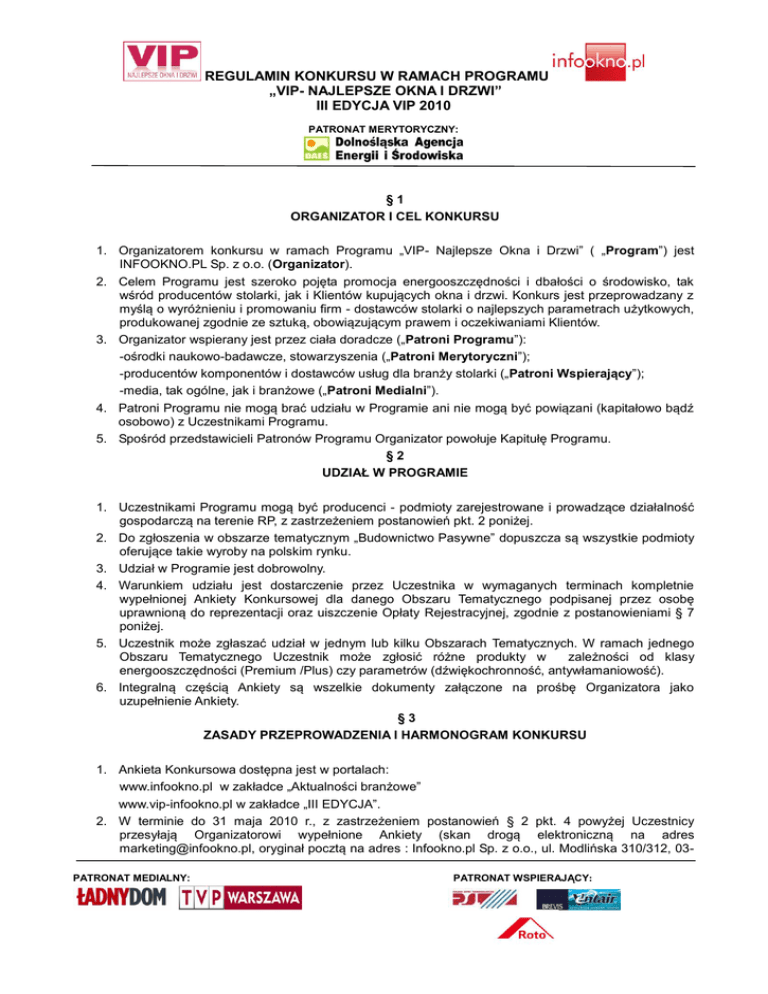 REGULAMIN KONKURSU W RAMACH PROGRAMU „VIP- NAJLEPSZE OKNA I DRZWI” III EDYCJA VIP 2010 PATRONAT MERYTORYCZNY: §1 ORGANIZATOR I CEL KONKURSU 1. Organizatorem konkursu w ramach Programu „VIP- Najlepsze Okna i Drzwi” ( „Program”) jest INFOOKNO.PL Sp. z o.o. (Organizator). 2. Celem Programu jest szeroko pojęta promocja energooszczędności i dbałości o środowisko, tak wśród producentów stolarki, jak i Klientów kupujących okna i drzwi. Konkurs jest przeprowadzany z myślą o wyróżnieniu i promowaniu firm - dostawców stolarki o najlepszych parametrach użytkowych, produkowanej zgodnie ze sztuką, obowiązującym prawem i oczekiwaniami Klientów. 3. Organizator wspierany jest przez ciała doradcze („Patroni Programu”): -ośrodki naukowo-badawcze, stowarzyszenia („Patroni Merytoryczni”); -producentów komponentów i dostawców usług dla branży stolarki („Patroni Wspierający”); -media, tak ogólne, jak i branżowe („Patroni Medialni”). 4. Patroni Programu nie mogą brać udziału w Programie ani nie mogą być powiązani (kapitałowo bądź osobowo) z Uczestnikami Programu. 5. Spośród przedstawicieli Patronów Programu Organizator powołuje Kapitułę Programu. §2 UDZIAŁ W PROGRAMIE 1. Uczestnikami Programu mogą być producenci - podmioty zarejestrowane i prowadzące działalność gospodarczą na terenie RP, z zastrzeżeniem postanowień pkt. 2 poniżej. 2. Do zgłoszenia w obszarze tematycznym „Budownictwo Pasywne” dopuszcza są wszystkie podmioty oferujące takie wyroby na polskim rynku. 3. Udział w Programie jest dobrowolny. 4. Warunkiem udziału jest dostarczenie przez Uczestnika w wymaganych terminach kompletnie wypełnionej Ankiety Konkursowej dla danego Obszaru Tematycznego podpisanej przez osobę uprawnioną do reprezentacji oraz uiszczenie Opłaty Rejestracyjnej, zgodnie z postanowieniami § 7 poniżej. 5. Uczestnik może zgłaszać udział w jednym lub kilku Obszarach Tematycznych. W ramach jednego Obszaru Tematycznego Uczestnik może zgłosić różne produkty w zależności od klasy energooszczędności (Premium /Plus) czy parametrów (dźwiękochronność, antywłamaniowość). 6. Integralną częścią Ankiety są wszelkie dokumenty załączone na prośbę Organizatora jako uzupełnienie Ankiety. §3 ZASADY PRZEPROWADZENIA I HARMONOGRAM KONKURSU 1. Ankieta Konkursowa dostępna jest w portalach: www.infookno.pl w zakładce „Aktualności branżowe” www.vip-infookno.pl w zakładce „III EDYCJA”. 2. W terminie do 31 maja 2010 r., z zastrzeżeniem postanowień § 2 pkt. 4 powyżej Uczestnicy przesyłają Organizatorowi wypełnione Ankiety (skan drogą elektroniczną na adres [email protected], oryginał pocztą na adres : Infookno.pl Sp. z o.o., ul. Modlińska 310/312, 03PATRONAT MEDIALNY: PATRONAT WSPIERAJĄCY: REGULAMIN KONKURSU W RAMACH PROGRAMU „VIP- NAJLEPSZE OKNA I DRZWI” III EDYCJA VIP 2010 PATRONAT MERYTORYCZNY: 152 Warszawa). 3. Korekta lub uzupełnienia danych zawartych w Ankiecie możliwe jest poprzez przesłanie wiadomości pocztą elektroniczną wyżej wskazany adres z tytułem „poprawka”, podaniem nazwy pola do poprawy i nowej treści oraz dopiskiem, że Uczestnik zapoznał się z regulaminem konkursu i zaakceptował jego warunki i jednocześnie wyraża zgodę na przetwarzanie i udostępnianie następujących danych osobowych: imię, nazwisko, numer telefonu, adres e-mail, zgodnie z Ustawą o ochronie danych osobowych z dnia 29 sierpnia 1997 roku (Dz. U. Nr 133, poz. 833 z późniejszymi zmianami) 4. Kapituła Programu analizuje i ocenia Ankiety na posiedzeniu tajnym. 5. W trakcie oceny Ankiet Kapituła Programu (za pośrednictwem Organizatora) może zwrócić się do Uczestnika o dostarczenie dodatkowych dokumentów/wyjaśnień. 6. Kapituła Programu sporządza protokół z posiedzenia, w którym podaje wyniki konkursu i listę Laureatów. 7. Rezultaty Programu zostaną ogłoszone w terminie do 30 czerwca 2010 w Warszawie na konferencji prasowej połączonej z uroczystością wręczenia nagród. 8. O miejscu i terminie uroczystości, o której mowa w pkt. 7 powyżej, Organizator powiadomi Uczestników z co najmniej 14-dniowym wyprzedzeniem drogą elektroniczną i/lub telefoniczną. 9. Organizator gwarantuje bezpłatne uczestnictwo w w/w uroczystości dla jednej osoby przedstawiciela Uczestnika Programu. 10. Organizator gwarantuje publikację Rezultatów Programu w portalach WWW.infookno.pl, www.vipinfookno.pl oraz w nr 8/2010 miesięcznika „Ładny Dom” a także emisję relacji z uroczystości w Telewizyjnym Kurierze Warszawskim (TVP WARSZAWA). Dodatkowo Laureaci zostaną umieszczeni w specjalnym Katalogu Firm VIP dostępnym na portalu WWW.infookno.pl. §4 KATEGORIE KONKURSOWE, LAUREACI KONKURSU 1. Uczestnicy mogą zgłaszać udział w konkursie poprzez wypełnienie odpowiednich ankiet w następujących obszarach tematycznych: Budownictwo energooszczędne: okna PVC, okna drewniane; okna aluminiowe; okna drewniano-aluminiowe; okna dachowe drewniano-aluminiowe; okna dachowe PVC - aluminiowe; drzwi zewnętrzne drewniane; drzwi zewnętrzne stalowe lub PVC bramy garażowe Budownictwo pasywne: okna PVC – domy pasywne okna drewniane – domy pasywne; okna aluminiowe – domy pasywne; okna drewniano-aluminiowe – domy pasywne; okna dachowe – domy pasywne; PATRONAT MEDIALNY: PATRONAT WSPIERAJĄCY: REGULAMIN KONKURSU W RAMACH PROGRAMU „VIP- NAJLEPSZE OKNA I DRZWI” III EDYCJA VIP 2010 PATRONAT MERYTORYCZNY: drzwi zewnętrzne – domy pasywne bramy garażowe – domy pasywne 2. Na podstawie weryfikacji nadesłanych ankiet Kapituła Programu wyłoni Laureatów i Liderów w następujących Kategoriach: Najbardziej energooszczędne okno PVC , klasa - Plus Najbardziej energooszczędne okno PVC, klasa - Premium Najbardziej energooszczędne okno drewniane, klasa - Plus Najbardziej energooszczędne okno drewniane, klasa - Premium Najbardziej energooszczędne okno drewniano-aluminiowe, klasa - Plus Najbardziej e