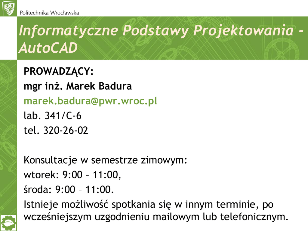 Informatyczne Podstawy Projektowania AutoCAD PROWADZĄCY: mgr inż. Marek Badura [email protected] lab. 341/C-6 tel. 320-26-02 Konsultacje w semestrze zimowym: wtorek: 9:00 – 11:00, środa: 9:00 – 11:00. Istnieje możliwość spotkania się w innym terminie, po wcześniejszym uzgodnieniu mailowym lub telefonicznym. Warunki zaliczenia Kurs składa się z 15 spotkań. Uzyskanie zaliczenia odbywa się na podstawie: • obecności na zajęciach (dopuszcza się 3 nieobecności, w tym 1 nieusprawiedliwioną), • oceny z kolokwium (przedostatnie lub ostatnie zajęcia), • ocen cząstkowych z zajęć („plusy za aktywność”). Strona IKO – pliki do zajęć Strona Instytutu Klimatyzacji i Ogrzewnictwa: www.iko.pwr.wroc.pl Informacje o konsultacjach, pliki do ściągnięcia: zakładka KONTAKTY – wyszukanie nazwiska. Strona IKO – pliki do zajęć Login: student Hasło: studklim Informacje dodatkowe Proszę założyć własny folder w folderze Student/Studenci na pulpicie. W nazwie proszę wykorzystać inicjały oraz numer indeksu. Na zajęcia proszę przynosić pendrive’y – umożliwią skopiowanie wykonanych rysunków i dalsze szkolenie w domu. Literatura: AutoCAD – POMOC – klawisz F1 w programie Tadeusz Dobrzański – „Rysunek techniczny maszynowy” Wprowadzenie do programu AutoCAD należy do rodziny produktów CAD (ang. Computer Aided Design - Komputerowe Wspomaganie Projektowania). Twórca – firma Autodesk (www.autodesk.com). Oprogramowanie AutoCAD należy do światowej czołówki rozwiązań do projektowania w dwóch i trzech wymiarach. Zmiany w najnowszych wersjach itd. Wersja studencka Legalne oprogramowanie do pobrania ze strony: www.autodesk.com/education/student-software Instrukcja pobierania i instalowania na stronie: wwwnt.if.pwr.wroc.pl/ac/ Wersja studencka Wersja studencka Podczas instalacji oprogramowania, w kroku Skonfiguruj instalację wybrać instalację narzędzi opcjonalnych Express Tools oraz dołączyć dodatki Service Pack ze strony Autodesk.com. Obszary robocze • Obszary robocze to zestawy menu, pasków narzędzi, palet i wstążek paneli sterowania pogrupowanych i zorganizowanych tak, aby można było pracować w niestandardowym zadaniowym środowisku rysowania. • Narzędzia Obszary robocze … • Ikona koła zębatego Obszar roboczy • Wersja standardowa – widoczne paski narzędzi Obszar roboczy • Wersja ze „wstążką” Paski narzędzi Przydatne paski narzędzi, wykorzystywane podczas kursu: • Rysuj • Standard • Style • Warstwy • Właściwości • Wymiar • Zmień • Zoom Obszary robocze i profile Obszary robocze współdziałają z profilami i uzupełniają oferowane przez nie możliwości sterowania rysunkiem. Obszary robocze sterują wyświetlaniem menu, pasków narzędzi i palet w obszarze rysunku. Użycie lub przełączenie obszaru roboczego oznacza zmianę wyświetlania obszaru rysunku. Profile zapisują ustawienia środowiskowe, w tym wiele opcji użytkownika, ustawień rysowania, ścieżek i innych wartości. Profilami można zarządzać w oknie dialogowym Narzędzia Opcje. Warstwy Szablon „Warstwy” W Menedżerze Właściwości Warstw utworzyć warstwy: Kontur – rodzaj linii: ciągła (Continuous), szerokość linii: 0.30 mm, kolor dowolny Kreskowa – rodzaj linii: kreskowa (np. ACAD_ISO02W100), szerokość: 0.09 mm, kolor dowolny Punktowa – rodzaj linii: punktowa (np. Dashdot), szerokość: 0.09 mm, kolor dowolny Wymiarowanie - rodzaj linii: ciągła (Continuous), szerokość: 0.09 mm, kolor dowolny Tekst - rodzaj linii: ciągła (Continuous), szerokość: 0.09 mm, kolor dowolny Plik zapisać jako SZABLON (*.dwt) – nazwa: np. „warstwy_MB.dwt”