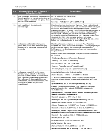 Piotr Grupiński Strona 1 z 2 L.p. Wyszczególnienie (par. 20 Załącznik 1 do Regulaminu ASO) Dane osobowe a). imię, nazwisko, zajmowane stanowisko lub funkcje pełnione w ramach emitenta oraz termin upływu kadencji, na jaką dana osoba została powołana, PIOTR KRZYSZTOF GRUPIŃSKI b). opis kwalifikacji i doświadczenia zawodowego Piotr Grupiński jest absolwentem Wydziału Prawa i Administracji na Uniwersytecie Warszawskim. Jest współautorem komentarzy do ustaw oraz autorem kilkunastu artykułów prasowych z zakresu prawa podatkowego. W latach 1997-2000 pracował jako doradca w firmach konsultingowych - Artur Andersen oraz Instytut Studiów Podatkowych. Obecnie jest głównym akcjonariuszem Internity, spółki której współzałożycielem był w 1992 roku jego ojciec - Lech Grupiński. Od 2001 roku zarządza spółkami, które były poprzednikami prawnymi Emitenta (tj. Hydrostrefa Sp. z o.o. oraz Bilmex Sp. J.), Hydrostrefa S.A. oraz Internity S.A. c). wskazanie działalności wykonywanej przez daną osobę poza emitentem, gdy działalność ta ma istotne znaczenie dla emitenta Piotr Grupiński jest powiązany ze spółkami PMJ Properties Grupiński Sp. Jawna oraz Batna Trading LTD., będącymi głównymi akcjonariuszami Internity S.A. Obie spółki są podmiotami holdingowymi i na dzień sporządzenia informacji nie prowadzą innej działalności. PREZES ZARZĄDU Kadencja - 3 lata [termin upływu 30.06.2017] Piotr Grupiński pełni następujące funkcje w pomiotach zależnych od Emitenta - Prodesigne Sp. z o.o. (Wiceprezes Zarządu) - Internity Łódź Sp.z o.o. (Prokurent) - Digital Interiors Sp. z o.o. (Prokurent) - Internity Polska Sp. z o.o. (Prezes Zarządu) - DomowyEkspert.pl Sp. zo.o. (Członek Zarządu) d). wskazanie wszystkich spółek prawa handlowego, w których, w okresie co najmniej ostatnich trzech lat, dana osoba była członkiem organów zarządzających lub nadzorczych albo wspólnikiem, ze wskazaniem, czy dana osoba nadal pełni funkcje w organach lub jest nadal wspólnikiem, Internity SA (wcześniej Hydrostrefa SA) Prezes Zarządu – od dnia 11.06.2008 roku do dziś 11.06.2008 (data rejestracji Spółki Akcyjnej; decyzja podjęta została w ramach uchwały przekształceniowej z dnia 4.03.2008 roku Hydrostrefa Sp. z o.o. (wcześniej Bilmex Sp. z o.o.) Członek Zarządu Hydrostrefa sp. z o.o. (podmiotu z którego powstała Internity SA) – od dnia 24.03.2004 roku do dnia 10.06.2008 roku PMJ Properties Grupiński Spółka Jawna (wcześniej Bilmex Wasiak i Grupiński Spółka jawna) Wspólnik- od czerwca 2005 roku do dziś Prodesigne Sp. z o.o. (wcześniej Twotherm Sp. zo.o.) Wiceprezes Zarządu od dnia 18.06.2008 do dziś Członek Zarządu - od 17.05.2007 roku do dnia 18.06.2008 roku Wspólnik od dnia 17.05.2007 roku do dnia 18.06.2008 roku Prodesigne Spółka z ograniczoną odpowiedzialnością Sp.K. (wcześniej Prodesigne Robert Niessner Spółka komandytowa) Wspólnik - Od września 2006 do 18.06.2008 roku Internity Łódź Sp. z o.o. Prokurent od dnia 22.03.2010 roku – do dziś Digital Interiors Sp. z o.o. Prokurent od dnia 11.03..2010 roku – do dziś Internity Polska Sp. z o.o. (dawniej COZA Sp. z o.o.) Piotr Grupiński L.p. Strona 2 z 2 Wyszczególnienie (par. 20 Załącznik 1 do Regulaminu ASO) Dane osobowe Prezes Zarządu od dnia 23 września 2011 – do dziś Rankomat.pl S.A. Przewodniczący Rady Nadzorczej od sierpnia 2008 do stycznia 2011; następnie członek Rady Nadzorczej do 30.06.2014 roku Konrad Juszczyk Spółka Komandytowa Wspólnik od 2007 roku do listopada 2013 roku (spółka zlikwidowana w listopadzie 2013) Grupiński Koziński Spółka Jawna Wspólnik od marca 2010 roku do dziś DomowyEkspert.pl Sp. z o.o. (obecnie zmiana nazwy na myhome.pl sp z oo) Członek Zarządu od dnia 26.10.2009 roku do dziś (spółka nie prowadziła działalności) Cottoforte Sp. z o.o. Wspólnik od dnia grudnia 2001 do dziś Wiceprezes Zarządu od grudnia 2001do dziś (spółka nigdy nie rozpoczęła działalności operacyjnej) informacje na temat prawomocnych wyroków, na mocy których dana osoba została skazana za przestępstwa oszustwa w okresie co najmniej ostatnich pięciu lat oraz wskazanie, czy w okresie co najmniej ostatnich pięciu lat osoba taka otrzymała sądowy zakaz działania jako członek organów zarządzających lub nadzorczych w spółkach prawa handlowego Pan Piotr Grupiński w okresie ostatnich pięciu lat nie został skazany za przestępstwa oszustwa. f). szczegóły wszystkich przypadków upadłości, zarządu komisarycznego lub likwidacji, w okresie co najmniej ostatnich pięciu lat, w odniesieniu do podmiotów, w których dana osoba pełniła funkcje członka organu zarządzającego lub nadzorczej W okresie ostatnich pięciu lat nie miała miejsce upadłość, zarząd komisaryczny lub likwidacja podmiotu, w którym Pan Piotr Grupiński pełnił funkcje członka organu zarządzającego lub nadzorczego. g). informacje, czy dana osoba prowadzi działalność, która jest konkurencyjna w stosunku do działalności emitenta, Piotr Grupiński pełni następujące funkcje w pomiotach zależnych od Emitenta e). Pan Piotr Grupiński w okresie ostatnich pięciu lat nie otrzymał sądowego zakazu działania jako członek organów zarządzających lub nadzorczych w spółkach prawa handlowego. - Prodesigne Sp. z o.o. (Wiceprezes Zarządu) - Internity Łódź Sp.z o.o. (Prokurent) - Digital Interiors Sp. z o.o. (Prokurent) - Internity Polska Sp. z o.o. (Prezes Zarządu) - DomowyEkspert.pl Sp. zo.o. (Członek Zarządu) h). Informację, czy dana osoba figuruje w rejestrze dłużników niewypłacalnych, prowadzonym na podstawie ustawy z dnia 20 sierpnia 1997 r. o Krajowym Rejestrze Sądowym Pan Piotr Grupiński nie figuruje w rejestrze dłużników niewypłacalnych, prowadzonym na podstawie ustawy z dnia 20 sierpnia 1997 r. o Krajowym Rejestrze Sądowym.
