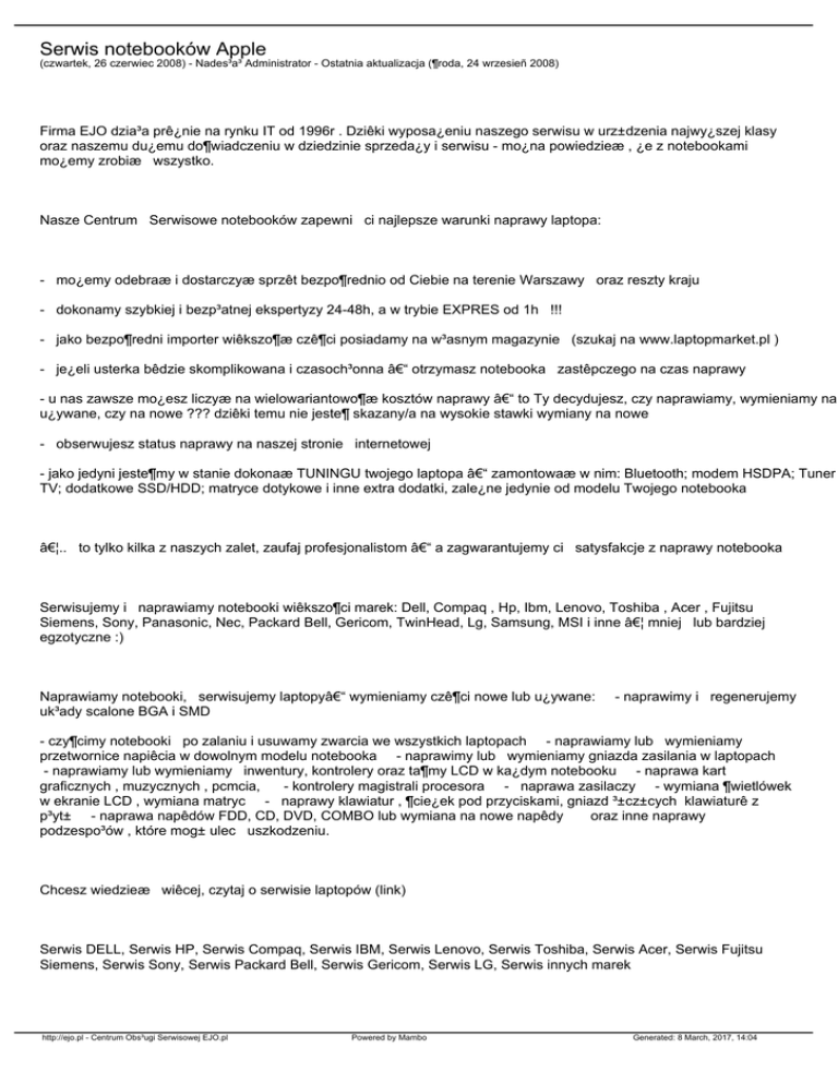 Serwis notebooków Apple (czwartek, 26 czerwiec 2008) - Nades³a³ Administrator - Ostatnia aktualizacja (¶roda, 24 wrzesieñ 2008) Firma EJO dzia³a prê¿nie na rynku IT od 1996r . Dziêki wyposa¿eniu naszego serwisu w urz±dzenia najwy¿szej klasy oraz naszemu du¿emu do¶wiadczeniu w dziedzinie sprzeda¿y i serwisu - mo¿na powiedzieæ , ¿e z notebookami mo¿emy zrobiæ wszystko. Nasze Centrum Serwisowe notebooków zapewni ci najlepsze warunki naprawy laptopa: - mo¿emy odebraæ i dostarczyæ sprzêt bezpo¶rednio od Ciebie na terenie Warszawy oraz reszty kraju - dokonamy szybkiej i bezp³atnej ekspertyzy 24-48h, a w trybie EXPRES od 1h !!! - jako bezpo¶redni importer wiêkszo¶æ czê¶ci posiadamy na w³asnym magazynie (szukaj na www.laptopmarket.pl ) - je¿eli usterka bêdzie skomplikowana i czasoch³onna – otrzymasz notebooka zastêpczego na czas naprawy - u nas zawsze mo¿esz liczyæ na wielowariantowo¶æ kosztów naprawy – to Ty decydujesz, czy naprawiamy, wymieniamy na u¿ywane, czy na nowe ??? dziêki temu nie jeste¶ skazany/a na wysokie stawki wymiany na nowe - obserwujesz status naprawy na naszej stronie internetowej - jako jedyni jeste¶my w stanie dokonaæ TUNINGU twojego laptopa – zamontowaæ w nim: Bluetooth; modem HSDPA; Tuner TV; dodatkowe SSD/HDD; matryce dotykowe i inne extra dodatki, zale¿ne jedynie od modelu Twojego notebooka ….. to tylko kilka z naszych zalet, zaufaj profesjonalistom – a zagwarantujemy ci satysfakcje z naprawy notebooka Serwisujemy i naprawiamy notebooki wiêkszo¶ci marek: Dell, Compaq , Hp, Ibm, Lenovo, Toshiba , Acer , Fujitsu Siemens, Sony, Panasonic, Nec, Packard Bell, Gericom, TwinHead, Lg, Samsung, MSI i inne … mniej lub bardziej egzotyczne :) Naprawiamy notebooki, serwisujemy laptopy– wymieniamy czê¶ci nowe lub u¿ywane: uk³ady scalone BGA i SMD - naprawimy i regenerujemy - czy¶cimy notebooki po zalaniu i usuwamy zwarcia we wszystkich laptopach - naprawiamy lub wymieniamy przetwornice napiêcia w dowolnym modelu notebooka - naprawimy lub wymieniamy gniazda zasilania w laptopach - naprawiamy lub wymieniamy inwentury, kontrolery oraz ta¶my LCD w ka¿dym notebooku - naprawa kart graficznych , muzycznych , pcmcia, - kontrolery magistrali procesora - naprawa zasilaczy - wymiana ¶wietlówek w ekranie LCD , wymiana matryc - naprawy klawiatur , ¶cie¿ek pod przyciskami, gniazd ³±cz±cych klawiaturê z p³yt± - naprawa napêdów FDD, CD, DVD, COMBO lub wymiana na nowe napêdy oraz inne naprawy podzespo³ów , które mog± ulec uszkodzeniu. Chcesz wiedzieæ wiêcej, czytaj o serwisie laptopów (link) Serwis DELL, Serwis HP, Serwis Compaq, Serwis IBM, Serwis Lenovo, Serwis Toshiba, Serwis Acer, Serwis Fujitsu Siemens, Serwis Sony, Serwis Packard Bell, Serwis Gericom, Serwis LG, Serwis innych marek http://ejo.pl - Centrum Obs³ugi Serwisowej EJO.pl Powered by Mambo Generated: 8 March, 2017, 14:04
