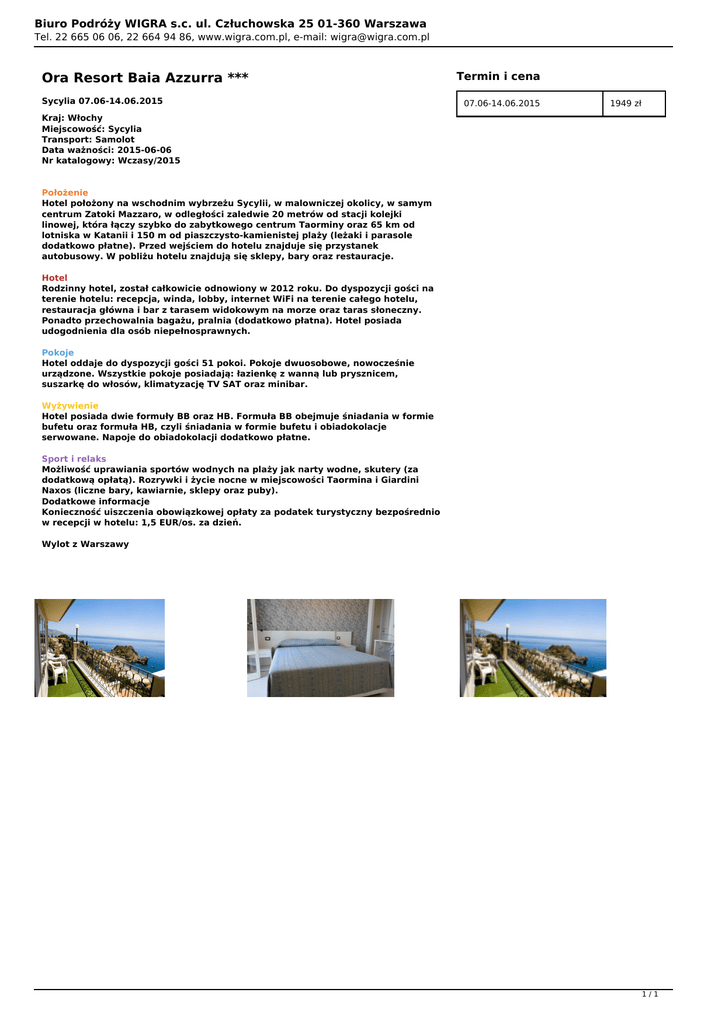 Biuro Podróży WIGRA s.c. ul. Człuchowska 25 01-360 Warszawa Tel. 22 665 06 06, 22 664 94 86, www.wigra.com.pl, e-mail: [email protected] Ora Resort Baia Azzurra *** Sycylia 07.06-14.06.2015 Termin i cena 07.06-14.06.2015 1949 zł Kraj: Włochy Miejscowość: Sycylia Transport: Samolot Data ważności: 2015-06-06 Nr katalogowy: Wczasy/2015 Położenie Hotel położony na wschodnim wybrzeżu Sycylii, w malowniczej okolicy, w samym centrum Zatoki Mazzaro, w odległości zaledwie 20 metrów od stacji kolejki linowej, która łączy szybko do zabytkowego centrum Taorminy oraz 65 km od lotniska w Katanii i 150 m od piaszczysto-kamienistej plaży (leżaki i parasole dodatkowo płatne). Przed wejściem do hotelu znajduje się przystanek autobusowy. W pobliżu hotelu znajdują się sklepy, bary oraz restauracje. Hotel Rodzinny hotel, został całkowicie odnowiony w 2012 roku. Do dyspozycji gości na terenie hotelu: recepcja, winda, lobby, internet WiFi na terenie całego hotelu, restauracja główna i bar z tarasem widokowym na morze oraz taras słoneczny. Ponadto przechowalnia bagażu, pralnia (dodatkowo płatna). Hotel posiada udogodnienia dla osób niepełnosprawnych. Pokoje Hotel oddaje do dyspozycji gości 51 pokoi. Pokoje dwuosobowe, nowocześnie urządzone. Wszystkie pokoje posiadają: łazienkę z wanną lub prysznicem, suszarkę do włosów, klimatyzację TV SAT oraz minibar. Wyżywienie Hotel posiada dwie formuły BB oraz HB. Formuła BB obejmuje śniadania w formie bufetu oraz formuła HB, czyli śniadania w formie bufetu i obiadokolacje serwowane. Napoje do obiadokolacji dodatkowo płatne. Sport i relaks Możliwość uprawiania sportów wodnych na plaży jak narty wodne, skutery (za dodatkową opłatą). Rozrywki i życie nocne w miejscowości Taormina i Giardini Naxos (liczne bary, kawiarnie, sklepy oraz puby). Dodatkowe informacje Konieczność uiszczenia obowiązkowej opłaty za podatek turystyczny bezpośrednio w recepcji w hotelu: 1,5 EUR/os. za dzień. Wylot z Warszawy 1/1 Powered by TCPDF (www.tcpdf.org)