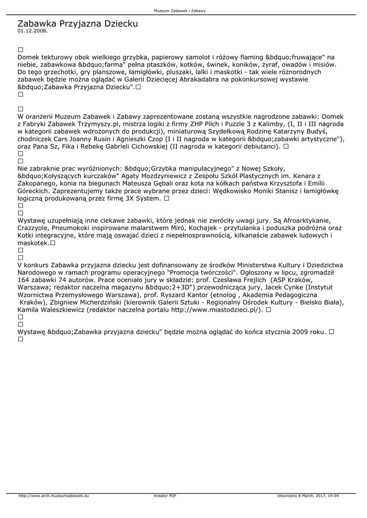 Muzeum Zabawek i Zabawy Zabawka Przyjazna Dziecku 01.12.2008. Domek tekturowy obok wielkiego grzybka, papierowy samolot i różowy flaming „fruwające" na niebie, zabawkowa „farma" pełna ptaszków, kotków, świnek, koników, żyraf, owadów i misiów. Do tego grzechotki, gry planszowe, łamigłówki, pluszaki, lalki i maskotki - tak wiele różnorodnych zabawek będzie można oglądać w Galerii Dziecięcej Abrakadabra na pokonkursowej wystawie „Zabawka Przyjazna Dziecku". W oranżerii Muzeum Zabawek i Zabawy zaprezentowane zostaną wszystkie nagrodzone zabawki: Domek z Fabryki Zabawek Trzymyszy.pl, mistrza logiki z firmy ZHP Pilch i Puzzle 3 z Kalimby, (I, II i III nagroda w kategorii zabawek wdrożonych do produkcji), miniaturową Szydełkową Rodzinę Katarzyny Budyś, chodniczek Cars Joanny Rusin i Agnieszki Czop (I i II nagroda w kategorii „zabawki artystyczne"), oraz Pana Sz, Fika i Rebekę Gabrieli Cichowskiej (II nagroda w kategorii debiutanci). Nie zabraknie prac wyróżnionych: „Grzybka manipulacyjnego" z Nowej Szkoły, „Kołyszących kurczaków" Agaty Mozdzyniewicz z Zespołu Szkół Plastycznych im. Kenara z Zakopanego, konia na biegunach Mateusza Gębali oraz kota na kółkach państwa Krzysztofa i Emilii Góreckich. Zaprezentujemy także prace wybrane przez dzieci: Wędkowisko Moniki Stanisz i łamigłówkę logiczną produkowaną przez firmę 3X System. Wystawę uzupełniają inne ciekawe zabawki, które jednak nie zwróciły uwagi jury. Są Afroarktykanie, Crazzyole, Pneumokoki inspirowane malarstwem Miró, Kochajek - przytulanka i poduszka podróżna oraz Kotki integracyjne, które mają oswajać dzieci z niepełnosprawnością, kilkanaście zabawek ludowych i maskotek. V konkurs Zabawka przyjazna dziecku jest dofinansowany ze środków Ministerstwa Kultury i Dziedzictwa Narodowego w ramach programu operacyjnego "Promocja twórczości". Ogłoszony w lipcu, zgromadził 164 zabawki 74 autorów. Prace oceniało jury w składzie: prof. Czesława Frejlich (ASP Kraków, Warszawa; redaktor naczelna magazynu „2+3D") przewodnicząca jury, Jacek Cynke (Instytut Wzornictwa Przemysłowego Warszawa), prof. Ryszard Kantor (etnolog , Akademia Pedagogiczna Kraków), Zbigniew Micherdziński (kierownik Galerii Sztuki - Regionalny Ośrodek Kultury - Bielsko Biała), Kamila Waleszkiewicz (redaktor naczelna portalu http://www.miastodzieci.pl/). Wystawę „Zabawka przyjazna dziecku" będzie można oglądać do końca stycznia 2009 roku. http://www.arch.muzeumzabawek.eu Kreator PDF Utworzono 8 March, 2017, 14:04