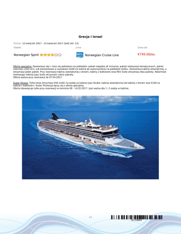 Grecja i Izrael Termin: 12 kwiecień 2017 - 23 kwiecień 2017 (ilość dni: 12) Statek: Norwegian Spirit Linia: Cena od: Norwegian Cruise Line €799.00/os. Oferta specjalna: Zarezerwuj rejs i ciesz się pakietami na pokładzie: pakiet napojów all inclusive, pakiet restauracji tematycznych, pakiet internetu (250 min.) lub kieszonkowe w wysokości $200 na kabinę do wykorzystania na pokładzie statku. Zarezerwuj kabinę wewnętrzną, a otrzymasz jeden pakiet. Przy rezerwacji kabiny zewnętrznej z oknem, kabiny z balkonem oraz Mini Suite otrzymasz dwa pakiety. Natomiast rezerwując kabinę typu Suite otrzymasz cztery pakiety . Oferta ważna przy rezerwacji do 07.04.2017. Super Okazja: Tylko teraz otrzymasz €50 zniżki na osobę za kabinę typu Studio, kabinę wewnętrzną lub kabinę z oknem oraz €100 za kabinę z balkonem i Suite! Promocja łączy się z ofertą specjalną. Oferta obowiązuje tylko przy rezerwacji w terminie 08 - 14.03.2017 i jest ważna dla 1 i 2 osoby w kabinie. 1/3 EV:44843 TRASA REJSU Data Port Wpłynięcie Wypłynięcie środa 12.04.2017 Wenecja --:-- 17:00 dzień 2 czwartek 13.04.2017 Dzień na morzu --:-- --:-- dzień 3 piątek 14.04.2017 Heraklion, Kreta 14:00 20:00 dzień 4 sobota 15.04.2017 Dzień na morzu --:-- --:-- dzień 5 niedziela 16.04.2017 Hajfa 06:00 --:-- poniedziałek 17.04.2017 Hajfa --:-- 17:00 wtorek 18.04.2017 Limassol 08:00 17:00 środa 19.04.2017 Rodos 08:00 17:00 dzień 9 czwartek 20.04.2017 Dzień na morzu --:-- --:-- dzień 10 piątek 21.04.2017 Kotor 08:00 17:00 Czarnogóra sobota 22.04.2017 09:00 17:00 Chorwacja 07:00 --:-- dzień 1 dzień 6 dzień 7 dzień 8 dzień 11 dzień 12 niedziela 23.04.2017 Włochy Grecja Izrael Izrael Cypr Grecja Split Wenecja Włochy CENNIK 2/3 EV:44843 Legenda Cena katalogowa Kabina wewnętrzna od €799.00 Kabina zewnętrzna z oknem od €889.00 Kabina zewnętrzna z balkonem od €1 529.00 Suite (apartament) od €3 839.00 Kabina jednoosobowa na zapytanie 3 i 4 osoba dorosła w kabinie na zapytanie dziecko od 2 do 17 lat jako 3 i 4 osoba w kabinie na zapytanie dziecko od 0 do 2 lat jako 3 i 4 osoba w kabinie na zapytanie Opłaty portowe Cena promocyjna w cenie Uwaga! Ceny za osobę w kabinie dwuosobowej. Cena zawiera: zakwaterowanie w kabinie wybranej kategorii; wyżywienie - 3 główne posiłki, przekąski między posiłkami, bufet lub przekąski o północy; napoje serwowane do śniadania i w bufetach samoobsługowych; serwis bagażowy podczas wejścia i zejścia ze statku; serwis kabinowy; korzystanie ze wszystkich urządzeń sportowo - rekreacyjnych znajdujących się na pokładzie statku (basen, jacuzzi, sala fitness, itp.); udział we wszystkich imprezach organizowanych na statku (przedstawienia w teatrze, koncerty, programy animacyjne itp.). Cena nie zawiera: kosztów dojazdu do portu; ewentualnych noclegów w hotelu przed/po rejsie i transferów; wycieczek fakultatywnych w trakcie rejsu; korzystania z barów, mini baru w kabinie oraz napojów zamawianych w restauracji; korzystania z punktów usługowych (fryzjer, pralnia, fotograf, salon piękności i odnowy biologicznej, internet) i wydatków osobistych; napiwków dla obsługi na statku (kwota uzależniona od długości rejsu); ubezpieczenia KL, NNW i bagaż, kosztów wiz (tam gdzie wymagane). 3/3 EV:44843