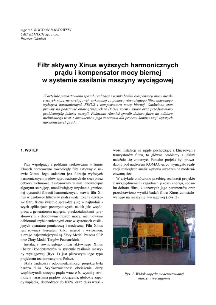 mgr inż. BOGDAN BAŁKOWSKI C&T ELMECH Sp. z o.o. Pruszcz Gdański Filtr aktywny Xinus wyższych harmonicznych prądu i kompensator mocy biernej w systemie zasilania maszyny wyciągowej W artykule przedstawiono sposób realizacji i wyniki badań kompensacji mocy nieaktywnych maszyny wyciągowej, wykonanej za pomocą równoległego filtru aktywnego wyższych harmonicznych XINUS i kompensatora mocy biernej. Omówiono stan prawny na podstawie obowiązujących w Polsce norm i ustaw oraz przedstawiono problematykę jakości energii. Pokazano również sposób doboru filtru do odbioru nieliniowego wraz z omówieniem jego znaczenia dla procesu kompensacji wyższych harmonicznych prądu. 1. WSTĘP Przy współpracy z polskimi naukowcami w firmie Elmech opracowano równoległy filtr aktywny o nazwie Xinus. Jego zadaniem jest filtracja wyższych harmonicznych prądów wprowadzanych do sieci przez odbiory nieliniowe. Zastosowany w nim innowacyjny algorytm sterujący, umożliwiający uzyskanie granicznej dynamiki filtracji harmonicznych, stawia filtr Xinus w czołówce filtrów w skali świata. Cechy użytkowe filtru Xinus świetnie sprawdzają się w najtrudniejszych aplikacjach przemysłowych, takich jak: współpraca z generatorem napięcia, przekształtnikami tyrystorowymi i diodowymi dużych mocy, nieliniowymi odbiorami szybkozmiennymi oraz w systemach zasilających aparaturę pomiarową i medyczną. Filtr Xinus jest również laureatem kilku nagród i wyróżnień, z czego najcenniejszymi są Złoty Medal Prezesa SEP oraz Złoty Medal Targów Poznańskich. Instalacja równoległego filtru aktywnego Xinus i baterii kondensatorów w systemie zasilania maszyny wyciągowej (Rys. 1) jest pierwszym tego typu projektem realizowanym w Polsce. Skala trudności i odpowiedzialności projektu była bardzo duża. Szybkozmienność obciążenia, duży współczynnik szczytu prądu wraz z b. wysoką stromością narastania prądów obciążenia, głębokie zapady napięcia, dochodzące do 100% oraz duża wrażli- wość instalacji na ripple pochodzące z kluczowania tranzystorów filtru, to główne problemy z jakimi należało się zmierzyć. Ponadto projekt był prowadzony pod nadzorem KOMAG-u, co wymagało realizacji rozległych analiz wpływu urządzeń na modernizowaną sieć. W artykule omówiono przebieg realizacji projektu z uwzględnieniem zagadnień jakości energii, sposobu doboru filtru, kluczowych jego parametrów oraz przedstawiono wyniki badań filtru Xinus zainstalowanego na maszynie wyciągowej (Rys. 2). Rys. 1. Widok napędu modernizowanej maszyny wyciągowej Nr 7(461) LIPIEC 2009 Rys. 2. Widok filtra aktywnego Xinus 2. JAKOŚĆ ENERGII Definicje wszystkich jakościowych parametrów napięcia oraz sposoby ich pomiarów znajdują się w normie PN-EN 50160. Norma ta obowiązuje w większości krajów europejskich i jest traktowana jako standard, choć w niektórych krajach, jak np. w Norwegii, obowiązują bardziej zaostrzone kryteria dotyczące jakości energii [1]. Drugim ważnym dokumentem jest rozporządzenie [2], które w części dotyczącej parametrów napięcia opiera się na wspomnianej normie. Jego celem jest określenie warunków jakościowych, jakie musi spełnić podmiot przyłączany do sieci, ze względu na możliwość zakłócenia jej parametrów napięcia. Dotyczy to zarówno odbiorców jak i producentów energii. Trzecią grupę przepisów stanowią normy PN-EN 61000, które definiują wymagania dla odbiorów małej mocy. Normy te określają poziomy zakłóceń wprowadzanych do sieci zasilającej, wyznaczają sposoby ich badania oraz określają poziomy odporności na zakłócenia pochodzące z sieci. Wskazane dokumenty tworzą pewną, stosunkowo spójną logikę, w której odbiory różnej mocy są traktowane stosownie do poziomu wiedzy technicznej i skali wywoływanego przez nie problemu dotyczącego jakości energii. Inaczej są traktowane urządzenia małej mocy, których jednostkowy negatywny wpływ na sieć zasilającą jest znikomy, jednak w swojej skali stanowią znaczne zagrożenie dla jakości energii. Do tej grupy można zaliczyć np.: komputery osobiste, lampy wyładowcze i fluoroscencyjne, napędy małej mocy i inne urządzenia. Określa się dla nich wymagania, których spełnieniem obarcza się wytwórcę, a gwarancją ich spełnienia jest oświadczenie – w tym przypadku o zgodności z dyrektywami CE. Z drugiej strony mamy do czynienia z odbiorami 91 dużej mocy, w których ograniczenia techniczne lub ekonomiczne nie pozwalają na to, aby spełniały one tak restrykcyjne wymagania jak odbiory małych mocy. Jednak w tym przypadku jedyną drogą spełnienia warunków określonych w rozporządzeniu [2] jest zapewnienie przez projektanta lub odbiorcę wykonania instalacji zasilającej, która spełni postawione warunki przyłączenia. Są również inne powody od wyżej wymienionych norm i ustawy, które zaczęły decydować o wzroście zainteresowania zagadnieniami jakości energii. Najważniejsze to: rosnąca świadomość odbiorców, że energia jest również towarem, a pojęcie jakości energii precyzuje jej cechy jako towaru [3], wzrost liczby i mocy jednostkowej niespokojnych, nieliniowych, niesymetrycznych odbiorników. W następstwie rozwoju technologii elementów półprzewodnikowych dużej mocy, wymaganego wzrostu wydajności i automatyzacji procesów produkcyjnych, wszechobecna staje się energoelektronika. Szacuje się, że obecnie w krajach uprzemysłowionych ponad 60%-70% wszystkich odbiorników energii stanowi energoelektronika, rosnący koszt awarii. W dobie wzrostu efektywności procesów produkcyjnych jakość energii ma wpływ na wielkość produkcji. Przerwy w produkcji są powodem ogromnych strat ekonomicznych, rozwój metod i środków technicznych służących do pomiaru wskaźników jakości energii. Dzięki temu wskaźniki jakości energii stały się mierzalne, a ich rejestracja pozwala na powiązanie występujących zaburzeń jakoś