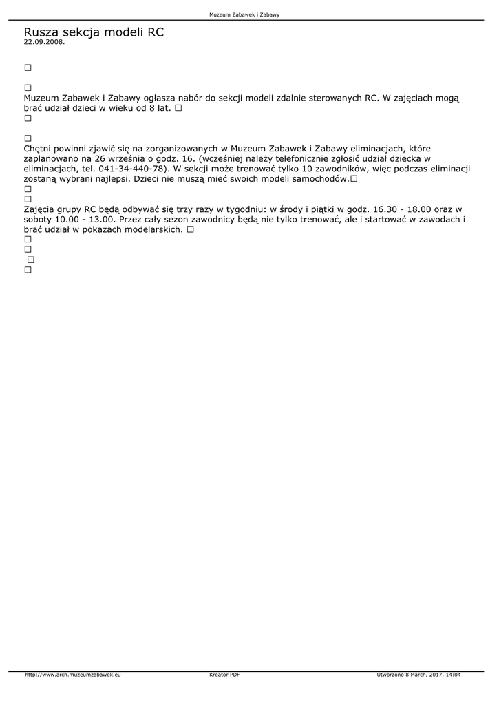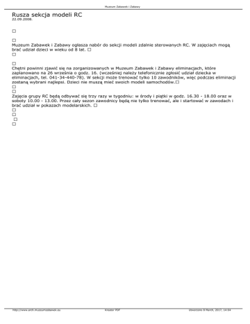 Muzeum Zabawek i Zabawy Rusza sekcja modeli RC 22.09.2008. Muzeum Zabawek i Zabawy ogłasza nabór do sekcji modeli zdalnie sterowanych RC. W zajęciach mogą brać udział dzieci w wieku od 8 lat. Chętni powinni zjawić się na zorganizowanych w Muzeum Zabawek i Zabawy eliminacjach, które zaplanowano na 26 września o godz. 16. (wcześniej należy telefonicznie zgłosić udział dziecka w eliminacjach, tel. 041-34-440-78). W sekcji może trenować tylko 10 zawodników, więc podczas eliminacji zostaną wybrani najlepsi. Dzieci nie muszą mieć swoich modeli samochodów. Zajęcia grupy RC będą odbywać się trzy razy w tygodniu: w środy i piątki w godz. 16.30 - 18.00 oraz w soboty 10.00 - 13.00. Przez cały sezon zawodnicy będą nie tylko trenować, ale i startować w zawodach i brać udział w pokazach modelarskich. http://www.arch.muzeumzabawek.eu Kreator PDF Utworzono 8 March, 2017, 14:04