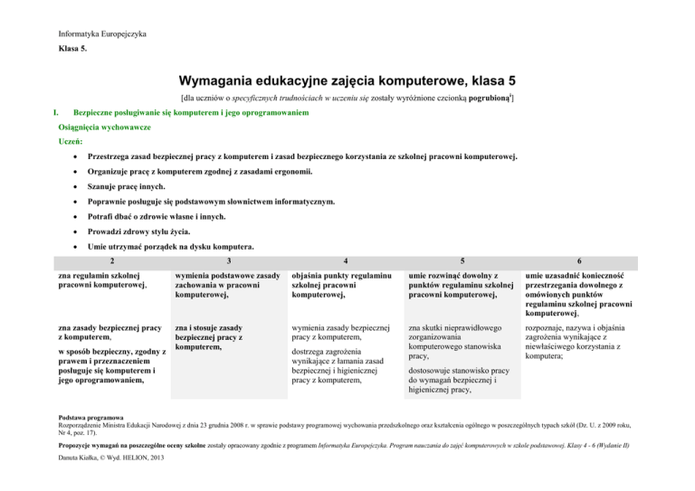 Informatyka Europejczyka Klasa 5. Wymagania edukacyjne zajęcia komputerowe, klasa 5 [dla uczniów o specyficznych trudnościach w uczeniu się zostały wyróżnione czcionką pogrubionąi] I. Bezpieczne posługiwanie się komputerem i jego oprogramowaniem Osiągnięcia wychowawcze Uczeń: Przestrzega zasad bezpiecznej pracy z komputerem i zasad bezpiecznego korzystania ze szkolnej pracowni komputerowej. Organizuje pracę z komputerem zgodnej z zasadami ergonomii. Szanuje pracę innych. Poprawnie posługuje się podstawowym słownictwem informatycznym. Potrafi dbać o zdrowie własne i innych. Prowadzi zdrowy stylu życia. Umie utrzymać porządek na dysku komputera. 2 3 4 5 6 zna regulamin szkolnej pracowni komputerowej, wymienia podstawowe zasady zachowania w pracowni komputerowej, objaśnia punkty regulaminu szkolnej pracowni komputerowej, umie rozwinąć dowolny z punktów regulaminu szkolnej pracowni komputerowej, umie uzasadnić konieczność przestrzegania dowolnego z omówionych punktów regulaminu szkolnej pracowni komputerowej, zna zasady bezpiecznej pracy z komputerem, zna i stosuje zasady bezpiecznej pracy z komputerem, wymienia zasady bezpiecznej pracy z komputerem, zna skutki nieprawidłowego zorganizowania komputerowego stanowiska pracy, rozpoznaje, nazywa i objaśnia zagrożenia wynikające z niewłaściwego korzystania z komputera; w sposób bezpieczny, zgodny z prawem i przeznaczeniem posługuje się komputerem i jego oprogramowaniem, dostrzega zagrożenia wynikające z łamania zasad bezpiecznej i higienicznej pracy z komputerem, dostosowuje stanowisko pracy do wymagań bezpiecznej i higienicznej pracy, Podstawa programowa Rozporządzenie Ministra Edukacji Narodowej z dnia 23 grudnia 2008 r. w sprawie podstawy programowej wychowania przedszkolnego oraz kształcenia ogólnego w poszczególnych typach szkół (Dz. U. z 2009 roku, Nr 4, poz. 17). Propozycje wymagań na poszczególne oceny szkolne zostały opracowany zgodnie z programem Informatyka Europejczyka. Program nauczania do zajęć komputerowych w szkole podstawowej. Klasy 4 - 6 (Wydanie II) Danuta Kiałka, © Wyd. HELION, 2013 Informatyka Europejczyka Klasa 5. zachowuje prawidłową postawę podczas pracy z komputerem, prawidłowo posługuje się myszą i klawiaturą komputerową, stosuje metodę przeciągnij i upuść, zna budowę klawiatury, nazywa podstawowe klawisze, przy pomocy nauczyciela obsługuje program do nauki pisania na klawiaturze komputera, korzysta z płyty CD dołączonej do podręcznika, odnajduje na niej właściwy plik według wskazówek nauczyciela, komunikuje się z komputerem za pomocą ikon, przycisków, menu i okien dialogowych, zna przeznaczenie poszczególnych klawiszy, nazywa podstawowe klawisze i określa ich funkcje, prezentuje prawidłowy układ rąk na klawiaturze, omawia przeznaczenie poszczególnych klawiszy, wie, jak się wpisuje wielkie litery i polskie znaki, sprawnie posługuje się klawiaturą, zna przeznaczenie klawiszy: Page Up, Page Down, Home, End oraz klawiszy sterowania kursorem, popełnia nieliczne błędy, wprowadzając tekst z klawiatury, w prawidłowy sposób wprowadza z klawiatury litery z użyciem lewej i prawej ręki, obsługuje program do nauki pisania na klawiaturze komputera, świadomie korzysta z programów do nauki pisania na klawiaturze komputera; samodzielnie obsługuje płytę CD dołączoną do podręcznika, odnajduje właściwy plik potrzebny do wykonania zadania, samodzielnie pobiera, instaluje i uruchamia program do nauki pisania na klawiaturze komputera wykorzystywany na lekcji, samodzielnie zapisuje plik z płyty CD na dysku komputera bez zmiany nazwy oraz ze zmianą nazwy; stara się nie popełniać błędów przy wprowadzaniu tekstu z klawiatury, z niewielką pomocą nauczyciela obsługuje program do nauki pisania na klawiaturze komputera, przy pomocy nauczyciela zapisuje plik z płyty CD na dysku komputera bez zmiany nazwy oraz ze zmianą nazwy, zna pojęcie sieci komputerowej, przy pomocy nauczyciela poprawnie loguje się do szkolnej sieci komputerowej, rozumie pojęcie sieci komputerowej, samodzielnie loguje się do szkolnej sieci komputerowej, wie, czym jest sieć komputerowa, wymienia zalety połączenia komputerów w sieć, przy niewielkiej pomocy nauczyciela loguje się do Podstawa programowa Rozporządzenie Ministra Edukacji Narodowej z dnia 23 grudnia 2008 r. w sprawie podstawy programowej wychowania przedszkolnego oraz kształcenia ogólnego w poszczególnych typach szkół (Dz. U. z 2009 roku, Nr 4, poz. 17). Propozycje wymagań na poszczególne oceny szkolne zostały opracowany zgodnie z programem Informatyka Europejczyka. Program nauczania do zajęć komputerowych w szkole podstawowej. Klasy 4 - 6 (Wydanie II) Danuta Kiałka, © Wyd. HELION, 2013 Informatyka Europejczyka Klasa 5. prawidłowo rozpoczyna i kończy pracę w sieci; szkolnej sieci komputerowej, przy pomocy nauczyciela poprawnie loguje się i obsługuje program z płyty CD dołączonej do podręcznika, według wskazówek nauczyciela uruchamia i obsługuje komputer oraz program z płyty CD dołączonej do podręcznika, samodzielnie obsługuje komputer oraz program z płyty CD dołączonej do podręcznika, rozróżnia podstawowe elementy zestawu komputerowego, wymienia elementy zestawu komputerowego, określa zastosowanie poszczególnych elementów zestawu komputerowego, zna pojęcie stanu uśpienia komputera, rozumie pojęcie stanu uśpienia komputera, wyjaśnia różnicę między całkowitym wyłączeniem komputera a jego przejściem w stan uśpienia; umie prawidłowo rozpocząć i zakończyć pracę z komputerem, opisuje przyciski rozmieszczone na komputerze, wymienia popularne systemy operacyjne, dostosowuje elementy okna programu do własnych potrzeb, jeżeli program daje taką możliwość, potrafi podać nazwę systemu operacyjnego zainstalowanego na komputerach w pracowni, klasyfikuje podstawowe urządzenia wejścia i wyjścia w zestawie komputerowym, nazywa je i okr