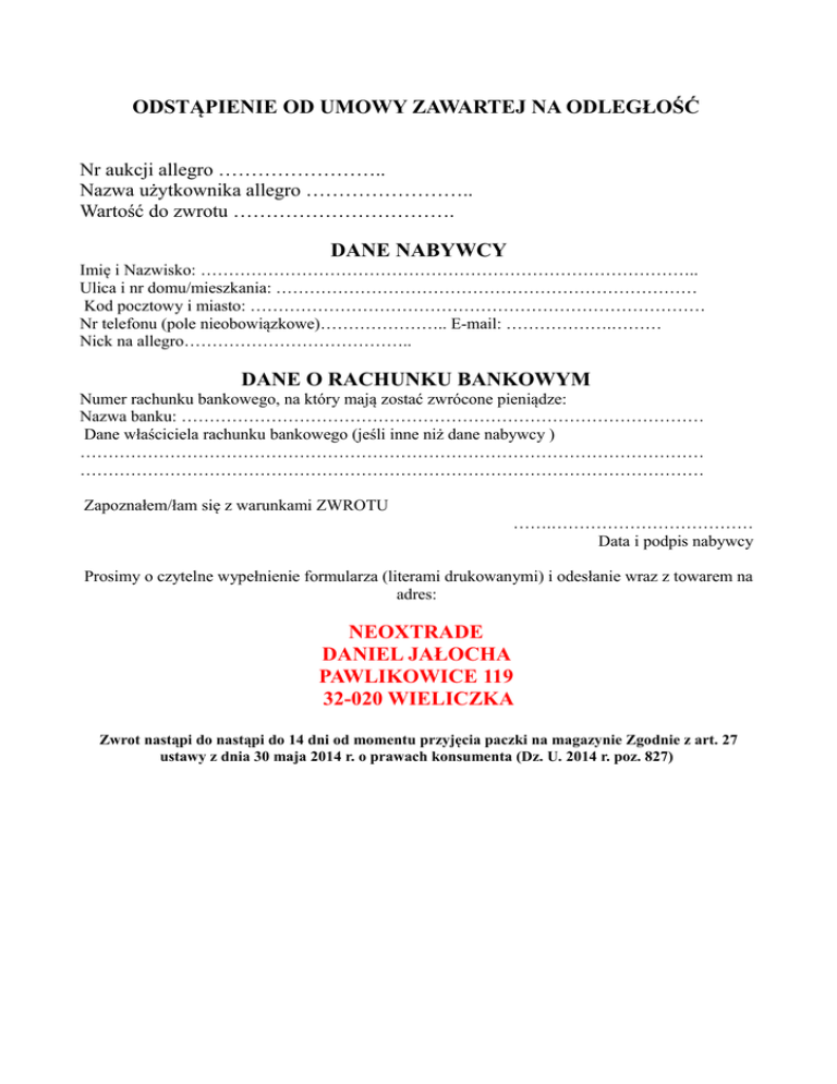 ODSTĄPIENIE OD UMOWY ZAWARTEJ NA ODLEGŁOŚĆ Nr aukcji allegro …………………….. Nazwa użytkownika allegro …………………….. Wartość do zwrotu ……………………………. DANE NABYWCY Imię i Nazwisko: …………………………………………………………………………….. Ulica i nr domu/mieszkania: ………………………………………………………………… Kod pocztowy i miasto: ……………………………………………………………………… Nr telefonu (pole nieobowiązkowe)………………….. E-mail: ……………….……… Nick na allegro………………………………….. DANE O RACHUNKU BANKOWYM Numer rachunku bankowego, na który mają zostać zwrócone pieniądze: Nazwa banku: ………………………………………………………………………………… Dane właściciela rachunku bankowego (jeśli inne niż dane nabywcy ) ………………………………………………………………………………………………… ………………………………………………………………………………………………… Zapoznałem/łam się z warunkami ZWROTU …….……………………………… Data i podpis nabywcy Prosimy o czytelne wypełnienie formularza (literami drukowanymi) i odesłanie wraz z towarem na adres: NEOXTRADE DANIEL JAŁOCHA PAWLIKOWICE 119 32-020 WIELICZKA Zwrot nastąpi do nastąpi do 14 dni od momentu przyjęcia paczki na magazynie Zgodnie z art. 27 ustawy z dnia 30 maja 2014 r. o prawach konsumenta (Dz. U. 2014 r. poz. 827)