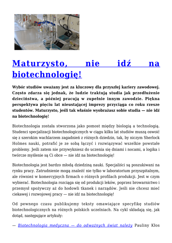 Maturzysto, nie biotechnologię! idź na Wybór studiów uważany jest za kluczowy dla przyszłej kariery zawodowej. Często zdarza się jednak, że ludzie traktują studia jak przedłużenie dzieciństwa, a później pracują w zupełnie innym zawodzie. Piękna perspektywa pięciu lat nieustającej imprezy przyciąga co roku rzesze studentów. Maturzysto, jeśli tak właśnie wyobrażasz sobie studia — nie idź na biotechnologię! Biotechnologia została stworzona jako pomost między biologią a technologią. Studenci specjalizacji biotechnologicznych w ciągu kilku lat studiów muszą oswoić się z szerokim wachlarzem zagadnień z różnych dziedzin, tak, by niczym Sherlock Holmes nauki, potrafić je ze sobą łączyć i rozwiązywać wszelkie powstałe problemy. Jeśli zatem nie przywykniesz do uczenia się dniami i nocami, a logika i twórcze myślenie są Ci obce — nie idź na biotechnologię! Biotechnologia jest bardzo młodą dziedziną nauki. Specjaliści są poszukiwani na rynku pracy. Zatrudnienie mogą znaleźć nie tylko w laboratorium przyszpitalnym, ale również w komercyjnych firmach o różnych profilach produkcji. Jest w czym wybierać. Biotechnologia rozciąga się od produkcji leków, poprzez browarnictwo i przemysł spożywczy aż do hodowli tkanek i narządów. Jeśli nie chcesz mieć ciekawej i rozwojowej pracy — nie idź na biotechnologię! Od pewnego czasu publikujemy teksty omawiające specyfikę studiów biotechnologicznych na różnych polskich uczelniach. Na cykl składają się, jak dotąd, następujące artykuły: — Biotechnologia medyczna — do odważnych świat należy Pauliny Kłos (Uniwersytet Medyczny w Łodzi) — Biotechnologia medyczna — niezaspokojona pasja życia Martyny Franczuk (Międzyuczelniany Wydział Biotechnologii Uniwersytetu Gdańskiego i Gdańskiego Uniwersytetu Medycznego) — Biotechnologia na UAM — poznawanie branży „od kuchni” Karoliny Hybzy (Uniwersytet im. Adama Mickiewicza w Poznaniu) — Bioinformatyka — specjalizacja z przyszłości Marty Danch (Politechnika Śląska) — Biotechnologia na Politechnice Łódzkiej — nie musisz być matematycznym orłem Olgi Andrzejczak (Politechnika Łódzka) — Jeśli nie biotechnologia, to co? O biologii na SGGW Katarzyny Kamel (Szkoła Główna Gospodarstwa Wiejskiego) Kolejne teksty ukażą się na naszym portalu już niebawem. Serdecznie zapraszamy studentów i absolwentów biotechnologii, a także maturzystów zastanawiających się nad wyborem studiów, do wyrażania opinii i zadawania pytań w komentarzach pod poszczególnymi artykułami. Marta Danch Data publikacji: 17.06.2011r.