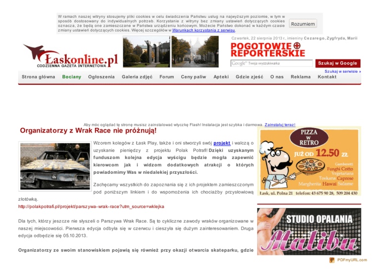 W ramach nasz ej witryny stosujemy pliki cookies w celu świadcz enia Państwu usług na najwyż sz ym poz iomie, w tym w sposób dostosowany do indywidualnych potrz eb. Korz ystanie z witryny bez z miany ustawień dotycz ących cookies oz nacz a, ż e będą one z amiesz cz ane w Państwa urz ądz eniu końcowym. Moż ecie Państwo dokonać w każ dym cz asie z miany ustawień dotycz ących cookies. Więcej sz cz egółów w Warunkach korz ystania z serwisu. Rozumiem Cz wartek, 22 sierpnia 2013 r., imieniny C e z are g o , Z yg f ryd a, Marii Sz ukaj w Google Sz ukaj w serwisie » St rona główna Bociany Ogłosz enia Galeria z djęć Forum Ceny paliw Apt eki Gdz ie z jeść O nas Reklama Kont akt Aby móc oglądać tę stronę musisz z ainstalować wtycz kę Flash! Instalacja jest sz ybka i darmowa. Z ainstaluj teraz ! Organizatorzy z Wrak Race nie próżnują! Wz orem kolegów z Łask Play, takż e i oni stworz yli swój projekt i walcz ą o uz yskanie pieniędz y f undusz om kolejna kierowcom jak i z projektu edycja widz om Polak wyścigu Potrafi! Dz ięki będz ie dodat kowych uz yskanym mogła at rakcji z apewnić o kt órych powiadomimy Was w niedalekiej prz ysz łości. Zachęcamy wsz ystkich do z apoz nania się z ich projektem z amiesz cz onym pod poniż sz ym linkiem i do wspomoż enia ich chociaż by prz ysłowiową z łotówką. http://polakpotrafi.pl/projekt/parsz ywa- wrak- race?utm_source=wklejka Dla tych, którz y jesz cz e nie słysz eli o Parsz ywa Wrak Race. Są to cyklicz ne z awody wraków organiz owane w nasz ej miejscowości. Pierwsz a edycja odbyła się w cz erwcu i ciesz yła się duż ym z ainteresowaniem. Druga edycja odbędz ie się 05.10.2013. Organiz at orz y z e swoim st anowiskiem pojawią się również prz y okaz ji ot warcia skat eparku, gdz ie PDFmyURL.com chęt nie odpowiedz ą na wsz elkie pyt ania z wiąz ane z drugą edycją rajdu a jako at rakcję prz ewidz ieli moż liwość z apoz nania się i prz ejaz du po nowym t orz e prz ygot owanym na 2 edycję! Zaprasz amy! Po każ z najo mym: Facebook nasz a- klasa.pl Gadu- Gadu Skomentuj [ 2 ] Wykop.pl 0 10:17, 22.08.2013 r. Powrót do strony głównej Wasze komentarze Rysiek @ 11:44, 22.08.2013r. IP: *.*.9.50 Proponuję ten rajd z robić na drodz e powiatowej z Wodz ierad do Lutomierska - 4 km i takie dz iury, ż e chyba wygra ten co dojedz ie. JP @ 16:29, 22.08.2013r. IP: *.*.74.108 A ja proponuję z ul. Batorego do Oatrowa rewelacja;);)marek Dodaj komentarz Imię Email Treść Najnowsze ogłoszenia OKAZ JA TANIE DZ IAŁKI do sprz edania Prz ejaż dż ki brycz ką WETERYNARIA Łask PILNIE SPRZ EDAM KOMPLET MASZ YN ROLNICZ YCH posz ukuję pracy Łódź motorowa Taylor 55kw evinrude 6 os.+ prz ycz epa odrestau wynajmę miesz kanie PDFmyURL.com Kod z obrazka Znam regulamin i akceptuję jego postanowienia. wynajmę miesz kanie Ave Maria i inne utwory na ślubach , skrz ypce Dz iałka budowlana prz y ul.Widawskiej w Łasku Prz eglądaj Dodaj komentarz Dodaj ogłosz enie bez płatnie R e d akcja se rwisu ŁaskO nline .p l nie b ie rz e o d p o wie d z ialno ści z a t re ść ko me nt arz y z amie sz cz o nych p rz e z int e rnaut ó w. N ale ż ą o ne d o o só b , kt ó re je z amie ściły. Ost at nio na f orum Sz ukam drukarni Nocne " wyścigi" samochodowe na JP II Śmieci w lasach nad Grabią... Skup makulatury mechanik Gdz ie z robić wesele cz y inną imprez ę w okolicy Łasku? ALEJA PIGMEJA Opłaty w nasz ych sz kołach podstawowych ż łobek światła w dobroniu i dz iury w teodorach Więcej dyskusji Najnowsze koment arze A ja proponuję z ul. Batorego do Oatrowa rewelacja;);)mare k... z xc - prz ywaliłeś jak łysy, grz ywą o beton.... Na fejsbuku autora tego filmu - pod koniec pojawia się link https:www.faceboo k.compages Autostr... Jak na raz ie podlegamy jesz cz e pod Łask niestety i wsz ystkie urz ędy się tu z najdują w których nie mo... do Ciekawski 08:37, 21.08.2013r. - " nasz ego odcinka" w Teodorach na filmie nie ma. do Beryl 1... j a 2 1 2 : 5 0 I dz ięki Bogu na planach lub racz ej chęciach poz ostało.... Akurat, co do muz eum i remontu kamienicy w rynku jestem na 100% z a. Latami z aniedbywany budynek nie ... Sz ersz eń wsz ystkie plany z alewu na Grabi właśnie dotycz ą tego terenu No ale ty prz ecież o tym wsz ys... to pewnie Kolumna chciała skraść alkohol z Łasku z a te kamienie :)... PDFmyURL.com ja 2 0 6 :5 5 Kolejny ekspert od " terenów z alewowych" . To, ż e rz eka wylewa na łąki koło Jambołu i wo... Find us o n Face b o o k ŁaskOnline.pl Like 1,900 people like ŁaskOnline.pl. Fa ce b o o k s o ci a l p l u g i n Najnowsze wideo PDFmyURL.com Lot niskowe roz mowy Łask Play - bit wa f reest yle'owa f inał PDFmyURL.com Łask Play - bit wa f reest yle'owa o III miejsce Łask Play - bit wa f reest yle'owa cz 2 PDFmyURL.com Łask Play - bit wa f reest yle'owa cz 1 I Fest iwal Róź wyst ępy art yst ycz ne cz 2 PDFmyURL.com I Fest iwal Róź - wyst ępy art yst ycz ne cz 1 I Fest iwal Róź - recit al poet ycko- muz ycz ny Andrz eja Wawrz yniaka O nas Kontakt Warunki korz ystania z serwisu Polityka cookies © Copyright 2011 LaskO nline .p l - C o d z ie nna G az e t a Int e rne t o wa Projekt i wykonanie: PR O - N ET PDFmyURL.com