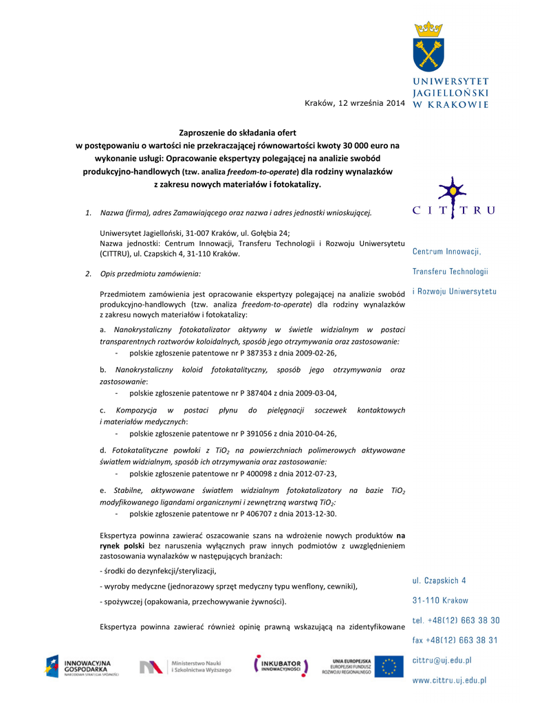 Kraków, 12 września 2014 Zaproszenie do składania ofert w postępowaniu o wartości nie przekraczającej równowartości kwoty 30 000 euro na wykonanie usługi: Opracowanie ekspertyzy polegającej na analizie swobód produkcyjno-handlowych (tzw. analiza freedom-to-operate) dla rodziny wynalazków z zakresu nowych materiałów i fotokatalizy. 1. Nazwa (firma), adres Zamawiającego oraz nazwa i adres jednostki wnioskującej. Uniwersytet Jagielloński, 31-007 Kraków, ul. Gołębia 24; Nazwa jednostki: Centrum Innowacji, Transferu Technologii i Rozwoju Uniwersytetu (CITTRU), ul. Czapskich 4, 31-110 Kraków. 2. Opis przedmiotu zamówienia: Przedmiotem zamówienia jest opracowanie ekspertyzy polegającej na analizie swobód produkcyjno-handlowych (tzw. analiza freedom-to-operate) dla rodziny wynalazków z zakresu nowych materiałów i fotokatalizy: a. Nanokrystaliczny fotokatalizator aktywny w świetle widzialnym w postaci transparentnych roztworów koloidalnych, sposób jego otrzymywania oraz zastosowanie: - polskie zgłoszenie patentowe nr P 387353 z dnia 2009-02-26, b. Nanokrystaliczny koloid fotokatalityczny, sposób jego otrzymywania zastosowanie: - polskie zgłoszenie patentowe nr P 387404 z dnia 2009-03-04, c. Kompozycja w postaci płynu do pielęgnacji soczewek i materiałów medycznych: - polskie zgłoszenie patentowe nr P 391056 z dnia 2010-04-26, oraz kontaktowych d. Fotokatalityczne powłoki z TiO2 na powierzchniach polimerowych aktywowane światłem widzialnym, sposób ich otrzymywania oraz zastosowanie: - polskie zgłoszenie patentowe nr P 400098 z dnia 2012-07-23, e. Stabilne, aktywowane światłem widzialnym fotokatalizatory na bazie TiO2 modyfikowanego ligandami organicznymi i zewnętrzną warstwą TiO2: - polskie zgłoszenie patentowe nr P 406707 z dnia 2013-12-30. Ekspertyza powinna zawierać oszacowanie szans na wdrożenie nowych produktów na rynek polski bez naruszenia wyłącznych praw innych podmiotów z uwzględnieniem zastosowania wynalazków w następujących branżach: - środki do dezynfekcji/sterylizacji, - wyroby medyczne (jednorazowy sprzęt medyczny typu wenflony, cewniki), - spożywczej (opakowania, przechowywanie żywności). Ekspertyza powinna zawierać również opinię prawną wskazującą na zidentyfikowane zagrożenia wraz z propozycją możliwych rozwiązań prawnych w tym zakresie. Wykonawca ekspertyzy otrzyma dostęp do treści zgłoszeń patentowych dokonanych dla wynalazków oraz wszelkich innych danych dotyczących wynalazków dostępnych Zamawiającemu. 3. Warunki płatności. Płatność dokonana zostanie przelewem, do 21 dni po zatwierdzeniu protokołu odbioru pracy i wystawieniu faktury. 4. Termin wykonania zamówienia: 21 listopad 2014 r. 5. Sposób przygotowania oferty oraz miejsce i termin składania ofert. Ofertę należy złożyć w formie pisemnej: a. osobiście w siedzibie: CITTRU, ul. Czapskich 4, 31-110 Kraków b. lub przesłać na adres: CITTRU, ul. Czapskich 4, 31-110 Kraków c. lub przesłać faksem na numer: 12 663 38 31 d. lub przesłać e-mail na adres: [email protected] w nieprzekraczalnym terminie: do dnia 19 września 2014 do godz. 15:00. Oferty otrzymane po terminie składania ofert zostaną zwrócone Wykonawcom bez otwierania. 6. Do oferty muszą być dołączone następujące dokumenty: • wypełniony i podpisany formularz oferty. 7. Wybór oferty: Zamawiający dokona wyboru oferty biorąc pod uwagę cenę usługi. Wykonawca musi posiadać: • udokumentowane doświadczenie w przygotowaniu ekspertyz typu freedom-to-operate (wykonanie przynajmniej 4 ekspertyz w ciągu ostatnich 2 lat potwierdzone referencjami).