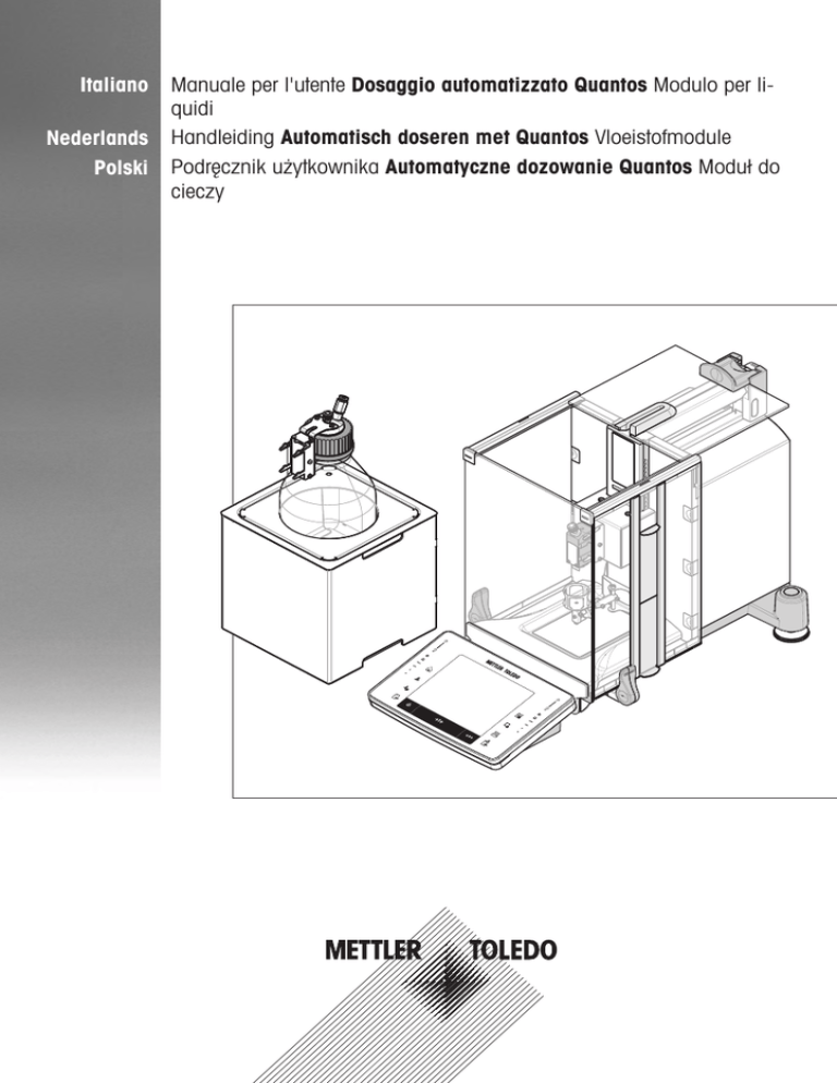 Italiano Nederlands Polski Manuale per l'utente Dosaggio automatizzato Quantos Modulo per liquidi Handleiding Automatisch doseren met Quantos Vloeistofmodule Podręcznik użytkownika Automatyczne dozowanie Quantos Moduł do cieczy Panoramica del modulo per liquidi 4 2 1 3 6 5 7 Legenda del modulo per liquidi Modulo pompa con bottiglia 1 Modulo pompa (QL2) 2 Supporto testa di dosaggio liquidi 3 Bottiglia Kit per liquidi con testa di dosaggio liquidi (QLL1000) 4 Sportello superiore in vetro 5 Testa di dosaggio liquidi (QL001) 6 Kit per liquidi (QLX45) 7 ErgoClip vial Legenda vloeistofmodule Pompmodule met fles 1 Pompmodule (QL2) 2 Ondersteuning vloeistofdoseerkop 3 Fles Vloeistofkit met vloeistofdoseerkop (QLL1000) 4 Glazen afdekplaat 5 Vloeistofdoseerkop (QL001) 6 Vloeistofkit (QLX45) 7 ErgoClip vial Moduł cieczy — legenda Moduł pompy z butelką 1 Moduł pompy (QL2) 2 Wspornik głowicy dozownika 3 Butelka Zestaw do cieczy z dozownikiem (QLL1000) 4 Szklana pokrywa cieczy 5 Głowica dozująca ciecz (QL001) 6 Zestaw do cieczy (QLX45) 7 Uchwyt ErgoClip do fiolek 1 2 Manuale per l'utente Dosaggio automatizzato Quantos Italiano Handleiding Automatisch doseren met Quantos Nederlands Podręcznik użytkownika Automatyczne dozowanie Quantos Polski 1 Informazioni sulla sicurezza Prima di utilizzare il dispositivo, leggere attentamente le istruzioni del manuale. Conservare il presente manuale per eventuali consultazioni future. • In caso di consegna del dispositivo a terzi, consegnare anche il presente manuale. Se il dispositivo non viene utilizzato conformemente alle istruzioni del manuale o se viene modificato, ciò potrebbe compromettere la sicurezza dell'utente e Mettler-Toledo GmbH non si assumerà alcuna responsabilità. it • • 1.1 Definizione dei termini o simboli di avvertimento Termini di avvertimento AVVERTENZA per situazioni pericolose a medio rischio che, se non evitate, potrebbero causare lesioni gravi o pericolo di morte. ATTENZIONE per situazioni pericolose a basso rischio che, se non evitate, potrebbero causare lesioni di lieve o media entità. AVVISO per situazioni pericolose a basso rischio che, se non evitate, potrebbero arrecare danni allo strumento, altri danni materiali, malfunzionamenti, risultati erronei o perdita di dati. Nota (senza simbolo) per informazioni utili sul prodotto. Simboli Pericolo generico Folgorazione Sostanze infiammabili o esplosive Esplosione Sostanza tossica 1.2 Note sulla sicurezza specifiche del prodotto Il vostro sistema di dosaggio è conforme allo stato dell'arte della tecnologia e rispetta tutte le norme di sicurezza riconosciute; tuttavia, alcuni rischi possono sorgere in circostanze estranee. Non aprire il dispositivo; non contiene componenti che possano essere manutenuti, riparati o sostituiti dall’utente. In caso di problemi con il sistema di dosaggio, contattare il rivenditore METTLER TOLEDO autorizzato o il servizio di assistenza. Il sistema di dosaggio è stato collaudato per gli esperimenti e gli scopi previsti, documentati nel relativo manuale. L'utente non può tuttavia esimersi dalla responsabilità di verificare personalmente che il prodotto fornito sia idoneo ai metodi e agli scopi previsti. Utilizzo previsto Questo sistema di dosaggio è stato progettato per l'utilizzo in laboratori di analisi da parte di personale qualificato. Il sistema di dosaggio è utilizzato per la pesata e il dosaggio di campioni in polvere o liquidi. Utilizzare il sistema di dosaggio esclusivamente per questo scopo. Qualsiasi utilizzo o funzionamento diverso da quelli chiaramente indicati nelle specifiche tecniche e non espressamente consentito per iscritto da Mettler-Toledo GmbHè da considerarsi diverso dallo "scopo previsto". Requisiti del luogo di utilizzo La bilancia è stata sviluppata per l'impiego in ambienti chiusi, in un'area ben ventilata. Evitare i seguenti fattori ambientali: • • Condizioni ambientali diverse da quelle specificate nei dati tecnici Forti vibrazioni Dosaggio automatizzato Quantos 3 • • • • Esposizione diretta ai raggi solari Atmosfera con gas corrosivi Atmosfera esplosiva composta da gas, vapore, nebbia, polvere e polveri esplosive Forti campi elettrici e magnetici Qualifiche del personale L’utilizzo errato del sistema di dosaggio o delle sostanze chimiche utilizzate per l’analisi può causare la morte o lesioni. Per l’utilizzo del sistema di dosaggio è necessaria l'esperienza specificata di seguito. • • • Competenza ed esperienza nell’impiego di sostanze tossiche e caustiche. Competenza ed esperienza nell’impiego di strumenti da laboratorio standard. Competenza ed esperienza nello svolgimento delle mansioni osservando le norme di sicurezza generali per il laboratorio. Responsabilità del proprietario del sistema di dosaggio Il proprietario del sistema di dosaggio è la persona che utilizza il sistema di dosaggio per impieghi commerciali o che lo mette a disposizione del proprio personale. Il proprietario del sistema di dosaggio è responsabile della sicurezza del prodotto e del personale, di uno o più utenti e di terzi. L’operatore ha le seguenti responsabilità: • • • • • Conoscere le norme di sicurezza sul luogo di lavoro in vigore e farle rispettare. Assicurarsi che soltanto il personale qualificato utilizzi il sistema di dosaggio. Definire le responsabilità per l’installazione, il funzionamento, la pulizia, la risoluzione dei problemi e la manutenzione, e assicurarsi che le attività vengano effettuate. Formare il personale a intervalli periodici e informarlo dei pericoli. Fornire i dispositivi di protezione previsti per il personale. Spegnimento dello strumento in situazioni di emergenza − Staccare la spina dalla presa elettrica. Indumenti di protezione Quando si lavora in laboratorio a contatto con sostanze pericolose o tossiche, indossare indumenti protettivi. Indossare protezioni per gli occhi idonee, ad esempio gli occhiali. Utilizzare appositi guanti quando si maneg