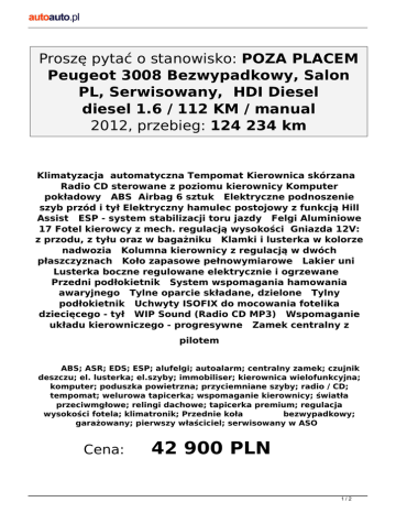 Proszę pytać o stanowisko: POZA PLACEM Peugeot 3008 Bezwypadkowy, Salon PL, Serwisowany, HDI Diesel diesel 1.6 / 112 KM / manual 2012, przebieg: 124 234 km Klimatyzacja automatyczna Tempomat Kierownica skórzana Radio CD sterowane z poziomu kierownicy Komputer pokładowy ABS Airbag 6 sztuk Elektryczne podnoszenie szyb przód i tył Elektryczny hamulec postojowy z funkcją Hill Assist ESP - system stabilizacji toru jazdy Felgi Aluminiowe 17 Fotel kierowcy z mech. regulacją wysokości Gniazda 12V: z przodu, z tyłu oraz w bagażniku Klamki i lusterka w kolorze nadwozia Kolumna kierownicy z regulacją w dwóch płaszczyznach Koło zapasowe pełnowymiarowe Lakier uni Lusterka boczne regulowane elektrycznie i ogrzewane Przedni podłokietnik System wspomagania hamowania awaryjnego Tylne oparcie składane, dzielone Tylny podłokietnik Uchwyty ISOFIX do mocowania fotelika dziecięcego - tył WIP Sound (Radio CD MP3) Wspomaganie układu kierowniczego - progresywne Zamek centralny z pilotem ABS; ASR; EDS; ESP; alufelgi; autoalarm; centralny zamek; czujnik deszczu; el. lusterka; el.szyby; immobiliser; kierownica wielofunkcyjna; komputer; poduszka powietrzna; przyciemniane szyby; radio / CD; tempomat; welurowa tapicerka; wspomaganie kierownicy; światła przeciwmgłowe; relingi dachowe; tapicerka premium; regulacja wysokości fotela; klimatronik; Przednie koła bezwypadkowy; garażowany; pierwszy właściciel; serwisowany w ASO Cena: 42 900 PLN 1/2 brutto Opiekun: Piotr Raspopin +48 602 796 683 Al. Krakowska 178, Punkt C 2/2