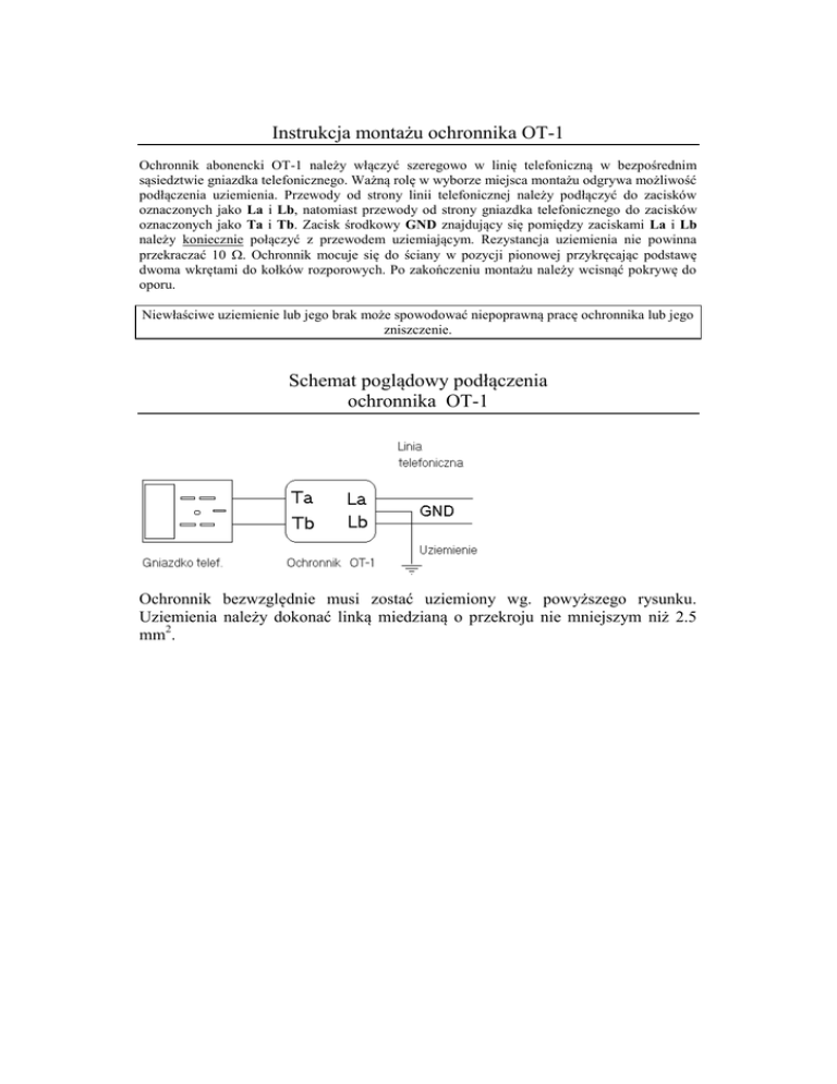 Instrukcja montażu ochronnika OT-1 Ochronnik abonencki OT-1 należy włączyć szeregowo w linię telefoniczną w bezpośrednim sąsiedztwie gniazdka telefonicznego. Ważną rolę w wyborze miejsca montażu odgrywa możliwość podłączenia uziemienia. Przewody od strony linii telefonicznej należy podłączyć do zacisków oznaczonych jako La i Lb, natomiast przewody od strony gniazdka telefonicznego do zacisków oznaczonych jako Ta i Tb. Zacisk środkowy GND znajdujący się pomiędzy zaciskami La i Lb należy koniecznie połączyć z przewodem uziemiającym. Rezystancja uziemienia nie powinna przekraczać 10 . Ochronnik mocuje się do ściany w pozycji pionowej przykręcając podstawę dwoma wkrętami do kołków rozporowych. Po zakończeniu montażu należy wcisnąć pokrywę do oporu. Niewłaściwe uziemienie lub jego brak może spowodować niepoprawną pracę ochronnika lub jego zniszczenie. Schemat poglądowy podłączenia ochronnika OT-1 Ochronnik bezwzględnie musi zostać uziemiony wg. powyższego rysunku. Uziemienia należy dokonać linką miedzianą o przekroju nie mniejszym niż 2.5 mm2.
