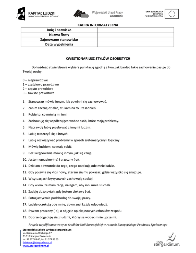 KADRA INFORMATYCZNA Imię i nazwisko Nazwa firmy Zajmowane stanowisko Data wypełnienia KWESTIONARIUSZ STYLÓW OSOBISTYCH Do każdego stwierdzenia wybierz punktację zgodną z tym, jak bardzo takie zachowanie pasuje do Twojej osoby: 0 – nieprawdziwe 1 – częściowo prawdziwe 2 – często prawdziwe 3 – zawsze prawdziwe 1. Stanowczo mówię innym, jak powinni się zachowywać. 2. Zanim zacznę działać, szukam na to uzasadnień. 3. Robię to, co mówią mi inni. 4. Zachowuję się współczująco wobec osób, które mają problemy. 5. Naprawdę lubię przebywać z innymi ludźmi. 6. Lubię troszczyć się o innych. 7. Lubię rozwiązywać problemy w sposób systematyczny i logiczny. 8. Mówię ludziom, co mają robić. 9. Bez skrępowania mówię innym, jak się czuję. 10. Jestem uprzejmy (-a) i grzeczny (-a). 11. Działam odwrotnie do tego, czego oczekują ode mnie ludzie. 12. Gdy pojawia się ktoś nowy, staram się mu pokazać, gdzie wszystko się znajduje. 13. W sytuacjach kryzysowych zachowuję spokój. 14. Gdy wiem, że mam rację, nalegam, aby inni mnie słuchali. 15. Zadaję dużo pytań, gdy jestem ciekawy (-a). 16. Entuzjastycznie podchodzę do swojej pracy. 17. Ludzie oczekują ode mnie, abym znał każdą odpowiedź. 18. Bywam proszony (-a), o objęcie opieką nowych członków zespołu. 19. Dobrze dogaduję się z ludźmi, którzy są wobec mnie uprzejmi. Projekt współfinansowany ze środków Unii Europejskiej w ramach Europejskiego Funduszu Społecznego Stargardzka Szkoła Wyższa Stargardinum ul. Kazimierza Wielkiego 17 73-110 Stargard Szczeciński tel. 91 577 83 60, fax 91 577 83 65 [email protected] www.stargardinum.pl 20. Nawet pod presja potrafię myśleć logicznie. 21. Mój styl pracy jest systematyczny i logiczny. 22. Ubieram się do pracy podobnie jak inne osoby. 23. Robię coś za innych ludzi, gdy myślę, że sami sobie nie poradzą. 24. Potrafię odwoływać się do swoich wcześniejszych doświadczeń, gdy pojawiają się problemy. 25. Ludzie mówią mi, że jestem twórczy (-a) i pomysłowy(-a). 26. Wolę przejmować kontrolę, niż podążać za czyimś przewodnictwem. 27. Za bardzo przejmuję się innymi. 28. Jestem zbyt wrażliwy (-a) w porównaniu z innymi. 29. Oczekuję od mojego szefa, aby określił zakres moich obowiązków. 30. Podczas podejmowania decyzji, biorę pod uwagę wszystkie punkty widzenia. 31. Zachęcam ludzi do sprawdzania swoich zdolności. 32. Ludzie narzekają, że jestem apodyktyczny (-a). 33. Lubię dobrze się bawić. 34. Ludzie mówią mi, że jestem wyjątkowo grzeczny (-a). 35. Jestem spostrzegany (-a) jako osoba o zrównoważonym usposobieniu i wyważonych opiniach. 36. Okazuję swoje uczucia, gdy jestem szczęśliwy (-a) lub smutny (-a), by ludzie mogli mi pogratulować, albo współczuć. 37. Troszczyłem (-am) się o innych, mimo że mogli sami dać sobie radę. 38. Korci mnie, aby analizować żarty, co psuje innym zabawę. 39. Ludzie wykonują moje polecenia. 40. Zbyt chętnie wykonuję to, czego chcą inni. Projekt współfinansowany ze środków Unii Europejskiej w ramach Europejskiego Funduszu Społecznego Stargardzka Szkoła Wyższa Stargardinum ul. Kazimierza Wielkiego 17 73-110 Stargard Szczeciński tel. 91 577 83 60, fax 91 577 83 65 [email protected] www.stargardinum.pl Test wiedzy o procesie komunikowania się Nie jest ważne, co potrafisz, lecz to, co wymyślisz na czas. Autor nieznany Jeżeli uważasz, że dane stwierdzenie jest prawdziwe (P) lub nieprawdziwe (N), zakreśl odpowiednią literę. Niektóre stwierdzenia dotyczą błędów w komunikacji, w tym nieporozumień zarówno werbalnych, jak i niewerbalnych. Inne określają zasady komunikacji słownej i sposoby wyrażania myśli, uczuć oraz przekazywania informacji. Są też pozycje dotyczące niewerbalnych metod wyrażania myśli i uczuć. 1. Humor najczęściej rozładowuje napięcie na zebraniach P N 2. Osoby sugerujące „wybierzmy przewodniczącego” bardzo często same chcą zostać wybrane P N 3. Rysowanie czegoś na papierze na ogół pomaga słuchać P N 4. Ludzie nie lubią słuchać i czytać o tym, z czym się nie zgadzają P N 5. Plotki nigdy nie są godne uwagi P N 6. Porozumiewanie się jest łatwe P N 7. Ci, którzy nie słuchają, na ogół nie są zainteresowani P N 8. Jeżeli ktoś nie przestaje mówić, oznacza to, że ma do przekazania dużo ważnych informacji P N 9. Ludzie przeważnie zapominają o tym, co ich nie interesuje P N 10. Sposób, w jaki się stoi, jest ważną formą komunikacji P N 11. Uważne słuchanie jest rzeczą naturalną P N P N 13. Jeżeli zostały zranione czyjeś uczucia, komunikacja nie była skuteczna P N 14. Uśmiech nie zawsze oznacza zadowolenie P N 15. Osoba przychodzącą na zebranie jako pierwsza jest na ogół najbardziej nim zainteresowana P N 16. Zachęcanie małomównych do zabierania głosu nie ma większego sensu, choć może jest uprzejme P N 17. Ludzie dający się najłatwiej przekonać to prawie zawsze ci, którzy najszybciej pojmują P N 18. Ubiór odzwierciedla osobowość P N 19. Osoba dobrze rozumiejąca dane zagadnienie przeważnie umie dobrze je zakomunikować P N 12. Mówienie w sposób przekonywujący jest jedna z najważniejszych umiejętności potrzebnych do zapewnienia skutecznej komunikacji Projekt współfinansowany ze środków Unii Europejskiej w ramach Europejskiego Funduszu Społecznego Stargardzka Szkoła Wyższa Stargardinum ul. Kazimierza Wielkiego 17 73-110 Stargard Szczeciński tel. 91 577 83 60, fax 91 577 83 65 [email protected] www.stargardinum.pl 20. Osoba, która na zebraniu siedzi „na szczycie stołu” może usiłować dominować nad innymi P N 21. Sposób, w jaki wypowiada się dane słowo, wpływa na jego znaczenie P N 22. Kiedy ludzie obawiają się krytyki, skłonni są mniej mówić P N 23. W większości wypadków ciszę można rozumieć jako zgodę P N 24. Osoba, która najwięcej mówi, zapewne usiłuje zdominować innych P N 25. Znaczenie sł