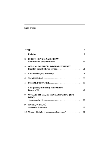Spis treści Wst˛ep . . . . . . . . . . . . . . . . . . . . . . . . . . . . . . . . . . . . . . . . . . . . . . . . . . 5 1 Rodzina . . . . . . . . . . . . . . . . . . . . . . . . . . . . . . . . . . . . . . . . . . . . 7 2 DOBRY, LEPSZY, NAJLEPSZY stopniowanie przymiotników . . . . . . . . . . . . . . . . . . . . . . . . . . 13 3 OGLADAJ ˛ AC ˛ MECZ, JADŁEM CUKIERKI Imiesłów przysłówkowy czynny . . . . . . . . . . . . . . . . . . . . . . . . 21 4 Czas teraźniejszy neutralny . . . . . . . . . . . . . . . . . . . . . . . . . . . 25 5 MAM ZAMIAR . . . . . . . . . . . . . . . . . . . . . . . . . . . . . . . . . . . . . 33 6 UMIEM, POTRAFIE! ˛ . . . . . . . . . . . . . . . . . . . . . . . . . . . . . . . . 39 7 Czas przeszły neutralny czasowników Forma TA . . . . . . . . . . . . . . . . . . . . . . . . . . . . . . . . . . . . . . . . . 47 8 WYDAJE MI SIE, ˛ ŻE TEN SAMOCHÓD JEST DROGI -to omou, sō, yō . . . . . . . . . . . . . . . . . . . . . . . . . . . . . . . . . . . . . . 55 9 MUSZE˛ WRACAĆ -nakereba ikemasen . . . . . . . . . . . . . . . . . . . . . . . . . . . . . . . . . . 65 10 Wyrazy dźwi˛eko- i obrazonaśladowcze . . . . . . . . . . . . . . . 71 2 Spis treści 11 DAJE˛ KWIATY MAMIE . . . . . . . . . . . . . . . . . . . . . . . . . . . . . 87 12 CZYTAM DZIECKU BAJKE˛ Kodomo-ni dōwa-o yonde agemasu . . . . . . . . . . . . . . . . . . . . 97 13 PROSZE˛ NAPISAĆ SWOJE IMIE˛ -te kudasai - tryb rozkazujacy ˛ . . . . . . . . . . . . . . . . . . . . . . . . . 103 14 UMYŁ RECE, ˛ A POTEM ZJADŁ OBIAD Forma te nast˛epstwo czynności . . . . . . . . . . . . . . . . . . . . . 113 15 OGLADAM ˛ TERAZ TELEWIZJE˛ -te imasu . . . . . . . . . . . . . . . . . . . . . . . . . . . . . . . . . . . . . . . . . . . . 119 16 CZY MOGE˛ TO ZJEŚĆ? -te-mo ii desu-ka? . . . . . . . . . . . . . . . . . . . . . . . . . . . . . . . . . . . . 131 17 Forma te w różnych konstrukcjach . . . . . . . . . . . . . . . . . . . 137 18 Łaczniki ˛ zdań złożonych . . . . . . . . . . . . . . . . . . . . . . . . . . . . . . 143 19 LEPIEJ WYPIJ TO LEKARSTWO -ta hō-ga ii . . . . . . . . . . . . . . . . . . . . . . . . . . . . . . . . . . . . . . . . . . 153 20 CO ROBIŁEŚ W SOBOTE? ˛ -tari, -tari shimashita . . . . . . . . . . . . . . . . . . . . . . . . . . . . . . . . . 159 21 BLUZKA, KTÓRA˛ KUPIŁAM, JEST ZA DUŻA Zdania przydawkowe . . . . . . . . . . . . . . . . . . . . . . . . . . . . . . . . 163 22 Keigo, czyli grzeczność . . . . . . . . . . . . . . . . . . . . . . . . . . . . . . . 169 23 TYLKO po japońsku . . . . . . . . . . . . . . . . . . . . . . . . . . . . . . . . . 177 24 Czasowniki przechodnie i nieprzechodnie . . . . . . . . . . . . . . . 183 25 Złożenia . . . . . . . . . . . . . . . . . . . . . . . . . . . . . . . . . . . . . . . . . . . . 189 26 BYŁEM KIEDYŚ W JAPONII -ta koto-ga arimasu . . . . . . . . . . . . . . . . . . . . . . . . . . . . . . . . . . 195 Spis treści 3 27 GDY BYŁEM MAŁY... Zdania okolicznikowe czasu . . . . . . . . . . . . . . . . . . . . . . . . . . . 201 28 Piszemy list po japońsku . . . . . . . . . . . . . . . . . . . . . . . . . . . . . . 207 29 Najcz˛eściej popełniane bł˛edy przez Polaków uczacych ˛ si˛e j˛ezyka japońskiego . . . . . . . . . . . . . . . . . . . . . . . . . . . . . . . . 215 30 Ankieta . . . . . . . . . . . . . . . . . . . . . . . . . . . . . . . . . . . . . . . . . . . . . 225 Odpowiedzi . . . . . . . . . . . . . . . . . . . . . . . . . . . . . . . . . . . . . . . . . . . . . 235 Materiał na płycie CD . . . . . . . . . . . . . . . . . . . . . . . . . . . . . . . . . . . 253 Słowniczek japońsko polski . . . . . . . . . . . . . . . . . . . . . . . . . . . . . 261 Słownik japońsko-polski wyrażeń onomatopeicznych . . . . . . . . 301