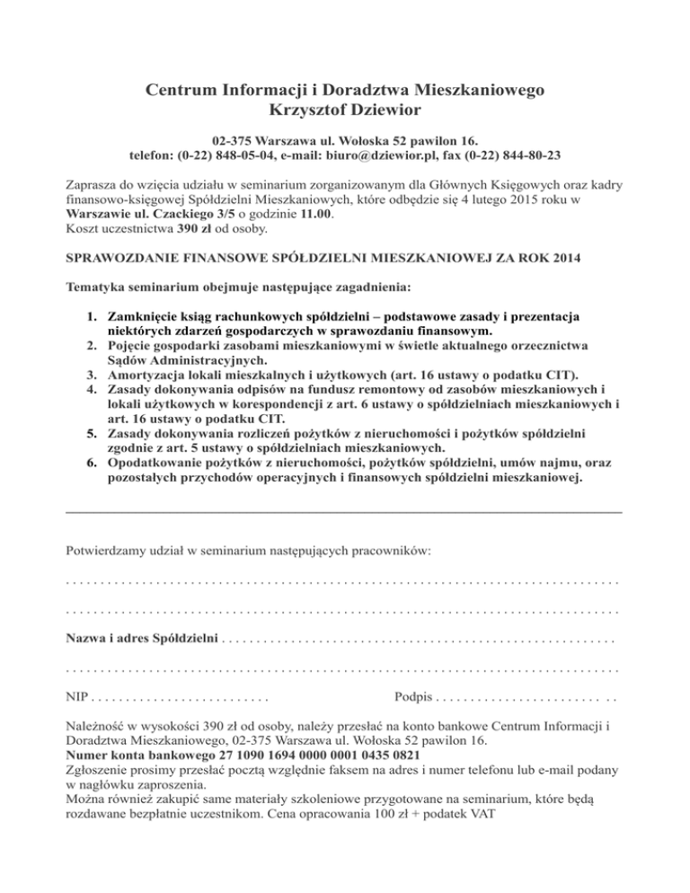 Centrum Informacji i Doradztwa Mieszkaniowego Krzysztof Dziewior 02-375 Warszawa ul. Wołoska 52 pawilon 16. telefon: (0-22) 848-05-04, e-mail: [email protected], fax (0-22) 844-80-23 Zaprasza do wzięcia udziału w seminarium zorganizowanym dla Głównych Księgowych oraz kadry finansowo-księgowej Spółdzielni Mieszkaniowych, które odbędzie się 4 lutego 2015 roku w Warszawie ul. Czackiego 3/5 o godzinie 11.00. Koszt uczestnictwa 390 zł od osoby. SPRAWOZDANIE FINANSOWE SPÓŁDZIELNI MIESZKANIOWEJ ZA ROK 2014 Tematyka seminarium obejmuje następujące zagadnienia: 1. Zamknięcie ksiąg rachunkowych spółdzielni – podstawowe zasady i prezentacja niektórych zdarzeń gospodarczych w sprawozdaniu finansowym. 2. Pojęcie gospodarki zasobami mieszkaniowymi w świetle aktualnego orzecznictwa Sądów Administracyjnych. 3. Amortyzacja lokali mieszkalnych i użytkowych (art. 16 ustawy o podatku CIT). 4. Zasady dokonywania odpisów na fundusz remontowy od zasobów mieszkaniowych i lokali użytkowych w korespondencji z art. 6 ustawy o spółdzielniach mieszkaniowych i art. 16 ustawy o podatku CIT. 5. Zasady dokonywania rozliczeń pożytków z nieruchomości i pożytków spółdzielni zgodnie z art. 5 ustawy o spółdzielniach mieszkaniowych. 6. Opodatkowanie pożytków z nieruchomości, pożytków spółdzielni, umów najmu, oraz pozostałych przychodów operacyjnych i finansowych spółdzielni mieszkaniowej. ________________________________________________________________________________ Potwierdzamy udział w seminarium następujących pracowników: ................................................................................ ................................................................................ Nazwa i adres Spółdzielni . . . . . . . . . . . . . . . . . . . . . . . . . . . . . . . . . . . . . . . . . . . . . . . . . . . . . . . . . ................................................................................ NIP . . . . . . . . . . . . . . . . . . . . . . . . . . Podpis . . . . . . . . . . . . . . . . . . . . . . . . . . Należność w wysokości 390 zł od osoby, należy przesłać na konto bankowe Centrum Informacji i Doradztwa Mieszkaniowego, 02-375 Warszawa ul. Wołoska 52 pawilon 16. Numer konta bankowego 27 1090 1694 0000 0001 0435 0821 Zgłoszenie prosimy przesłać pocztą względnie faksem na adres i numer telefonu lub e-mail podany w nagłówku zaproszenia. Można również zakupić same materiały szkoleniowe przygotowane na seminarium, które będą rozdawane bezpłatnie uczestnikom. Cena opracowania 100 zł + podatek VAT