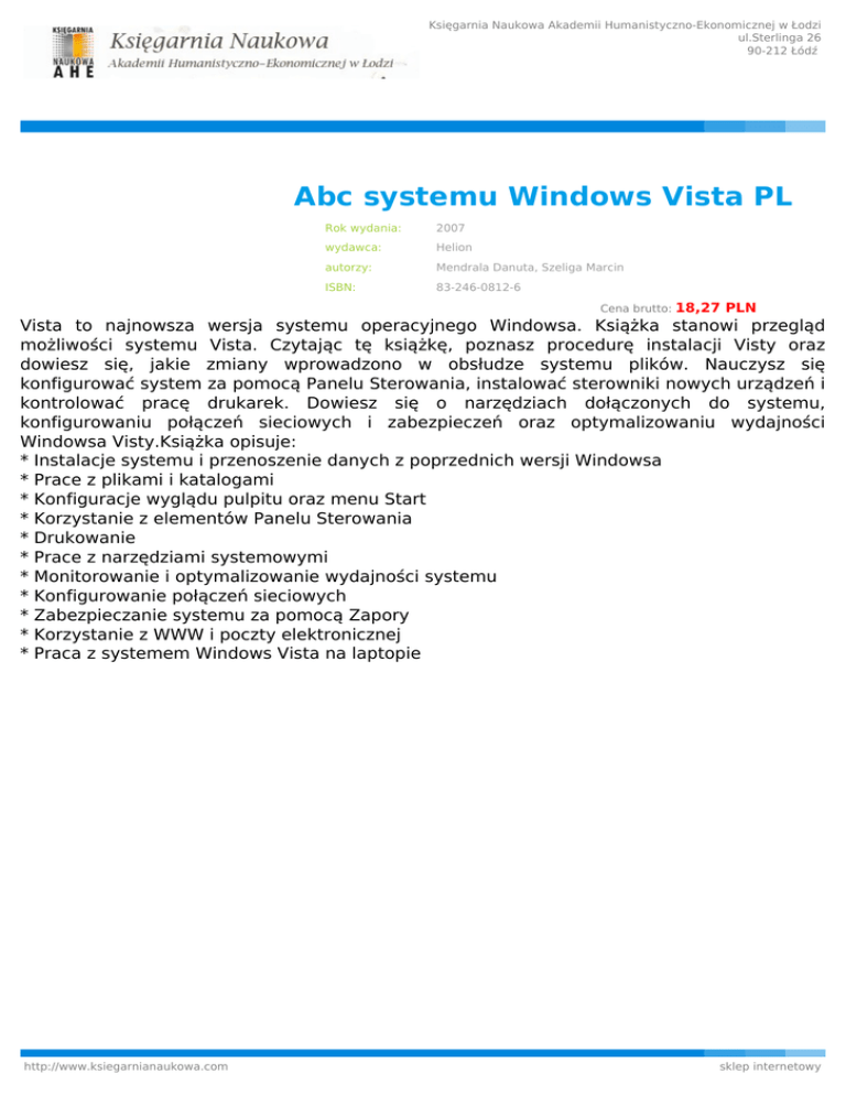 Księgarnia Naukowa Akademii Humanistyczno-Ekonomicznej w Łodzi ul.Sterlinga 26 90-212 Łódź Abc systemu Windows Vista PL Rok wydania: 2007 wydawca: Helion autorzy: Mendrala Danuta, Szeliga Marcin ISBN: 83-246-0812-6 Cena brutto: 18,27 PLN Vista to najnowsza wersja systemu operacyjnego Windowsa. Książka stanowi przegląd możliwości systemu Vista. Czytając tę książkę, poznasz procedurę instalacji Visty oraz dowiesz się, jakie zmiany wprowadzono w obsłudze systemu plików. Nauczysz się konfigurować system za pomocą Panelu Sterowania, instalować sterowniki nowych urządzeń i kontrolować pracę drukarek. Dowiesz się o narzędziach dołączonych do systemu, konfigurowaniu połączeń sieciowych i zabezpieczeń oraz optymalizowaniu wydajności Windowsa Visty.Książka opisuje: * Instalacje systemu i przenoszenie danych z poprzednich wersji Windowsa * Prace z plikami i katalogami * Konfiguracje wyglądu pulpitu oraz menu Start * Korzystanie z elementów Panelu Sterowania * Drukowanie * Prace z narzędziami systemowymi * Monitorowanie i optymalizowanie wydajności systemu * Konfigurowanie połączeń sieciowych * Zabezpieczanie systemu za pomocą Zapory * Korzystanie z WWW i poczty elektronicznej * Praca z systemem Windows Vista na laptopie http://www.ksiegarnianaukowa.com sklep internetowy