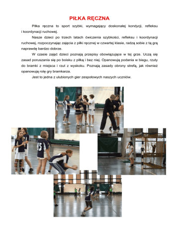 PIŁKA RĘCZNA Piłka ręczna to sport szybki, wymagający doskonałej kondycji, refleksu i koordynacji ruchowej. Nasze dzieci po trzech latach ćwiczenia szybkości, refleksu i koordynacji ruchowej, rozpoczynając zajęcia z piłki ręcznej w czwartej klasie, radzą sobie z tą grą naprawdę bardzo dobrze. W czasie zajęć dzieci poznają przepisy obowiązujące w tej grze. Uczą się zasad poruszania się po boisku z piłką i bez niej. Opanowują podania w biegu, rzuty do bramki z miejsca i rzut z wyskoku. Poznają zasady obrony strefą, jak również opanowują rolę gry bramkarza. Jest to jedna z ulubionych gier zespołowych naszych uczniów.