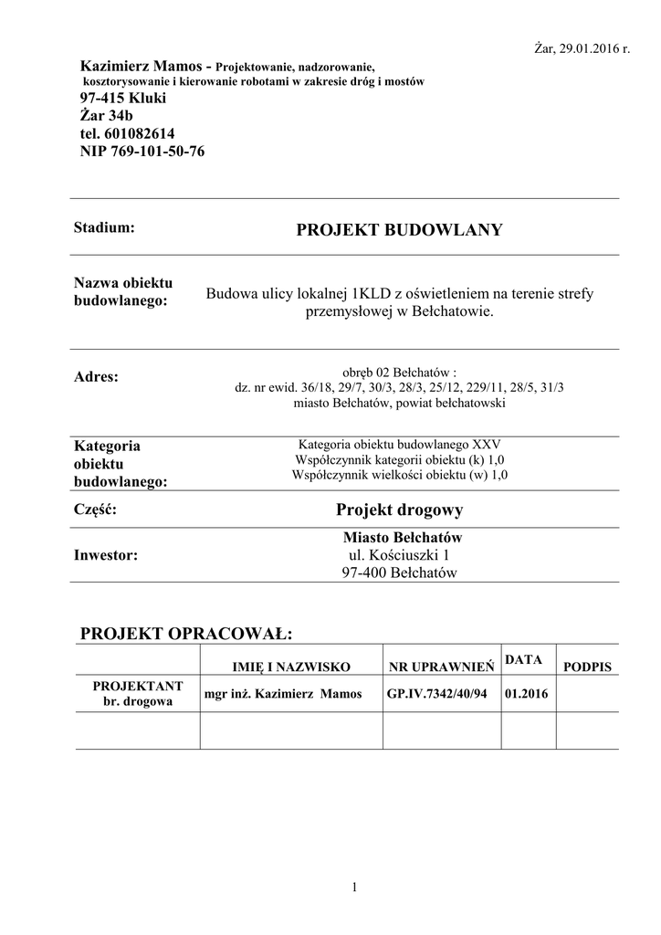 PROJEKT BUDOWLANY Projekt drogowy PROJEKT OPRACOWAŁ:
