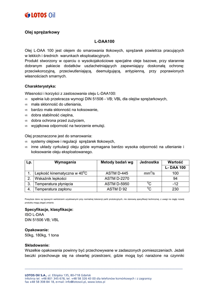 Olej spręŜarkowy L-DAA100 Olej L-DAA 100 jest olejem do smarowania tłokowych, spręŜarek powietrza pracujących w lekkich i średnich warunkach eksploatacyjnych. Produkt stworzony w oparciu o wysokojakościowe specjalne oleje bazowe, przy starannie dobranym pakiecie dodatków uszlachetniających zapewniający doskonałą ochronę: przeciwkorozyjną, przeciwutleniającą, deemulgującą, antypienną, przy poprawionych własnościach smarnych. Charakterystyka: Własności i korzyści z zastosowania oleju L-DAA100: • spełnia lub przekracza wymogi DIN 51506 - VB; VBL dla olejów spręŜarkowych, • mała skłonność do utleniania, • bardzo mała skłonność na koksowanie, • dobra stabilność cieplna, • dobra ochrona przed zuŜyciem, • wyjątkowa odporność na tworzenie emulsji. Olej przeznaczone jest do smarowania: • systemy olejowe i regulacji spręŜarek tłokowych, • inne układy cyrkulacji oleju gdzie wymagana bardzo wysoka odporność na utlenianie i koksowanie oleju eksploatowanego. Lp. 1. 2. 3. 4. Wymagania Lepkość kinematyczna w 400C Wskaźnik lepkości Temperatura płynięcia Temperatura zapłonu Metody badań wg Jednostka ASTM D-445 ASTM D-2270 ASTM D-5950 ASTM D 92 mm2/s 0 C C 0 Wartość L- DAA 100 100 94 -12 230 PowyŜsze dane są typowymi wartościami uzyskiwanymi przy normalnej tolerancji partii produkcyjnych, nie stanowią specyfikacji technicznej, z uwagi na ciągły rozwój produktu mogą ulegać zmianie. Specyfikacje, klasyfikacje: ISO L-DAA DIN 51506 VB; VBL Opakowanie: 50kg, 180kg, 1 tona Składowanie: Wszelkie opakowania powinny być przechowywane w zadaszonych pomieszczeniach. JeŜeli beczki przechowuje się na otwartej przestrzeni, gdzie mogą być naraŜone na czynniki _____________________________________________________________________________________________________ atmosferyczne - opady, naleŜy je ustawić w pozycji poziomej, tak aby uniemoŜliwić dostęp wody oraz zapobiec zniszczeniu oznakowania, najwłaściwiej przykryć brezentem. Produkt nie moŜe być przechowywany w temperaturze wyŜszej niŜ 60 ºC, ani tez naraŜony na działanie promieni słonecznych lub niskich temperatur poniŜej 0 ºC. Gwarantowany okres przydatności produktu do uŜycia przy zachowaniu warunków magazynowania wynosi nie mniej niŜ 3 lata. Zdrowie, bhp, środowisko: Informacje na temat bezpieczeństwa zawarte są w zbiorze danych dotyczących bezpieczeństwa materiałów (karta bezpieczeństwa MSDS). Zawarte tam są szczegółowe informacje odnośne potencjalnych zagroŜeń, środków ostroŜności oraz zasad udzielania pierwszej pomocy wraz z informacjami na temat wpływu na środowisko naturalne i usuwania wykorzystanych produktów. Lotos Oil SA i firmy współpracujące nie ponoszą odpowiedzialności za skutki niezgodnego z przeznaczenie wykorzystania produktu lub niestosowania opisanych środków ostroŜności. Przed zastosowaniem produktu do innych niŜ wymienione celów, naleŜy zasięgnąć porady lokalnego biura Lotos Oil SA Dane zawarte w niniejszej karcie nie stanowią oferty w rozumieniu przepisów ustawy z dnia 23 kwietnia 1964 roku - kodeks cywilny. LOTOS Oil S.A. nie ponosi Ŝadnej odpowiedzialności za jakiekolwiek skutki wykorzystywania danych zawartych w karcie, w szczególności przy podejmowaniu decyzji handlowych i inwestycyjnych. Wszelkie dane zawarte w karcie są typowymi wartościami uzyskiwanymi przy normalnej tolerancji partii produkcyjnych, mogą się nieznacznie róŜnić z uwagi na charakterystykę procesu produkcji, a takŜe z uwagi na ciągły rozwój produktu. Dane zawarte w karcie mogą podlegać zmianom. LOTOS Oil S.A. nie ponosi odpowiedzialności za dostępność produktu. Opracowano:14.03.2008 Wydanie nr 2 Aktualizacja:05.12.2010 _____________________________________________________________________________________________________