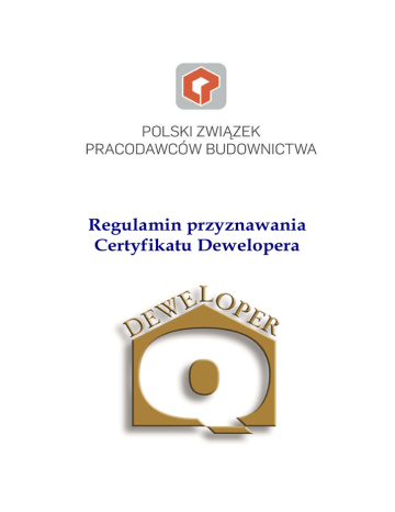 Regulamin przyznawania Certyfikatu Dewelopera Regulamin przyznawania Certyfikatu Dewelopera Art. I Przepisy Ogólne §1 I. Przedmiot Certyfikatu Dewelopera: 1. Certyfikat Dewelopera, zwany dalej Certyfikatem, został ustanowiony przez Polski Związek Pracodawców Budownictwa następcę prawnego Krajowej Izby Budownictwa, który jest jego prawnym dysponentem i wydawany jest na podstawie uchwały Kapituły Certyfikatu Dewelopera (zwana dalej Kapitułą), 2. Certyfikat jest dokumentem potwierdzającym wiarygodność dewelopera oraz jego ofert inwestycyjnych i wypełniania zobowiązań w stosunku do klientów, z którymi zostały zawarte umowy formalno-prawne, 3. Certyfikat jest wydawany deweloperowi na okres dwóch lat z możliwością przedłużania cyklicznie co dwa lata. II. Cel przyznawania Certyfikatu: 1. kształtowanie pozytywnego wizerunku tego segmentu budownictwa, realizującego potrzeby mieszkaniowe ludności, 2. promowanie rzetelnych deweloperów, a tym samym ułatwianie kontaktów z klientami, bankami i władzami samorządowymi, 3. upowszechnianie banku danych o deweloperach, głównego źródła obiektywnej informacji dla inwestorów, 4. uruchomienie systemu ostrzegania przed nieuczciwymi i nieprofesjonalnymi firmami deweloperskimi, 5. zbieranie i upowszechnianie informacji dotyczących funkcjonowania rynku deweloperów. §2 Idea przyznawania Certyfikatu oraz logo Certyfikatu Dewelopera są dobrami prawnie chronionymi i zastrzeżonymi w Urzędzie Patentowym RP. §3 Podstawą podjęcia przez Kapitułę uchwały o przyznaniu i przedłużeniu Certyfikatu jest dokumentacja dołączona do wniosku o przyznanie Certyfikatu spełniająca wszystkie warunki określone w Regulaminie. Art. II Organy Systemu Certyfikacji §1 Organami systemu certyfikacji wchodzącymi w skład struktury Polskiego Związku Pracodawców Budownictwa są: 1. Rada Polskiego Związku Pracodawców Budownictwa 2. Kapituła Certyfikatu Dewelopera 3. Sekretariat Certyfikatu 4. oraz w sprawach wymagających określonej ekspertyzy, specjalnie w tym celu powoływani przez Kapitułę Eksperci. §2 Rada Polskiego Związku Pracodawców Budownictwa jest organem nadzorującym funkcjonowanie systemu certyfikacji i do jej obowiązków należy: 1. powoływanie i odwoływanie członków Kapituły, 2. przyznawanie Certyfikatu na podstawie uchwały Kapituły, 3. nadzorowanie administracyjno-formalnej działalności Sekretariatu Certyfikatu. 2 §3 Kapituła Certyfikatu Dewelopera jest organem który: 1. przeprowadza - na podstawie dokumentacji otrzymanej z Sekretariatu Certyfikatu Dewelopera i wymaganych w niektórych przypadkach orzeczeń Ekspertów oraz własnej wiedzy - ocenę badania certyfikacyjnego, 2. wydaje uchwały w sprawie przyznania, przedłużenia, zawieszenia i odebrania ważności Certyfikatu. 3. Zasady działalności Kapituły są określone w „Regulaminie Kapituły Certyfikatu Wiarygodności Dewelopera”. §4 Sekretariat Certyfikatu Dewelopera jest organem który: 1. przyjmuje wnioski o przyznanie lub przedłużenie Certyfikatu, 2. prowadzi rejestr w/w wniosków, 3. przeprowadza weryfikację w/w wniosków pod względem formalno-prawnym, 4. prowadzi rejestr deweloperów i współpracuje z organami dokonującymi oceny, 5. pozyskuje dane i informacje uzupełniające od deweloperów w czasie ważności Certyfikatu, zgodnie z wymaganiami określonymi w Art. VI regulaminu, 6. zwraca się do Kapituły o podjęcie uchwały w sprawie przyznania, zawieszenia i odebrania ważności Certyfikatu, 7. udziela informacji : inwestorom o deweloperach i ich inwestycjach, zgodnie z posiadanymi informacjami w „banku danych”, deweloperom o stanie prac nad ich wnioskiem, organom dokonującym oceny. Zasady działalności Sekretariatu Certyfikatu są określone w „Regulaminie Sekretariatu Certyfikatu Dewelopera”. §5 Eksperci Kapituły to organ który: 1. dokonuje oceny zgłoszonych wniosków, 2. opracowuje ekspertyzy prawne, ekonomiczno-finansowe, bankowe i budowlano-techniczne, 3. wydaje opinie w sprawie przyznania, przedłużenia, zawieszenia i odebrania ważności certyfikatu, 4. przeprowadza weryfikacje przyznanych certyfikatów, 5. przedstawia Kapitule ekspertyzy i opinie wraz z orzeczeniem w sprawie danego wniosku. Zasady działalności Ekspertów Kapituły są określone w „Regulaminie Ekspertów Kapituły Certyfikatu Dewelopera” §6 Organy biorące udział w procesie certyfikacji nie biorą udziału w rozstrzyganiu ewentualnych sporów między deweloperem a klientem. Art. III Warunki przyznawania Certyfikatu §1 O przyznanie Certyfikatu mogą ubiegać się: 1. przedsiębiorstwa budowlane realizujące budowę obiektów mieszkalnych (domy wielorodzinne i jednorodzinne) lub biurowych, przeznaczonych dla przyszłych klientów - właścicieli lub najemców (w przypadku TBS) lokali mieszkalnych, a także powierzchni użytkowej - z którymi zostały zawarte umowy formalno-prawne kupna lub najmu, 2. holdingi łącznie z zależnymi spółkami celowymi posiadającymi osobowość prawną, które realizują budowę obiektów mieszkalnych (domy jednorodzinne, budynki wielorodzinne) lub biurowe przeznaczone dla przyszłych klientów – właścicieli lub najemców (w przypadku TBS) lokali mieszkalnych, a także powierzchni użytkowej, z którymi zostały zawarte umowy formalno-prawne kupna lub najmu. 3. spółdzielnie mieszkaniowe pełniące funkcje inwestorów zastępczych, 4. osoby prawne pełniące funkcje organizatorów procesu inwestycyjnego na rzecz przyszłych właścicieli mieszkań, lokali, powierzchni użytkowej na podstawie zawartych umów formalno-prawnych, zwane dalej Wnioskodawcą. 3 §2 I. Wnioskodawca starający się o przyznanie Certyfikatu musi spełniać następujące warunki formalne: 1. prowadzenie działalności deweloperskiej na polskim rynku co najmniej od trzech lat, 2. zrealizowanie minimum 3 budynków wielorodzinnych lub 20 domów jednorodzinnych lub jednego dużego obiektu biurowego, II. Wnioskodawca st