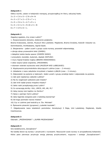 Załącznik 1 Oblicz wyniki, ustaw w kolejności rosnącej, przyporządkuj im litery, odczytaj hasło. 3 x 3 = C 6 x 5 = Z 9 x 9= N 4x3=Z7x2=Z5x7=L 2x5=Z6x3=A7x9=L 5 x 5 = S 3 x 5 = N 10 x 5 = B 6x7=U9x6=L Załącznik 2 Zagaduj-zgadula „Czy znasz Lublin?” 1. Rozpoznawanie obrazów, dobieranie podpisów. Brama Krakowska, Zamek, Muzeum Wsi Lubelskie. Majdanek, Brama Grodzka, Kościół i klasztor oo. Dominikanów, Archikatedra, Ogród Saski. 2. Skojarzenia – jeden uczeń z grupy czyta wyrazy, pozostali odpowiadają. • zbroja obraz przewodnik bilet (ZAMEK) • łabędzie ludzie ławka spacer (OGRÓD SASKI) • prezydent, koziołek, budynek, deptak (RATUSZ) • mury hejnał Kraków trąbka (BRAMA KRAKOWSKA) • obóz wojna ludzie więzienie, (MAJDANEK) • skansen wiatrak wycieczka wieś (MUZEUM WSI LUBELSKIEJ) 3. Wypisywanie przymiotników dotyczących Lublina (czas – 2 minuty). 4. Układanie z nazw zabytków krzyżówki z hasłem LUBLIN (czas – 2 minuty). 5. Odpowiedzi na pytania w balonach. Jeden uczeń z grupy przebija balon i odpowiada na pytanie. 1) Jaki jest najstarszy zabytek Lublina? 2) Na ilu wzgórzach położone jest miasto? 3) Jaki król nadał prawa miejskie miastu? 4) Jakie rzeki przepływają przez Lublin? 5) Co oznaczają skróty: KUL, UMCS, AM, AR, PL? 6) Jaką nazwę nosi kaplica na Zamku? 7) Opisz z pamięci herb Lublina? 8) Jaka legenda związana jest z lubelską kawiarnią? 9) Od kogo pochodzi nazwa miasta? 10) Czy w Lublinie jest kościół p.w. Św. Michała? 6. Śpiewanie piosenki (grupowo) „Lubelski koziołek”. 7. Odgadywanie nazw lubelskich pomników: Konstytucji 3 Maja, Unii Lubelskiej. Majdanek, Józefa Czechowicza. Załącznik 3 Odznaki: „PRZEWODNIK” i „SUPER PRZEWODNIK” Załącznik 4 Gra dydaktyczna „Szczęściarz” Na każdej ławce są wyrazy i przykrywki z wyrazami. Nauczyciel czyta wyrazy w przypadkowej kolejności. Która para pierwsza przykryje swoją planszę przykrywkami, wygrywa i zostaje „Szczęściarzem”. WIDOKÓWKA, MAJDANEK, HEJNALISTA, STARE MIASTO, ZAMEK, OGRÓD SASKI ,TRĄBKA, LEGENDA, HERB, WIEŻA, MUZEUM WSI LUBELSKIEJ, OGRÓD BOTANICZNY, STRÓJ LUBELSKI, RZEKA BYSRZYCA, KOŚCIÓŁ, LUBLIN, TROLEJBUS, HEJNAŁ, TRĄBKA, RYCERZ. załącznik 5 Wanda Chotomska List Weź papieru kartkę białą równym pismem zapisz całą: data, miejscowość po prawej stronie. Po lewej napisz; Szanowny Panie! Najdroższa Mamo! Bracia Kochani! Miły Kolego! lub Droga Pani! Potem już pisać możesz, co chcesz, a co napisać – to sam już wiesz. Kończąc list dodaj: Do zobaczenia, załącz uściski i pozdrowienia. Podpisz się ładnie i list swój złóż, złożony, do koperty włóż.
