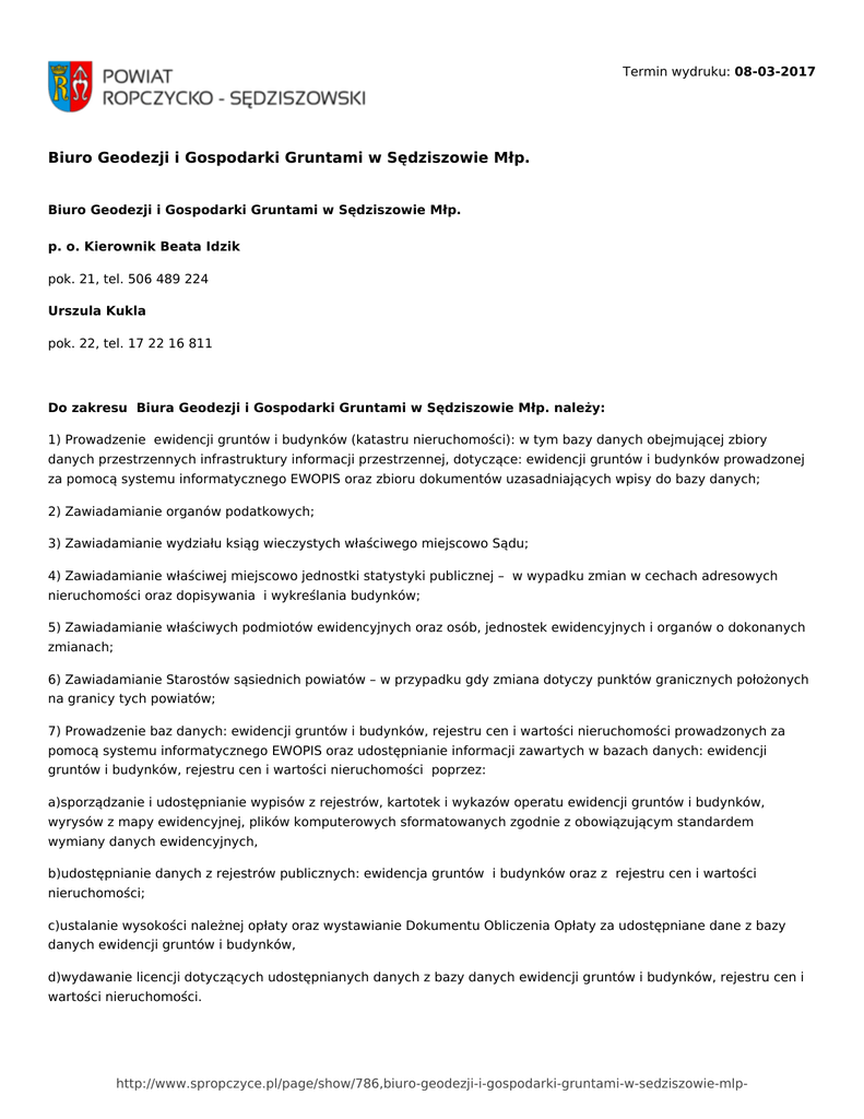 Termin wydruku: 08-03-2017 Biuro Geodezji i Gospodarki Gruntami w Sędziszowie Młp. Biuro Geodezji i Gospodarki Gruntami w Sędziszowie Młp. p. o. Kierownik Beata Idzik pok. 21, tel. 506 489 224 Urszula Kukla pok. 22, tel. 17 22 16 811 Do zakresu Biura Geodezji i Gospodarki Gruntami w Sędziszowie Młp. należy: 1) Prowadzenie ewidencji gruntów i budynków (katastru nieruchomości): w tym bazy danych obejmującej zbiory danych przestrzennych infrastruktury informacji przestrzennej, dotyczące: ewidencji gruntów i budynków prowadzonej za pomocą systemu informatycznego EWOPIS oraz zbioru dokumentów uzasadniających wpisy do bazy danych; 2) Zawiadamianie organów podatkowych; 3) Zawiadamianie wydziału ksiąg wieczystych właściwego miejscowo Sądu; 4) Zawiadamianie właściwej miejscowo jednostki statystyki publicznej – w wypadku zmian w cechach adresowych nieruchomości oraz dopisywania i wykreślania budynków; 5) Zawiadamianie właściwych podmiotów ewidencyjnych oraz osób, jednostek ewidencyjnych i organów o dokonanych zmianach; 6) Zawiadamianie Starostów sąsiednich powiatów – w przypadku gdy zmiana dotyczy punktów granicznych położonych na granicy tych powiatów; 7) Prowadzenie baz danych: ewidencji gruntów i budynków, rejestru cen i wartości nieruchomości prowadzonych za pomocą systemu informatycznego EWOPIS oraz udostępnianie informacji zawartych w bazach danych: ewidencji gruntów i budynków, rejestru cen i wartości nieruchomości poprzez: a)sporządzanie i udostępnianie wypisów z rejestrów, kartotek i wykazów operatu ewidencji gruntów i budynków, wyrysów z mapy ewidencyjnej, plików komputerowych sformatowanych zgodnie z obowiązującym standardem wymiany danych ewidencyjnych, b)udostępnianie danych z rejestrów publicznych: ewidencja gruntów i budynków oraz z rejestru cen i wartości nieruchomości; c)ustalanie wysokości należnej opłaty oraz wystawianie Dokumentu Obliczenia Opłaty za udostępniane dane z bazy danych ewidencji gruntów i budynków, d)wydawanie licencji dotyczących udostępnianych danych z bazy danych ewidencji gruntów i budynków, rejestru cen i wartości nieruchomości. http://www.spropczyce.pl/page/show/786,biuro-geodezji-i-gospodarki-gruntami-w-sedziszowie-mlp- e)wydawanie decyzji administracyjnych w przypadku sporu dotyczącego zakresu udostępnianych danych z baz danych: ewidencji gruntów i budynków, rejestru cen i wartości nieruchomości lub wysokości należnej opłaty; 8)Pozyskiwanie danych niezbędnych do aktualizacji bazy danych ewidencji gruntów i budynków i stosowanie odpowiednich procedur z tym związanych. 9)Wydawanie zaświadczeń z operatu ewidencji gruntów i budynków na wniosek osób o nie się ubiegających. 10) Udostępnianie informacji zawartych w operacie ewidencyjnym w postaci: wypisów z rejestrów, kartotek i wykazów tego operatu, wyrysów z mapy ewidencyjnej, plików komputerowych; 11) Tworzenie, prowadzenie i udostępnianie bazy danych, obejmującej zbiory danych przestrzennych infrastruktury informacji przestrzennej, dotyczące rejestru cen i wartości nieruchomości, sporządzanie i przekazywanie sprawozdań dotyczących rejestru cen i wartości nieruchomości; 12) Opracowywanie procedur i informacji umieszczanych na stronie BIP, oraz na stronie Starostwa Powiatowego w Ropczycach, dotyczących zadań realizowanych przez Referat EGiB; 13) Udzielanie odpowiedzi na zapytania dot. posiadania nieruchomości, w tym przygotowywanie decyzji administracyjnych w zakresie udzielania informacji publicznych dotyczących spraw prowadzonych przez Referat EGiB; 14) Tworzenie, aktualizacja metadanych opisujących zbiory i usługi danych objętych bazami danych, prowadzenie których, należy do zakresu Referatu EGiB; 15) Gromadzenie wyciągów z operatów szacunkowych; 16) Aktualizacja operatu ewidencji gruntów i budynków w części opisowej i graficznej; 17) Prowadzenie postępowań administracyjnych oraz przygotowywanie postanowień i decyzji administracyjnych o dokonanych zmianach w zakresie ewidencji gruntów i budynków; 18) Prowadzenie postępowania wyjaśniającego ze spraw ewidencji gruntów i budynków; publikacja: 07-04-2016 , aktualizacja: 07-04-2016, autor: Wydział WG Arkadiusz Strzyż http://www.spropczyce.pl/page/show/786,biuro-geodezji-i-gospodarki-gruntami-w-sedziszowie-mlp-