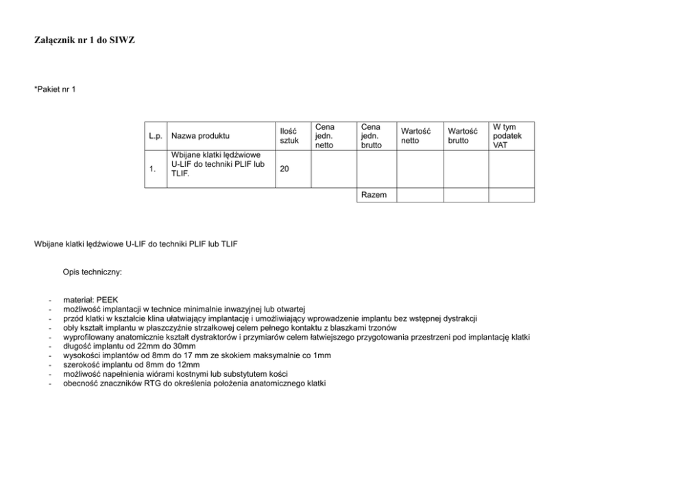 Załącznik nr 1 do SIWZ *Pakiet nr 1 L.p. 1. Nazwa produktu Wbijane klatki lędźwiowe U-LIF do techniki PLIF lub TLIF. Ilość sztuk Cena jedn. netto Cena jedn. brutto Wartość netto Wartość brutto W tym podatek VAT 20 Razem Wbijane klatki lędźwiowe U-LIF do techniki PLIF lub TLIF Opis techniczny: - materiał: PEEK moŜliwość implantacji w technice minimalnie inwazyjnej lub otwartej przód klatki w kształcie klina ułatwiający implantację i umoŜliwiający wprowadzenie implantu bez wstępnej dystrakcji obły kształt implantu w płaszczyźnie strzałkowej celem pełnego kontaktu z blaszkami trzonów wyprofilowany anatomicznie kształt dystraktorów i przymiarów celem łatwiejszego przygotowania przestrzeni pod implantację klatki długość implantu od 22mm do 30mm wysokości implantów od 8mm do 17 mm ze skokiem maksymalnie co 1mm szerokość implantu od 8mm do 12mm moŜliwość napełnienia wiórami kostnymi lub substytutem kości obecność znaczników RTG do określenia połoŜenia anatomicznego klatki *Pakiet nr 2 L.p. 1. Nazwa produktu Klatki międzytrzonowe do stabilizacji odcinka szyjnego Ilość sztuk Cena jedn. netto Cena brutto jedn. Wartość netto Wartość brutto W tym VAT podatek 25 Razem Klatki międzytrzonowe odcinka szyjnego:1 klatka na poziom (wypełniona biometariałem, sterylna) Opis techniczny: - Klatki o kształcie prostopadłościennym, do stabilizacji międzytrzonowej kręgosłupa szyjnego, wypełnione biomateriałem, sterylne. Klatki wykonane z PEEK, bez elementów metalowych uniemoŜliwiających wykonanie badań CT, MRI. Klatki z trzema tytanowymi znacznikami radiologicznymi ułatwiającymi ocenę połoŜenia klatki w przestrzeni miedzytrzonowej. Klatki z otworem centralnym wypełnionym biomateriałem – czysty B-trójfosforan wapnia Klatki odtwarzające lordozę szyjną. W zestawie klatki klinowe oraz zakrzywione, w celu lepszego dopasowania do anatomii kręgów szyjnych. Powierzchnia klatki ząbkowana zapobiegająca migracji implantu. Klatki o wysokości 5-10mm (stopniowane co 1mm) i głębokości 12,5mm. W zestawie implanty próbne umoŜliwiające odpowiedni dobór właściwego rozmiaru klatki. W zestawie ogranicznik głębokości dla implantów próbnych i właściwych. Narzędzia dostarczane w specjalnej kasecie przeznaczonej do ich przechowywania i sterylizacji. Czas realizacji zamówienia (dostarczenia na blok operacyjny) – do 2 dni roboczych od zamówienia telefonicznego *Pakiet nr 3 L.p . Nazwa produktu Ilość sztuk 1. Płytka szyjna do stabilizacji kręgosłupa szyjnego z dostępu przedniego + 4 śruby 15 Cena jedn. netto Cena jedn. brutto Wartość netto Wartość brutto W tym podatek VAT Wymienić wszystkie elementy, które wchodzą w skład kompletu i podać cenę netto kaŜdego Razem Stabilizacja przednia odcinka szyjnego płytą dynamiczną zestaw: 1 płytka szyjna, 4 wkręty kostne - Płyty tytanowe od jedno do wielosegmentowych Standardowo dostępne w rozmiarach 23-109 mm, stopniowane co 2mm Szeroki otwór/otwory centralne w płytce poprawiające widoczność przestrzeni poza płytką Śruby dynamiczne, samowwiercające, jedno- i wieloosiowe Śruby długości 12 i 18 mm , średnicy 4,0 i 4,5 mm (typy śrub kodowane kolorami) MoŜliwość jedno – i wielokątowego ustawienia śrub (28 stopni) MoŜliwość wykonania stabilizacji hybrydowej (moŜliwość stosowania równocześnie śrub jedno- i wieloosiowych) Płytki niskoprofilowe – wysokość płytki wraz z zablokowanymi śrubami nie przekraczająca 2,5mm Samoczynna blokada śruby w płytce, wbudowana w otwór płytki (brak dodatkowych elementów blokujących oraz elementów wystających ponad otwory płytki). Mechanizm blokowania śruby w płytce z moŜliwością powtórzenia Płytki wstępnie dogięte. MoŜliwość zmiany krzywizny płytki bez utraty moŜliwości blokady śrub. Specjalne zagłębienia na spodzie płytki ułatwiające jej doginanie. Instrumentarium umoŜliwiające odpowiednie ustawienie płytki (w zestawie szpile fiksacyjne) Instrumentarium pozwalające na bezpieczne, centralne umieszczenie śrub w otworach (specjalne szydło do przekłuwania kości korowej trzonów, celownik do śrub jedno- i wieloosiowych) W instrumentarium narzędzie do doginania płytek (wyginarka z moŜliwością gięcia płytek na krótkim odcinku) W instrumentarium śrubokręty w podwójnym powtórzeniu Zestaw zawierający narzędzia do ewentualnej ekstrakcji śrub Instrumentarium i implanty w kontenerze przeznaczonym do przechowywania i sterylizacji Czas realizacji zamówienia (dostarczenia na blok operacyjny) – do 2 dni roboczych od zamówienia telefonicznego *Pakiet nr 4 L.p. Nazwa produktu Ilość sztuk Cena jedn. netto Cena jedn. brutto Wartość netto Wartość brutto W tym podatek VAT Wymienić wszystkie elementy, które wchodzą w skład kompletu i podać cenę netto kaŜdego System do wertebroplastyki 1. - zestaw do wertebroplastyki z igłą cement do wertebroplastyki igła do wertebroplastyki mieszalnik do cementu 20 40 40 20 Razem Opis techniczny: Skład standardowego zestawu do zaopatrzenia jednego poziomu: · igła do wertebroplastyki z mandrynem - 1 szt. · giętki przewód łączący ze złączem typ luer - 1 szt. · podajnik do cementu z tłokiem, poj. 10 ml - 1 szt. · przybory do mieszania cementu - 1 kpl · cement do wertebroplastyki 12,5 g / 5 ml - pełna kontrola procesu podawania cementu ze śrubowym mechanizmem tłokowym posiadającym bezpiecznik umoŜliwiający natychmiastowe - zatrzymanie podawania i odbarczenie w czasie trwania zabiegu - moŜliwość wykonywania zabiegów pod pełną kontrolą RTG – giętki przewód łączący - zestawy jednorazowe dostępne z igłami o dwóch średnicach i dwóch długościach - dodatkowe igły jednorazowe dostępne w dwóch średnicach i dwóch długościach - dostępne dodatkowe mieszalniki do przygotowania cementu przed podawaniem - cement kostny o niskiej lepkości z kontrastem, o przedłuŜonym czasie aplikacji powy