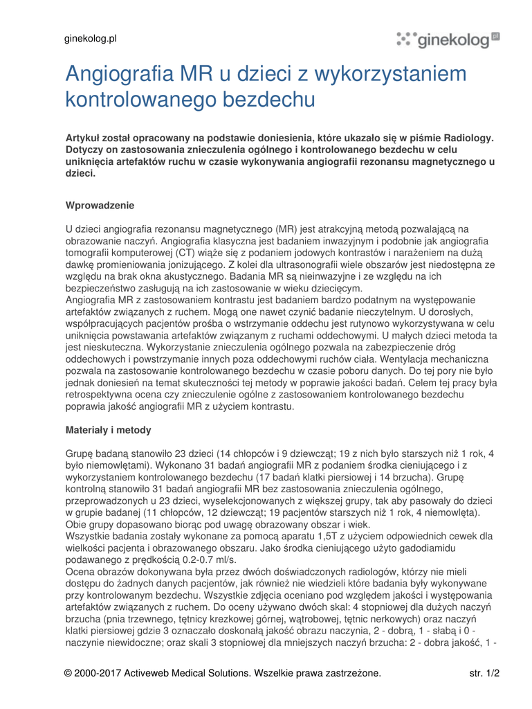 ginekolog.pl Angiografia MR u dzieci z wykorzystaniem kontrolowanego bezdechu Artykuł został opracowany na podstawie doniesienia, które ukazało się w piśmie Radiology. Dotyczy on zastosowania znieczulenia ogólnego i kontrolowanego bezdechu w celu uniknięcia artefaktów ruchu w czasie wykonywania angiografii rezonansu magnetycznego u dzieci. Wprowadzenie U dzieci angiografia rezonansu magnetycznego (MR) jest atrakcyjną metodą pozwalającą na obrazowanie naczyń. Angiografia klasyczna jest badaniem inwazyjnym i podobnie jak angiografia tomografii komputerowej (CT) wiąże się z podaniem jodowych kontrastów i narażeniem na dużą dawkę promieniowania jonizującego. Z kolei dla ultrasonografii wiele obszarów jest niedostępna ze względu na brak okna akustycznego. Badania MR są nieinwazyjne i ze względu na ich bezpieczeństwo zasługują na ich zastosowanie w wieku dziecięcym. Angiografia MR z zastosowaniem kontrastu jest badaniem bardzo podatnym na występowanie artefaktów związanych z ruchem. Mogą one nawet czynić badanie nieczytelnym. U dorosłych, współpracujących pacjentów prośba o wstrzymanie oddechu jest rutynowo wykorzystywana w celu uniknięcia powstawania artefaktów związanym z ruchami oddechowymi. U małych dzieci metoda ta jest nieskuteczna. Wykorzystanie znieczulenia ogólnego pozwala na zabezpieczenie dróg oddechowych i powstrzymanie innych poza oddechowymi ruchów ciała. Wentylacja mechaniczna pozwala na zastosowanie kontrolowanego bezdechu w czasie poboru danych. Do tej pory nie było jednak doniesień na temat skuteczności tej metody w poprawie jakości badań. Celem tej pracy była retrospektywna ocena czy znieczulenie ogólne z zastosowaniem kontrolowanego bezdechu poprawia jakość angiografii MR z użyciem kontrastu. Materiały i metody Grupę badaną stanowiło 23 dzieci (14 chłopców i 9 dziewcząt; 19 z nich było starszych niż 1 rok, 4 było niemowlętami). Wykonano 31 badań angiografii MR z podaniem środka cieniującego i z wykorzystaniem kontrolowanego bezdechu (17 badań klatki piersiowej i 14 brzucha). Grupę kontrolną stanowiło 31 badań angiografii MR bez zastosowania znieczulenia ogólnego, przeprowadzonych u 23 dzieci, wyselekcjonowanych z większej grupy, tak aby pasowały do dzieci w grupie badanej (11 chłopców, 12 dziewcząt; 19 pacjentów starszych niż 1 rok, 4 niemowlęta). Obie grupy dopasowano biorąc pod uwagę obrazowany obszar i wiek. Wszystkie badania zostały wykonane za pomocą aparatu 1,5T z użyciem odpowiednich cewek dla wielkości pacjenta i obrazowanego obszaru. Jako środka cieniującego użyto gadodiamidu podawanego z prędkością 0.2-0.7 ml/s. Ocena obrazów dokonywana była przez dwóch doświadczonych radiologów, którzy nie mieli dostępu do żadnych danych pacjentów, jak również nie wiedzieli które badania były wykonywane przy kontrolowanym bezdechu. Wszystkie zdjęcia oceniano pod względem jakości i występowania artefaktów związanych z ruchem. Do oceny używano dwóch skal: 4 stopniowej dla dużych naczyń brzucha (pnia trzewnego, tętnicy krezkowej górnej, wątrobowej, tętnic nerkowych) oraz naczyń klatki piersiowej gdzie 3 oznaczało doskonałą jakość obrazu naczynia, 2 - dobrą, 1 - słabą i 0 naczynie niewidoczne; oraz skali 3 stopniowej dla mniejszych naczyń brzucha: 2 - dobra jakość, 1 © 2000-2017 Activeweb Medical Solutions. Wszelkie prawa zastrzeżone. str. 1/2 ginekolog.pl słaba, 0 naczynie niewidoczne. Radiolodzy za pomocą tych dwóch skal oceniali w sumie 10 segmentów naczyniowych. Wyniki U żadnego z pacjentów, który poddany został znieczuleniu ogólnemu, nie wystąpiły za równo w czasie bezdechu jak i z powodu znieczulenia objawy niepożądane. W grupie badanej z bezdechem jakość 97% zdjęć została oceniona jako doskonała, podczas gdy w grupie kontrolnej 29%. Artefakty spowodowane ruchem były nieobecne w 97% badanych z bezdechem, natomiast stwierdzono je w 87% badaniach przeprowadzonych bez bezdechu. Ostrość naczyń i ich odgraniczenie było znamiennie lepsze w grupie badanej z bezdechem. W badaniach obejmujących brzuch oceniano 140 segmentów naczyniowych. W grupie badanej z bezdechem 97% segmentów zostało ocenione na widoczne doskonale lub dobrze, a tylko 3% jako słabe. W grupie kontrolnej 17% segmentów uznano za niewidoczne, 21% słabo widoczne, 61% doskonale lub dobrze widoczne. W grupie kontrolnej jakość obrazowania naczyń pogarszała się wraz ze zmniejszeniem ich kalibru, podczas gdy w grupie badanej pozostawała bardzo dobra daleko ku obwodowi. Podsumowanie Wyniki tego badania pokazały że u dzieci wykorzystanie kontrolowanego bezdechu w angiografii MR z użyciem środka cieniującego znacznie poprawia jakość wykonywanych badań. Artefakty związane z ruchem oddechowym, jak się okazało, mogą bardzo poważnie zaburzać jakość badania a są jednocześnie łatwe do wyeliminowania poprzez zastosowanie znieczulenia ogólnego i kontrolowanego bezdechu. © 2000-2017 Activeweb Medical Solutions. Wszelkie prawa zastrzeżone. str. 2/2