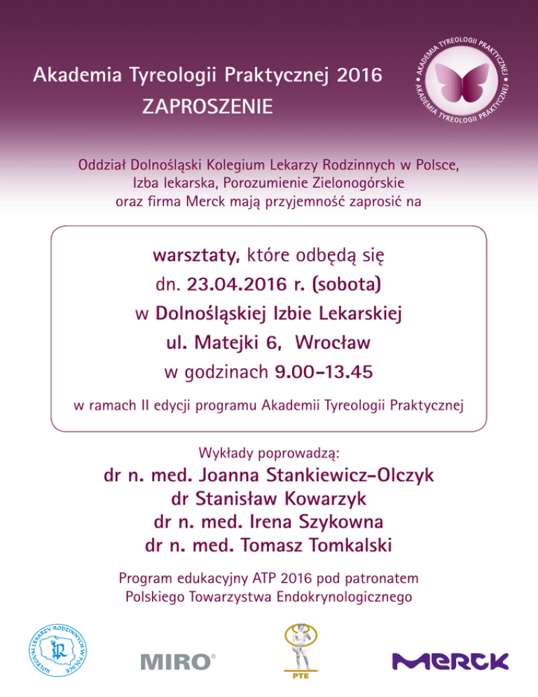Akademia Tyreologii Praktycznej 2016 ZAPROSZENIE Oddział Dolnośląski Kolegium Lekarzy Rodzinnych w Polsce, Izba lekarska, Porozumienie Zielonogórskie oraz firma Merck mają przyjemność zaprosić na warsztaty, które odbędą się dn. 23.04.2016 r. (sobota) w Dolnośląskiej Izbie Lekarskiej ul. Matejki 6, Wrocław w godzinach 9.00-13.45 w ramach II edycji programu Akademii Tyreologii Praktycznej Wykłady poprowadzą: dr n. med. Joanna Stankiewicz-Olczyk dr Stanisław Kowarzyk dr n. med. Irena Szykowna dr n. med. Tomasz Tomkalski Program edukacyjny ATP 2016 pod patronatem Polskiego Towarzystwa Endokrynologicznego Agenda spotkania: 09.45 - 10.15 Wpływ lekarza rodzinnego na rokowanie pacjenta ze stanem przedcukrzycowym 10.15 - 11.00 Jawna niedoczynność tarczycy – od diagnozy do leczenia 11.00 - 11.10 Przerwa kawowa 11.10 - 11.40 Pacjent z subkliniczną niedoczynnością tarczycy w gabinecie lekarza rodzinnego 11.40 - 12.05 Guzki tarczycy – klinika i diagnostyka 12.05 - 13.05 Interpretacja USG tarczycy w praktyce lekarza rodzinnego 13.05 - 13.15 Prezentacja firmy Miro 13.15 - 13.45 Warsztaty USG dla lekarzy POZ 13.45 Poczęstunek Uprzejmie proszę o obowiązkowe potwierdzenie uczestnictwa w szkoleniu do dnia 20.04.2016 r. telefonicznie lub SMS u Filipa Jankowskiego: 662 183 030 oraz u Mateusza Stolarczyka: 692 475 306 Eut201512DB41 09.00 - 09.45 Pacjent z niedoczynnością tarczycy i powikłaniami sercowo-naczyniowymi