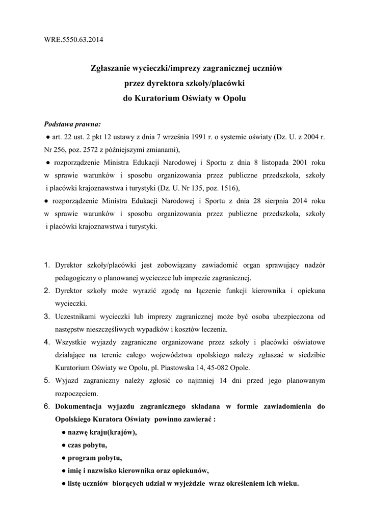WRE.5550.63.2014 Zgłaszanie wycieczki/imprezy zagranicznej uczniów przez dyrektora szkoły/placówki do Kuratorium Oświaty w Opolu Podstawa prawna: ● art. 22 ust. 2 pkt 12 ustawy z dnia 7 września 1991 r. o systemie oświaty (Dz. U. z 2004 r. Nr 256, poz. 2572 z późniejszymi zmianami), ● rozporządzenie Ministra Edukacji Narodowej i Sportu z dnia 8 listopada 2001 roku w sprawie warunków i sposobu organizowania przez publiczne przedszkola, szkoły i placówki krajoznawstwa i turystyki (Dz. U. Nr 135, poz. 1516), ● rozporządzenie Ministra Edukacji Narodowej i Sportu z dnia 28 sierpnia 2014 roku w sprawie warunków i sposobu organizowania przez publiczne przedszkola, szkoły i placówki krajoznawstwa i turystyki. 1. Dyrektor szkoły/placówki jest zobowiązany zawiadomić organ sprawujący nadzór pedagogiczny o planowanej wycieczce lub imprezie zagranicznej. 2. Dyrektor szkoły może wyrazić zgodę na łączenie funkcji kierownika i opiekuna wycieczki. 3. Uczestnikami wycieczki lub imprezy zagranicznej może być osoba ubezpieczona od następstw nieszczęśliwych wypadków i kosztów leczenia. 4. Wszystkie wyjazdy zagraniczne organizowane przez szkoły i placówki oświatowe działające na terenie całego województwa opolskiego należy zgłaszać w siedzibie Kuratorium Oświaty we Opolu, pl. Piastowska 14, 45-082 Opole. 5. Wyjazd zagraniczny należy zgłosić co najmniej 14 dni przed jego planowanym rozpoczęciem. 6. Dokumentacja wyjazdu zagranicznego składana w formie zawiadomienia do Opolskiego Kuratora Oświaty powinno zawierać : ● nazwę kraju(krajów), ● czas pobytu, ● program pobytu, ● imię i nazwisko kierownika oraz opiekunów, ● listę uczniów biorących udział w wyjeździe wraz określeniem ich wieku. Uwagi: ● dla zapewnienia prawidłowej opieki nad dziećmi i młodzieżą biorącą udział w wycieczce/imprezie zagranicznej dyrektor szkoły/placówki wyznacza kierownika oraz opiekunów, których liczba uzależniona jest od wieku i liczby uczestników, miejsca wycieczki, rodzaju środka lokomocji, ● wskazana jest znajomość języka obcego przez kierownika lub opiekunów w stopniu umożliwiającym porozumieniem się w kraju docelowym, jak również w krajach znajdujących się na trasie wycieczki/imprezy, szczególnie wtedy kiedy grupie nie towarzyszy pilot wycieczki, ● uczniowie nie mogą przekraczać granicy państwowej na podstawie legitymacji szkolnej. Dokumentami uprawniającymi przekroczenie granicy państwowej są: paszport lub dowód osobisty, ● należy pamiętać o konieczności opracowania przez kierownika, regulaminu wycieczki/imprezy. Opolski Wicekurator Oświaty Rafał Rippel