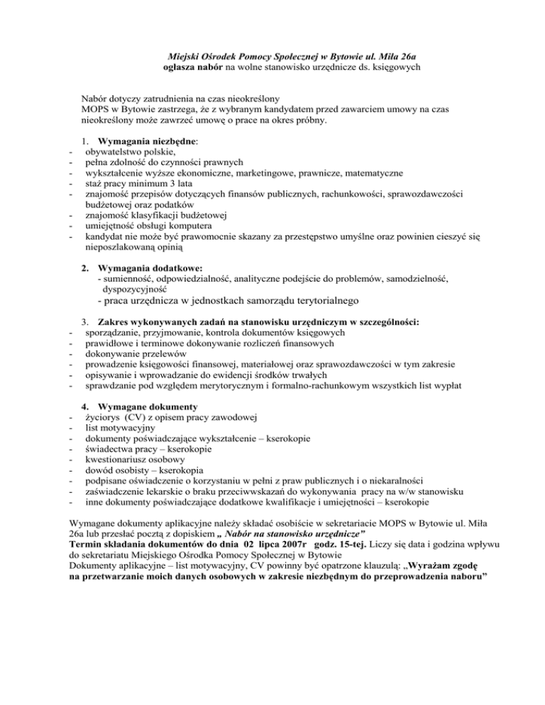 Miejski Ośrodek Pomocy Społecznej w Bytowie ul. Miła 26a ogłasza nabór na wolne stanowisko urzędnicze ds. księgowych Nabór dotyczy zatrudnienia na czas nieokreślony MOPS w Bytowie zastrzega, Ŝe z wybranym kandydatem przed zawarciem umowy na czas nieokreślony moŜe zawrzeć umowę o prace na okres próbny. 1. Wymagania niezbędne: obywatelstwo polskie, pełna zdolność do czynności prawnych wykształcenie wyŜsze ekonomiczne, marketingowe, prawnicze, matematyczne staŜ pracy minimum 3 lata znajomość przepisów dotyczących finansów publicznych, rachunkowości, sprawozdawczości budŜetowej oraz podatków - znajomość klasyfikacji budŜetowej - umiejętność obsługi komputera - kandydat nie moŜe być prawomocnie skazany za przestępstwo umyślne oraz powinien cieszyć się nieposzlakowaną opinią - 2. Wymagania dodatkowe: - sumienność, odpowiedzialność, analityczne podejście do problemów, samodzielność, dyspozycyjność - praca urzędnicza w jednostkach samorządu terytorialnego - 3. Zakres wykonywanych zadań na stanowisku urzędniczym w szczególności: sporządzanie, przyjmowanie, kontrola dokumentów księgowych prawidłowe i terminowe dokonywanie rozliczeń finansowych dokonywanie przelewów prowadzenie księgowości finansowej, materiałowej oraz sprawozdawczości w tym zakresie opisywanie i wprowadzanie do ewidencji środków trwałych sprawdzanie pod względem merytorycznym i formalno-rachunkowym wszystkich list wypłat - 4. Wymagane dokumenty Ŝyciorys (CV) z opisem pracy zawodowej list motywacyjny dokumenty poświadczające wykształcenie – kserokopie świadectwa pracy – kserokopie kwestionariusz osobowy dowód osobisty – kserokopia podpisane oświadczenie o korzystaniu w pełni z praw publicznych i o niekaralności zaświadczenie lekarskie o braku przeciwwskazań do wykonywania pracy na w/w stanowisku inne dokumenty poświadczające dodatkowe kwalifikacje i umiejętności – kserokopie Wymagane dokumenty aplikacyjne naleŜy składać osobiście w sekretariacie MOPS w Bytowie ul. Miła 26a lub przesłać pocztą z dopiskiem „ Nabór na stanowisko urzędnicze” Termin składania dokumentów do dnia 02 lipca 2007r godz. 15-tej. Liczy się data i godzina wpływu do sekretariatu Miejskiego Ośrodka Pomocy Społecznej w Bytowie Dokumenty aplikacyjne – list motywacyjny, CV powinny być opatrzone klauzulą: „WyraŜam zgodę na przetwarzanie moich danych osobowych w zakresie niezbędnym do przeprowadzenia naboru”
