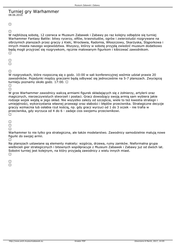 Muzeum Zabawek i Zabawy Turniej gry Warhammer 08.06.2010. W najbliższą sobotę, 12 czerwca w Muzeum Zabawek i Zabawy po raz kolejny odbędzie się turniej Warhammer Fantasy Battle: bitwy rycerzy, elfów, krasnoludów, ogrów i zwierzoludzi rozgrywane na olbrzymich planszach przez graczy z Kielc, Wrocławia, Radomia, Włoszczowy, Skarżyska, Stąporkowa i innych miasta naszego województwa. Wszyscy, którzy w sobotę przyjdą zwiedzić muzeum dodatkowo będą mogli przyjrzeć się rozgrywkom, ręcznie malowanym figurkom i kibicować zawodnikom. W rozgrywkach, które rozpoczną się o godz. 10:00 w sali konferencyjnej weźmie udział prawie 20 zawodników. Pojedynki między graczami będą odbywać się jednocześnie na 5-7 planszach. Zwycięzcę turnieju poznamy około godz. 17:00. W grze Warhammer zawodnicy walczą armiami figurek składających się z żołnierzy, artylerii oraz magicznych, nierzeczywistych stworzeń i postaci. Gracz dowodzący swoją armią sam wybiera jakie rodzaje wojsk wejdą w jego skład. Nie wszystko zależy od szczęścia, wiele to też kwestia strategii i umiejętności, wykorzystania własnej przewagi oraz słabości i błędów przeciwnika. Strategiczne decyzje graczy wzmacnia lub osłabia rzut kością, np. gdy gracz wyrzuci od 1 do 3 oczek - nie trafia w przeciwnika, gdy wyrzuca od 4 do 6 - zadaje cios swojemu przeciwnikowi. Warhammer to nie tylko gra strategiczna, ale także modelarstwo. Zawodnicy samodzielnie malują nowe figurki do swojej armii. Na planszach ustawiane są elementy makiety: wzgórza, drzewa, ruiny zamków. Nieformalna grupa wielbicieli gier strategicznych i bitewnych współpracuje z Muzeum Zabawek i Zabawy już od dwóch lat. Sobotni turniej jest kolejnym, na który przyjadą zawodnicy z wielu innych miast. http://www.arch.muzeumzabawek.eu Kreator PDF Utworzono 8 March, 2017, 14:05