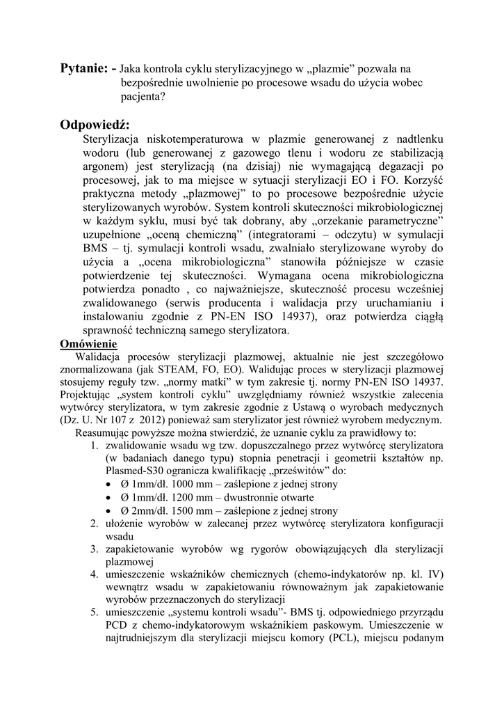Pytanie: - Jaka kontrola cyklu sterylizacyjnego w „plazmie” pozwala na bezpośrednie uwolnienie po procesowe wsadu do użycia wobec pacjenta? Odpowiedź: Sterylizacja niskotemperaturowa w plazmie generowanej z nadtlenku wodoru (lub generowanej z gazowego tlenu i wodoru ze stabilizacją argonem) jest sterylizacją (na dzisiaj) nie wymagającą degazacji po procesowej, jak to ma miejsce w sytuacji sterylizacji EO i FO. Korzyść praktyczna metody „plazmowej” to po procesowe bezpośrednie użycie sterylizowanych wyrobów. System kontroli skuteczności mikrobiologicznej w każdym syklu, musi być tak dobrany, aby „orzekanie parametryczne” uzupełnione „oceną chemiczną” (integratorami – odczytu) w symulacji BMS – tj. symulacji kontroli wsadu, zwalniało sterylizowane wyroby do użycia a „ocena mikrobiologiczna” stanowiła późniejsze w czasie potwierdzenie tej skuteczności. Wymagana ocena mikrobiologiczna potwierdza ponadto , co najważniejsze, skuteczność procesu wcześniej zwalidowanego (serwis producenta i walidacja przy uruchamianiu i instalowaniu zgodnie z PN-EN ISO 14937), oraz potwierdza ciągłą sprawność techniczną samego sterylizatora. Omówienie Walidacja procesów sterylizacji plazmowej, aktualnie nie jest szczegółowo znormalizowana (jak STEAM, FO, EO). Walidując proces w sterylizacji plazmowej stosujemy reguły tzw. „normy matki” w tym zakresie tj. normy PN-EN ISO 14937. Projektując „system kontroli cyklu” uwzględniamy również wszystkie zalecenia wytwórcy sterylizatora, w tym zakresie zgodnie z Ustawą o wyrobach medycznych (Dz. U. Nr 107 z 2012) ponieważ sam sterylizator jest również wyrobem medycznym. Reasumując powyższe można stwierdzić, że uznanie cyklu za prawidłowy to: 1. zwalidowanie wsadu wg tzw. dopuszczalnego przez wytwórcę sterylizatora (w badaniach danego typu) stopnia penetracji i geometrii kształtów np. Plasmed-S30 ogranicza kwalifikację „prześwitów” do: Ø 1mm/dł. 1000 mm – zaślepione z jednej strony Ø 1mm/dł. 1200 mm – dwustronnie otwarte Ø 2mm/dł. 1500 mm – zaślepione z jednej strony 2. ułożenie wyrobów w zalecanej przez wytwórcę sterylizatora konfiguracji wsadu 3. zapakietowanie wyrobów wg rygorów obowiązujących dla sterylizacji plazmowej 4. umieszczenie wskaźników chemicznych (chemo-indykatorów np. kl. IV) wewnątrz wsadu w zapakietowaniu równoważnym jak zapakietowanie wyrobów przeznaczonych do sterylizacji 5. umieszczenie „systemu kontroli wsadu”- BMS tj. odpowiedniego przyrządu PCD z chemo-indykatorowym wskaźnikiem paskowym. Umieszczenie w najtrudniejszym dla sterylizacji miejscu komory (PCL), miejscu podanym przez wytwórcę, a szczególnie w miejscu, w którym do tej pory bywały odczyty (+) BI, np. tył komory lewy 6. umieszczenie wskaźnika biologicznego w zapakietowaniu minimum takim jak wyroby wsadu, w najtrudniejszym miejscu krytycznym komory wyznaczonym przez wytwórcę, lub 2 wskaźniki tj. drugi w miejscu dotychczas obserwowanym za najbardziej krytyczne. 7. przeprowadzenie procesu i odczytanie wskaźników chemicznych w czasie zgodnym z zaleceniami ich wytwórcy (wg normy PN-EN ISO 15882) 8. odczytanie: zapisów parametrów fizycznych przebiegu cyklu za prawidłowe testów chemicznych (szczególnie z „systemu kontroli wsadu”) za prawidłowe sprawdzenie barierowości po procesowej stanu pakietów i określenie jej za prawidłową pozwala na zwolnienie do użycia (zwolnienie parametryczne) 9. potwierdzenie prawidłowości cyklu i uznanie ostateczne sprawności urządzenia i danego procesu, dostarcza odczyt z bioindykatora (wg PN-EN ISO 14161). BI posiada swą charakterystykę działania i ona musi być kompatybilna z charakterystyką procesu, należy więc stosować właściwy wskaźnik biologiczny w wersji tzw. „nagi” lub „osłoniony” do właściwego procesu. Uwaga! Wskaźnik biologiczny wykazujący wzrost po sterylizacji, wskazuje niepowodzenie procesu, tylko jeśli charakterystyka oporności systemu wskaźnika biologicznego jest właściwa dla systemu sterylizacji (PN-EN ISO 14161 str. 43 p.10.2). Dr Barbara Waszak 29.01.2015.