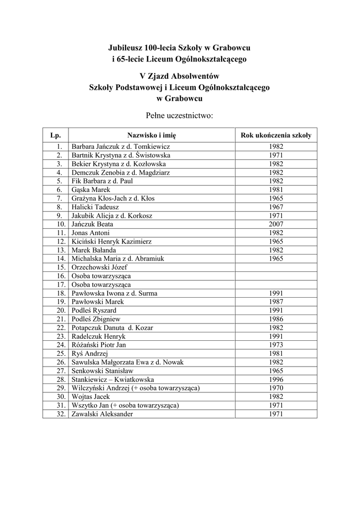 Jubileusz 100-lecia Szkoły w Grabowcu i 65-lecie Liceum Ogólnokształcącego V Zjazd Absolwentów Szkoły Podstawowej i Liceum Ogólnokształcącego w Grabowcu Pełne uczestnictwo: Lp. 1. 2. 3. 4. 5. 6. 7. 8. 9. 10. 11. 12. 13. 14. 15. 16. 17. 18. 19. 20. 21. 22. 23. 24. 25. 26. 27. 28. 29. 30. 31. 32. Nazwisko i imię Barbara Jańczuk z d. Tomkiewicz Bartnik Krystyna z d. Świstowska Bekier Krystyna z d. Kozłowska Demczuk Zenobia z d. Magdziarz Fik Barbara z d. Paul Gąska Marek GraŜyna Kłos-Jach z d. Kłos Halicki Tadeusz Jakubik Alicja z d. Korkosz Jańczuk Beata Jonas Antoni Kiciński Henryk Kazimierz Marek Bałanda Michalska Maria z d. Abramiuk Orzechowski Józef Osoba towarzysząca Osoba towarzysząca Pawłowska Iwona z d. Surma Pawłowski Marek Podleś Ryszard Podleś Zbigniew Potapczuk Danuta d. Kozar Radelczuk Henryk RóŜański Piotr Jan Ryś Andrzej Sawulska Małgorzata Ewa z d. Nowak Senkowski Stanisław Stankiewicz – Kwiatkowska Wilczyński Andrzej (+ osoba towarzysząca) Wojtas Jacek Wszytko Jan (+ osoba towarzysząca) Zawalski Aleksander Rok ukończenia szkoły 1982 1971 1982 1982 1982 1981 1965 1967 1971 2007 1982 1965 1982 1965 1991 1987 1991 1986 1982 1991 1973 1981 1982 1965 1996 1970 1982 1971 1971 Udział w części oficjalnej uroczystości: Lp. 1. 2. 3. 4. 5. 6. 7. 8. 9. 10. 11. 12. 13. 14. 15. 16. 17. 18. 19. 20. 21. 22. 23. 24. 25. 26. 27. 28. 29. 30. 31. 32. 33. 34. 35. 36. 37. 38. 39. 40. 41. 42. 43. Nazwisko i imię Bekier Piotr Ciszewska Kąkol Janina Czausz Krystyna Czausz Krystyna Ćwik Krystyna Domańska Irena z d. Chuszcz Goździejewski Piotr Goździejewski Tadeusz Greniuk Waldemar Harasim Ewa z d. Florek Hawryluk Izabela Jędruszczak Jerzy Jędruszczak Jadwiga z d. Trześniowska Jędruszczak Małgorzata Klain Krystyna z d. Bełzecka Kocaj Janina Kordowska Teresa z d. Pietnowska Krupa Wanda Teresa z d. Szewc Ks. Chilewicz Andrzej Ks. Hawro Krzysztof Ks. Józef Bednarski Ks. Majcher Piotr Paweł Ks. Marian Kaczmara Ks. Marian Oszust Ks. Mirosław Prokop Ks. Ryszard Siedlecki Litwin Agnieszka Lucyna Kozar Malinowska Dorota z d. Margol Marta Mostowska z d. Kamieniecka Marzec Barbara z d. Mieczan Materna Andrzej Minnik Józef Nawrot Alicja Maria Nowicki Hieronim Ornat Grzegorz Pawłowska Teresaz d. Prystupa Pedowski Władysław Prystupa Ireneusz Rachańska Agnieszka z d. Tokarz Sieczkowska – Antończak Marianna Tadeusz Kozar Teresińska Teresa Rok ukończenia szkoły 1968 1968 1969 1967 1999 1979 1975 1993 1956 1963 2003 1975 1966 1979 1971 1996 1985 1991 1977 1985 1984 1995 1966 1983 1987 1978 1975 1966 1967 1977 1971 1977 1982 1997 1987 44. 45. 46. 47. 48. Teresiński Waldemar Trybalski Kazimierz Wójcik Michalina Zając /Mazur/ Marta Zierebiec Teresa 1987 1965 1964 1994 Nauczyciele i pracownicy szkoły absolwenci liceum: 1. 2. 3. 4. 5. 6. 7. 8. 9. 10. 11. 12. 13. 14. 15. 16. 17. 18. 19. 20. 21. 22. 23. 24. 25. Bednarczuk Zofia z d. Ulanowska Chilewicz Aleksandra z d. Król Danilczuk Anna z d. Samulak Danilczuk ElŜbieta z d. Orzechowska Diduch Dorota z d. Sakowicz Greniuk Zofia z d. Szostakiewicz Hołosyniuk Wojciech Jałowicka Agnieszka z d. Jędruszczak Kondrat Barbara z d. Szczuka Mandziuk Anna z d. Jaroszyńska Marnik Lucyna z d. Steć Nowak Barbara z d. Łatka Panas Mirosława z d. Grela Pawłowska Maria z d. Łukowiec Pedowska Hanna z d. Pyra Pieczykolan Jarosław Pieczykolan Renata z d. Sawiniec Pomazanka ElŜbieta z d. Potkańska Radelczuk Ewa z d. Mieczan Sagadyn Radosław Steć Magda z d. Pieczykolan Swatko ElŜbieta z d. Świętoniewska Widyma ElŜbieta z d. Lisiuk Wróbel Krystyna z d. Grechuta Zienkiewicz Krystyna 1986 2006 2000 1979 1993 1980 1984 1998 1983 2000 1981 1984 1983 1988 1982 1983 1990 1983 1989 1985 2011 1980 1991 1980 1984