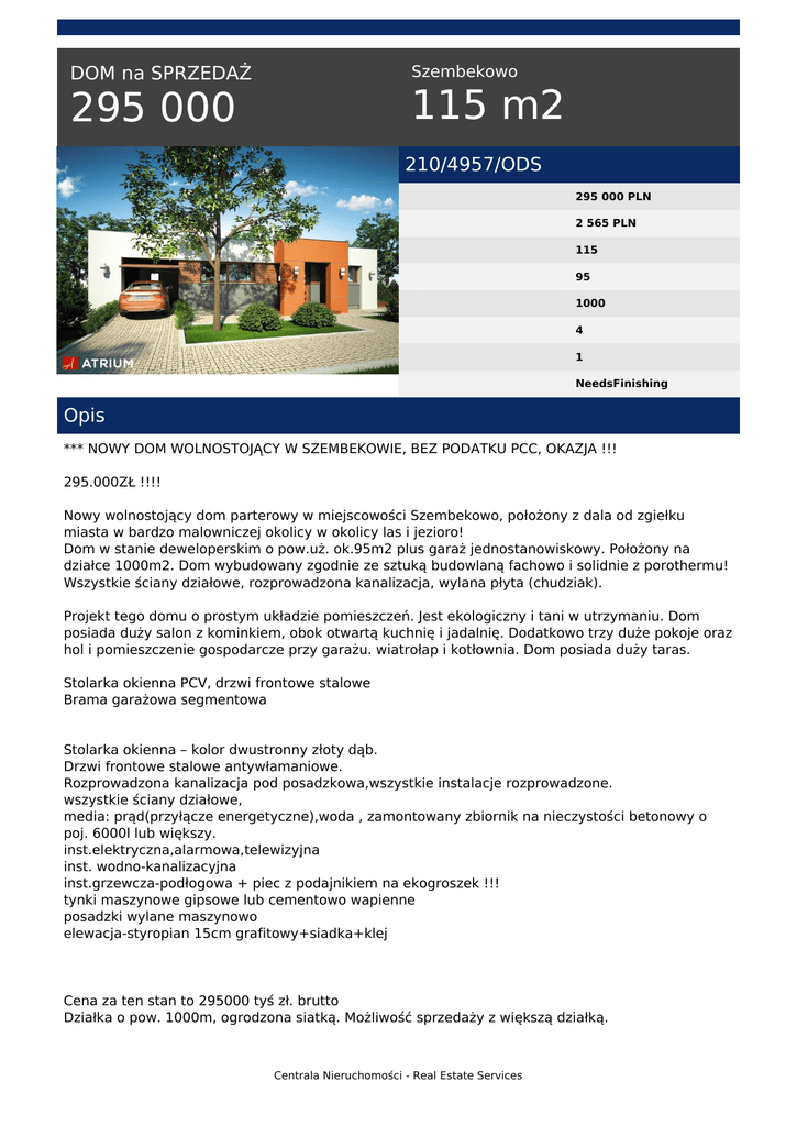 Szembekowo DOM na SPRZEDAŻ 115 m2 295 000 210/4957/ODS 295 000 PLN 2 565 PLN 115 95 1000 4 1 NeedsFinishing Opis *** NOWY DOM WOLNOSTOJĄCY W SZEMBEKOWIE, BEZ PODATKU PCC, OKAZJA !!! 295.000ZŁ !!!! Nowy wolnostojący dom parterowy w miejscowości Szembekowo, położony z dala od zgiełku miasta w bardzo malowniczej okolicy w okolicy las i jezioro! Dom w stanie deweloperskim o pow.uż. ok.95m2 plus garaż jednostanowiskowy. Położony na działce 1000m2. Dom wybudowany zgodnie ze sztuką budowlaną fachowo i solidnie z porothermu! Wszystkie ściany działowe, rozprowadzona kanalizacja, wylana płyta (chudziak). Projekt tego domu o prostym układzie pomieszczeń. Jest ekologiczny i tani w utrzymaniu. Dom posiada duży salon z kominkiem, obok otwartą kuchnię i jadalnię. Dodatkowo trzy duże pokoje oraz hol i pomieszczenie gospodarcze przy garażu. wiatrołap i kotłownia. Dom posiada duży taras. Stolarka okienna PCV, drzwi frontowe stalowe Brama garażowa segmentowa Stolarka okienna – kolor dwustronny złoty dąb. Drzwi frontowe stalowe antywłamaniowe. Rozprowadzona kanalizacja pod posadzkowa,wszystkie instalacje rozprowadzone. wszystkie ściany działowe, media: prąd(przyłącze energetyczne),woda , zamontowany zbiornik na nieczystości betonowy o poj. 6000l lub większy. inst.elektryczna,alarmowa,telewizyjna inst. wodno-kanalizacyjna inst.grzewcza-podłogowa + piec z podajnikiem na ekogroszek !!! tynki maszynowe gipsowe lub cementowo wapienne posadzki wylane maszynowo elewacja-styropian 15cm grafitowy+siadka+klej Cena za ten stan to 295000 tyś zł. brutto Działka o pow. 1000m, ogrodzona siatką. Możliwość sprzedaży z większą działką. Centrala Nieruchomości - Real Estate Services Dostępne media: woda, kanalizacja-szambo, prąd. Działka o pow. 1000m, ogrodzona siatką. Możliwość sprzedaży z większą działką. Dostępne media: woda, kanalizacja-szambo, prąd. Budynek sprzedawany z rynku pierwotnego tj. jeszcze nie używany, nie zamieszkały - bez podatku pcc. Możliwość wykończenia domu pod klucz przez podwykonawców. Przy budowie domu jest możliwość modyfikacji projektu (zmiana układu pomieszczeń,wydłużenie lub poszerzenie budynku). Domy budowane solidnie i fachowo, z pokolenia na pokolenie - Firma posiada wieloletnie doświadczenie w budowie domów. Wystawia FV oraz dokonuje wszelkie odbiory techniczne budynku. Istnieje możliwość zakupienia samego domu w stanie surowym i wykończenia go według własnego pomysłu z naszą pomocą i fachowym doradztwem. W pobliżu: sklep ,przedszkole, autobus podmiejski, blisko las i jezioro ok.400m. Zapraszam do prezentacji. Centrala Nieruchomości: ZAPEWNIAMY BEZPŁATNE I PROFESJONALNE DORADZTWO ZARÓWNO W ZAKRESIE NIERUCHOMOŚCI JAK I POZYSKIWANIU POD NIE KREDYTÓW HIPOTECZNYCH Powyższe informacje zostały sporządzone na podstawie oświadczeń właścicieli i nie są ofertą w rozumieniu przepisów Kodeksu Cywilnego. Mają one jedynie charakter informacyjny. Większość naszych klientów pochodzi z polecenia - ZAUFAJ NAM I TY I NIE CZEKAJ, AŻ KTOŚ CIĘ WYPRZEDZI! Zadzwoń i umów się na prezentację ! Nr licencji pośrednika odpowiedzialnego za wykonanie umowy pośrednictwa 14260. zobacz inne nasze oferty na www.centralanieruchomosci.pl facebook.com/Centrala.N Karolina Rutkowska tel. (+48) 663 899 715 email: [email protected] Centrala Nieruchomości - Real Estate Services Powered by TCPDF (www.tcpdf.org)