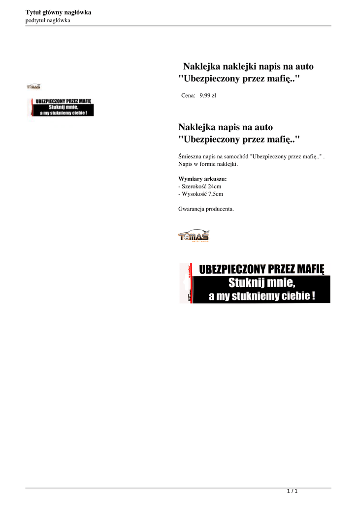 Tytuł główny nagłówka podtytuł nagłówka Naklejka naklejki napis na auto "Ubezpieczony przez mafię.." Cena: 9.99 zł Naklejka napis na auto "Ubezpieczony przez mafię.." Śmieszna napis na samochód "Ubezpieczony przez mafię.." . Napis w formie naklejki. Wymiary arkuszu: - Szerokość 24cm - Wysokość 7,5cm Gwarancja producenta. 1/1 Powered by TCPDF (www.tcpdf.org)