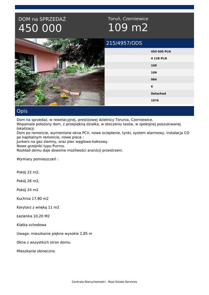 Toruń, Czerniewice DOM na SPRZEDAŻ 109 m2 450 000 215/4957/ODS 450 000 PLN 4 128 PLN 109 109 984 6 Detached 1976 Opis Dom na sprzedaż, w rewelacyjnej, prestiżowej dzielnicy Torunia, Czerniewice. Wspaniale położony dom, z przepiękną działka, w otoczeniu lasów, w spokojnej poszukiwanej lokalizacji. Dom po remoncie, wymienione okna PCV, nowe ocieplenie, tynki, system alarmowy, instalacja CO po kapitalnym remoncie, nowe piece : Junkers na gaz ziemny, oraz piec węglowo-koksowy. Nowe grzejniki typu Purmo. Rozkład domu daje dowolne możliwości aranżcji przestrzeni. Wymiary pomieszczeń : Pokój 22 m2, Pokój 26 m2, Pokój 24 m2 Kuchnia 17,90 m2 Korytarz z wnęką 11 m2 Łazienka 10,20 M2 Klatka schodowa Uwaga: mieszkanie piękne wysokie 2,85 m Okna z wszystkich stron domu. Mieszkanie słoneczne. Centrala Nieruchomości - Real Estate Services Wysoka piwnica ( 3 pokoje z kuchnią i łazienką) Odrębne mieszkanie rozkładowe. Pomieszczenia wysokie 2,67 m Pokój 26 m2 Pokój 22 m2 Pokój 14,50 m2 z korytarzem 5,50 m2 Kuchnia (do remontu) 17,90 m2 Ubikacja 1,5 m2 Korytarz 8,50 m2 Garaż 3,0 m x 5,4 m Garaż wyposażony w kanał naprawczy. Na tyłach działki znajduje się domek gościnny. Dodam iż ogród wraz zielenią działa kojąco na zmysły, pozwalając się odprężyć i uciec o codziennego zgiełku i hałasu miasta. Gorąco polecam i zachęcam do prezentacji. Centrala Nieruchomości: ZAPEWNIAMY BEZPŁATNE I PROFESJONALNE DORADZTWO ZARÓWNO W ZAKRESIE NIERUCHOMOŚCI JAK I POZYSKIWANIU POD NIE KREDYTÓW HIPOTECZNYCH Powyższe informacje zostały sporządzone na podstawie oświadczeń właścicieli i nie są ofertą w rozumieniu przepisów Kodeksu Cywilnego. Mają one jedynie charakter informacyjny. Większość naszych klientów pochodzi z polecenia - ZAUFAJ NAM I TY I NIE CZEKAJ, AŻ KTOŚ CIĘ WYPRZEDZI! Zadzwoń i umów się na prezentację ! Nr licencji pośrednika odpowiedzialnego za wykonanie umowy pośrednictwa 14260. zobacz inne nasze oferty na www.centralanieruchomosci.pl facebook.com/Centrala.N Karolina Rutkowska tel. (+48) 663 899 715 email: [email protected] Centrala Nieruchomości - Real Estate Services Powered by TCPDF (www.tcpdf.org)