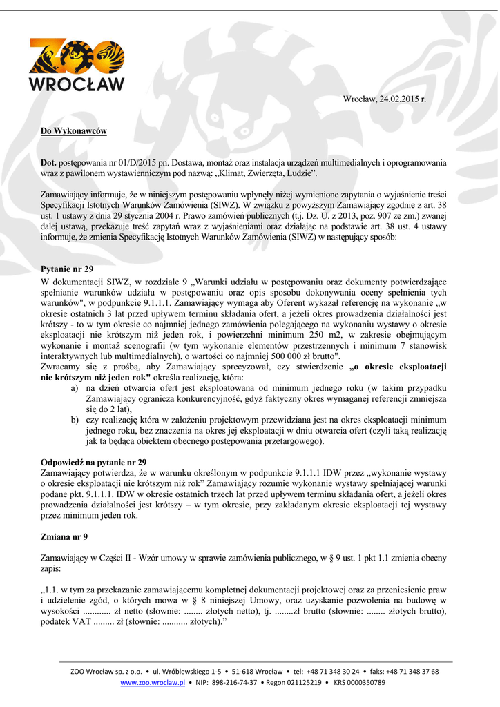 Wrocław, 24.02.2015 r. Do Wykonawców Dot. postępowania nr 01/D/2015 pn. Dostawa, montaż oraz instalacja urządzeń multimedialnych i oprogramowania wraz z pawilonem wystawienniczym pod nazwą: „Klimat, Zwierzęta, Ludzie”. Zamawiający informuje, że w niniejszym postępowaniu wpłynęły niżej wymienione zapytania o wyjaśnienie treści Specyfikacji Istotnych Warunków Zamówienia (SIWZ). W związku z powyższym Zamawiający zgodnie z art. 38 ust. 1 ustawy z dnia 29 stycznia 2004 r. Prawo zamówień publicznych (t.j. Dz. U. z 2013, poz. 907 ze zm.) zwanej dalej ustawą, przekazuje treść zapytań wraz z wyjaśnieniami oraz działając na podstawie art. 38 ust. 4 ustawy informuje, że zmienia Specyfikację Istotnych Warunków Zamówienia (SIWZ) w następujący sposób: Pytanie nr 29 W dokumentacji SIWZ, w rozdziale 9 „Warunki udziału w postępowaniu oraz dokumenty potwierdzające spełnianie warunków udziału w postępowaniu oraz opis sposobu dokonywania oceny spełnienia tych warunków", w podpunkcie 9.1.1.1. Zamawiający wymaga aby Oferent wykazał referencję na wykonanie „w okresie ostatnich 3 lat przed upływem terminu składania ofert, a jeżeli okres prowadzenia działalności jest krótszy - to w tym okresie co najmniej jednego zamówienia polegającego na wykonaniu wystawy o okresie eksploatacji nie krótszym niż jeden rok, i powierzchni minimum 250 m2, w zakresie obejmującym wykonanie i montaż scenografii (w tym wykonanie elementów przestrzennych i minimum 7 stanowisk interaktywnych lub multimedialnych), o wartości co najmniej 500 000 zł brutto". Zwracamy się z prośbą, aby Zamawiający sprecyzował, czy stwierdzenie „o okresie eksploatacji nie krótszym niż jeden rok" określa realizację, która: a) na dzień otwarcia ofert jest eksploatowana od minimum jednego roku (w takim przypadku Zamawiający ogranicza konkurencyjność, gdyż faktyczny okres wymaganej referencji zmniejsza się do 2 lat), b) czy realizację która w założeniu projektowym przewidziana jest na okres eksploatacji minimum jednego roku, bez znaczenia na okres jej eksploatacji w dniu otwarcia ofert (czyli taką realizację jak ta będąca obiektem obecnego postępowania przetargowego). Odpowiedź na pytanie nr 29 Zamawiający potwierdza, że w warunku określonym w podpunkcie 9.1.1.1 IDW przez „wykonanie wystawy o okresie eksploatacji nie krótszym niż rok” Zamawiający rozumie wykonanie wystawy spełniającej warunki podane pkt. 9.1.1.1. IDW w okresie ostatnich trzech lat przed upływem terminu składania ofert, a jeżeli okres prowadzenia działalności jest krótszy – w tym okresie, przy zakładanym okresie eksploatacji tej wystawy przez minimum jeden rok. Zmiana nr 9 Zamawiający w Części II - Wzór umowy w sprawie zamówienia publicznego, w § 9 ust. 1 pkt 1.1 zmienia obecny zapis: „1.1. w tym za przekazanie zamawiającemu kompletnej dokumentacji projektowej oraz za przeniesienie praw i udzielenie zgód, o których mowa w § 8 niniejszej Umowy, oraz uzyskanie pozwolenia na budowę w wysokości ............ zł netto (słownie: ........ złotych netto), tj. ........zł brutto (słownie: ........ złotych brutto), podatek VAT ......... zł (słownie: ........... złotych).” ZOO Wrocław sp. z o.o. • ul. Wróblewskiego 1-5 • 51-618 Wrocław • tel: +48 71 348 30 24 • faks: +48 71 348 37 68 www.zoo.wroclaw.pl • NIP: 898-216-74-37 • Regon 021125219 • KRS 0000350789 na następujący: „1.1. w tym za przekazanie zamawiającemu kompletnej dokumentacji projektowej oraz za przeniesienie praw i udzielenie zgód, o których mowa w § 8 niniejszej Umowy, oraz złożenie wniosku o pozwolenie na budowę w wysokości…………….zł netto (słownie: ..................... złotych netto), tj ............................ zł brutto (słownie: ........................................... złotych brutto), podatek VAT................................... zł (słownie:....................................... złotych.”. Zmiana nr 10 W Części III - w Programie Funkcjonalno – Użytkowym w rozdziale 8 „Specyfikacja minimalnych wymagań urządzeń multimedialnych” skreśla się zawartość (tabele urządzeń multimedialnych) i zastępuje następującą treścią: Typ zestawu głośnikowego Tryb pracy Zakres częstotliwości Odczepy transformatora: - 70V - 100V Efektywność (1W/1m) Dyspersja Częstotliwość podziału zwrotnicy Złącza Waga ZESTAW GŁOŚNIKOWY PODWIESZANY (16 sztuk) sufitowy głośnik koaksjalny, szerokopasmowy, dwudrożny 70V/100V min. 83 Hz – 19 kHz (±5dB) 60W, 30W, 15W, 7.5W 60W, 30W, 15W min. 93dB (125 Hz – 12.5 kHz 1/3 oktawy) mieszcząca się w zakresie 120o-130o stożkowo (500 Hz – 6 kHz) 1.2 kHz dwu-stykowe typu Phoenix max. 5.5 kg WZMACNIACZ AUDIO (2 sztuki) Ilość niezależnych kanałów 2 Moc min. 120W (na kanał, 70/100V) Charakterystyka częstotliwościowa min. 20 Hz – 20 kHz (±0.5 dB) Czułość wejścia 1.4VRMS Współczynnik zawartości harmonicznych (THD) < 0.6% (20 Hz – 20 kHz) Współczynnik sygnału do szumu > 99 dB Impedancja wejścia min. 20 kΩ Maksymalny poziom wejściowy max. +23 dBu Regulacja tonalna niezależne potencjometry dla każdego kanału zakres dla tonów niskich: min. ±9 dB (100Hz) zakres dla tonów wysokich: min. ±9 dB (100Hz) Zasilanie 100-240V, 50/60 Hz Minimalna impedancja obciążenia min. 40 Ω (70V) min. 80 Ω (100V) Wymagane montaż w szafie sprzętowej typu RACK 19” CYFROWA MATRYCA AUDIO (1 sztuka) Ilość wejść sygnałowych min. 4 (2 wejścia liniowe, 2 wejścia mikrofonowo-liniowe) Ilość wyjść sygnałowych min. 4 (symetryczne) Czułość wejścia liniowego regulowana w zakresie min. 0 dBV - -5 dBV Złącze wejścia liniowego RCA (F) Czułość wejścia mikrofonowego regulowana w zakresie min. -19 dBV - -48 dBV Przetwornik A/D i D/A 24bit/48kHz Charakterystyka częstotliwościowa min. 12 Hz – 19 kHz (+0 dB/-0.5 dB) Strona 2 Współczynnik zawartości harmonicznych (THD) Separac