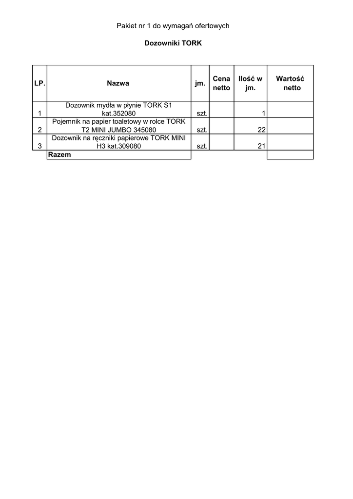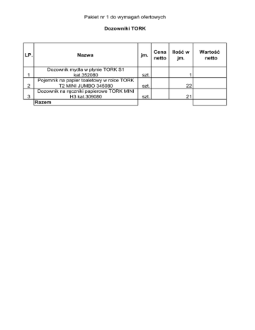 Pakiet nr 1 do wymagań ofertowych Dozowniki TORK LP. Nazwa Dozownik mydła w płynie TORK S1 kat.352080 Pojemnik na papier toaletowy w rolce TORK 2 T2 MINI JUMBO 345080 Dozownik na ręczniki papierowe TORK MINI H3 kat.309080 3 Razem 1 jm. Cena netto Ilość w jm. szt. 1 szt. 22 szt. 21 Wartość netto